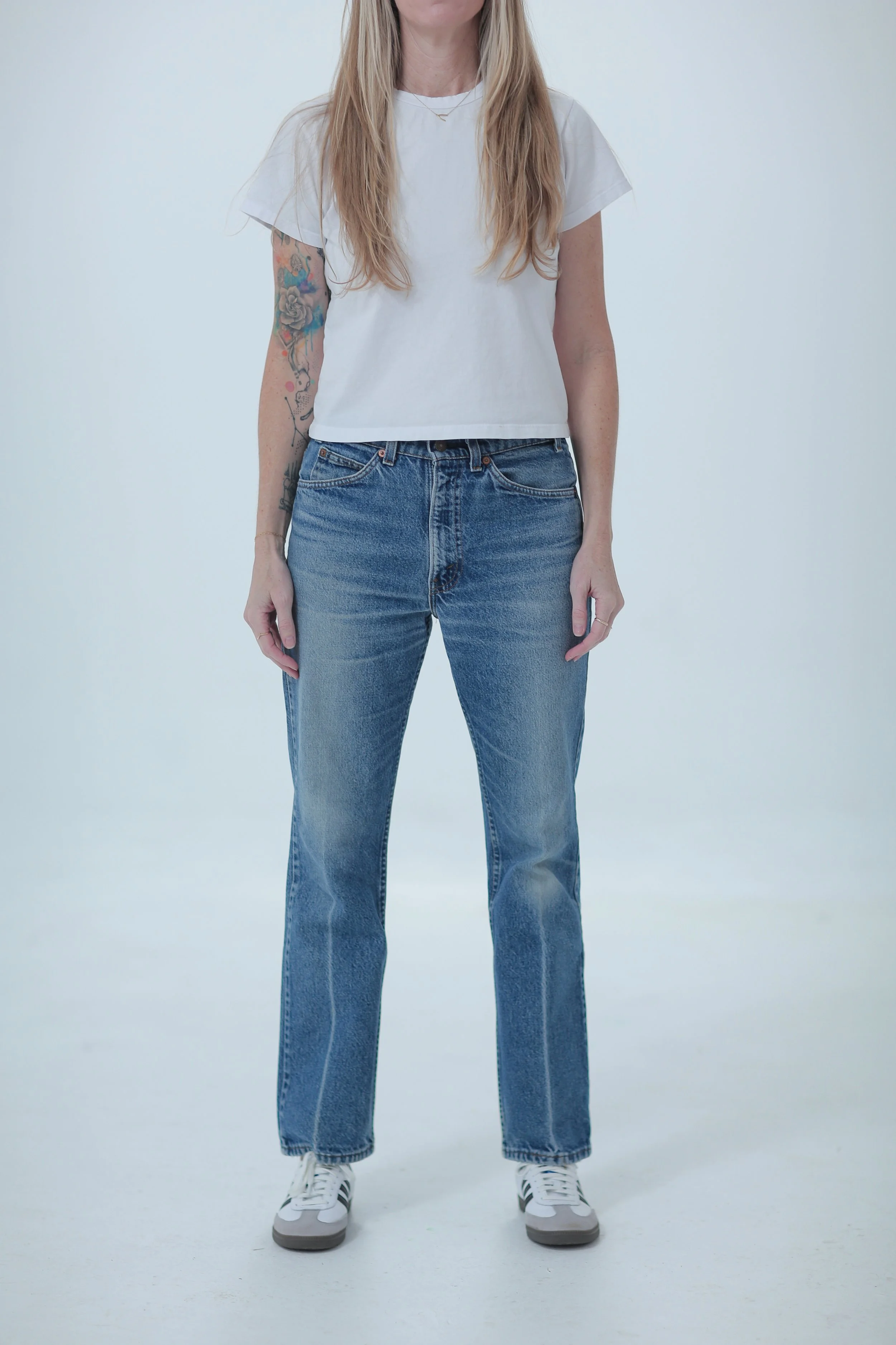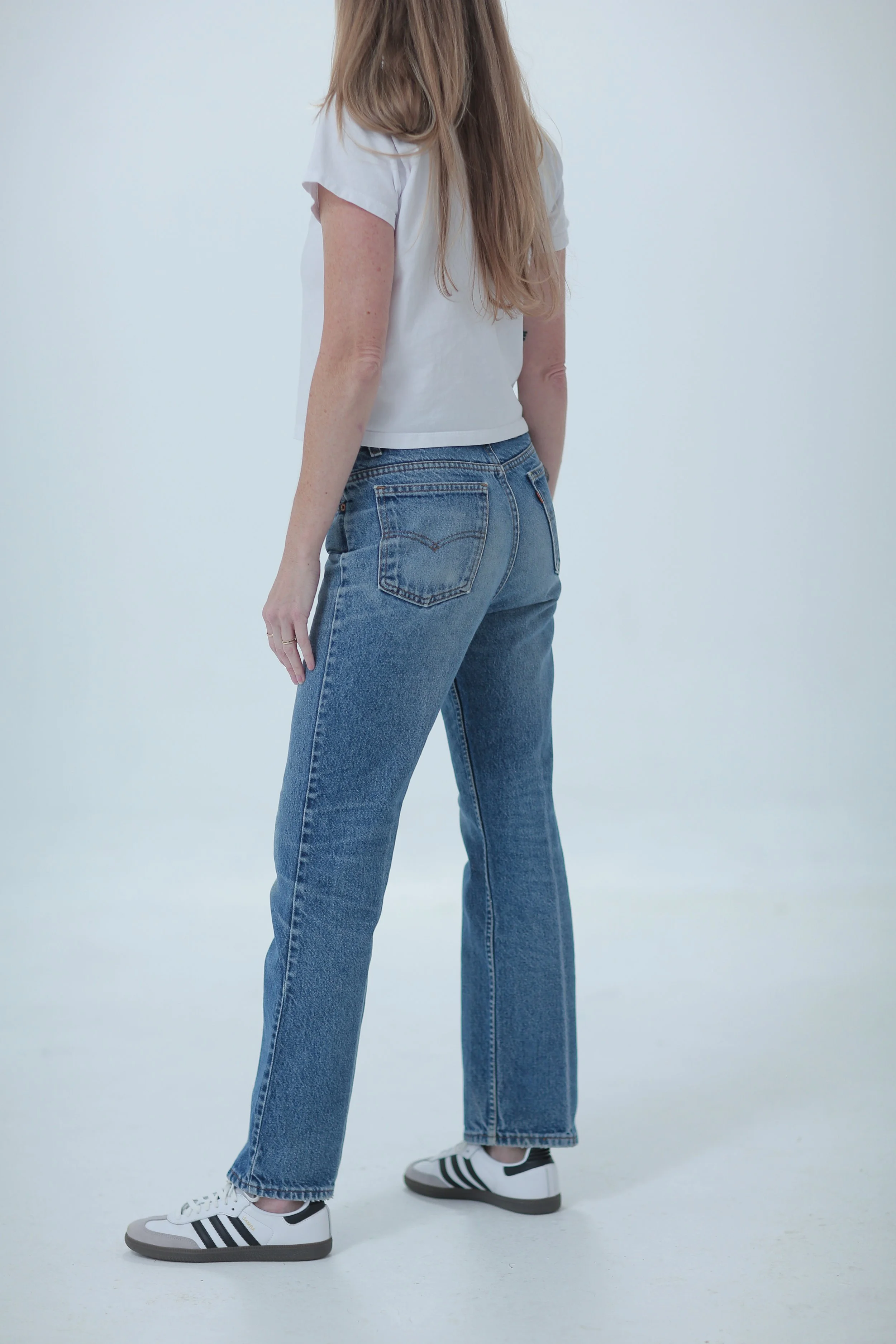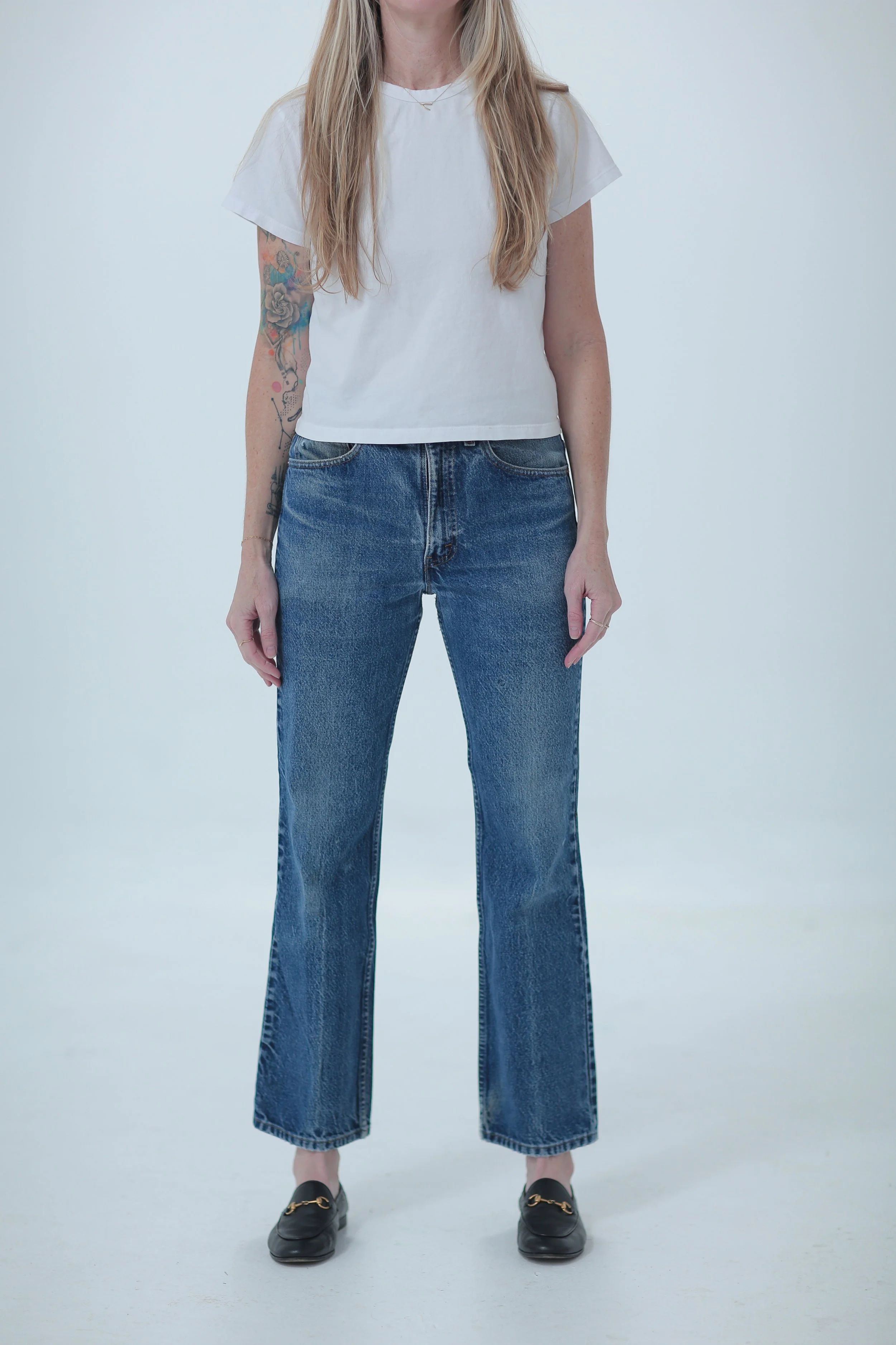 First introduced in 1969 as “Saddleman” jeans, 517s were specifically made to fit over Western boots. They are considered a “boot cut” and have a subtle flare from the knee down. Depending on the era of your 517, it can be high waist or more of a mid-rise. The flare on the 517 varies throughout the decades, with the flare being more pronounced in the 70s and becoming more subdued by late 80s and through 2002+. But they always (IMO) are flattering as they truly elongate the leg.