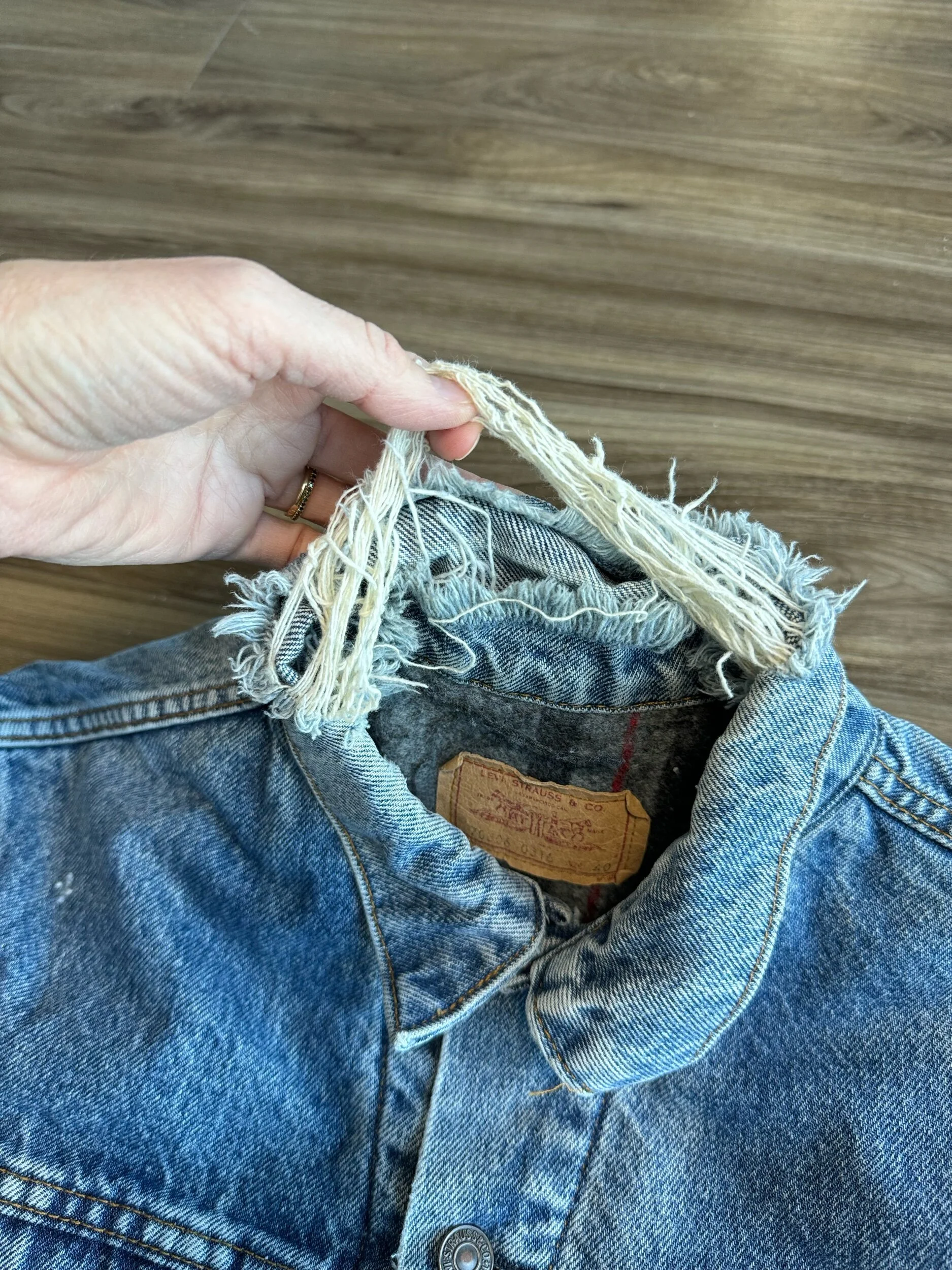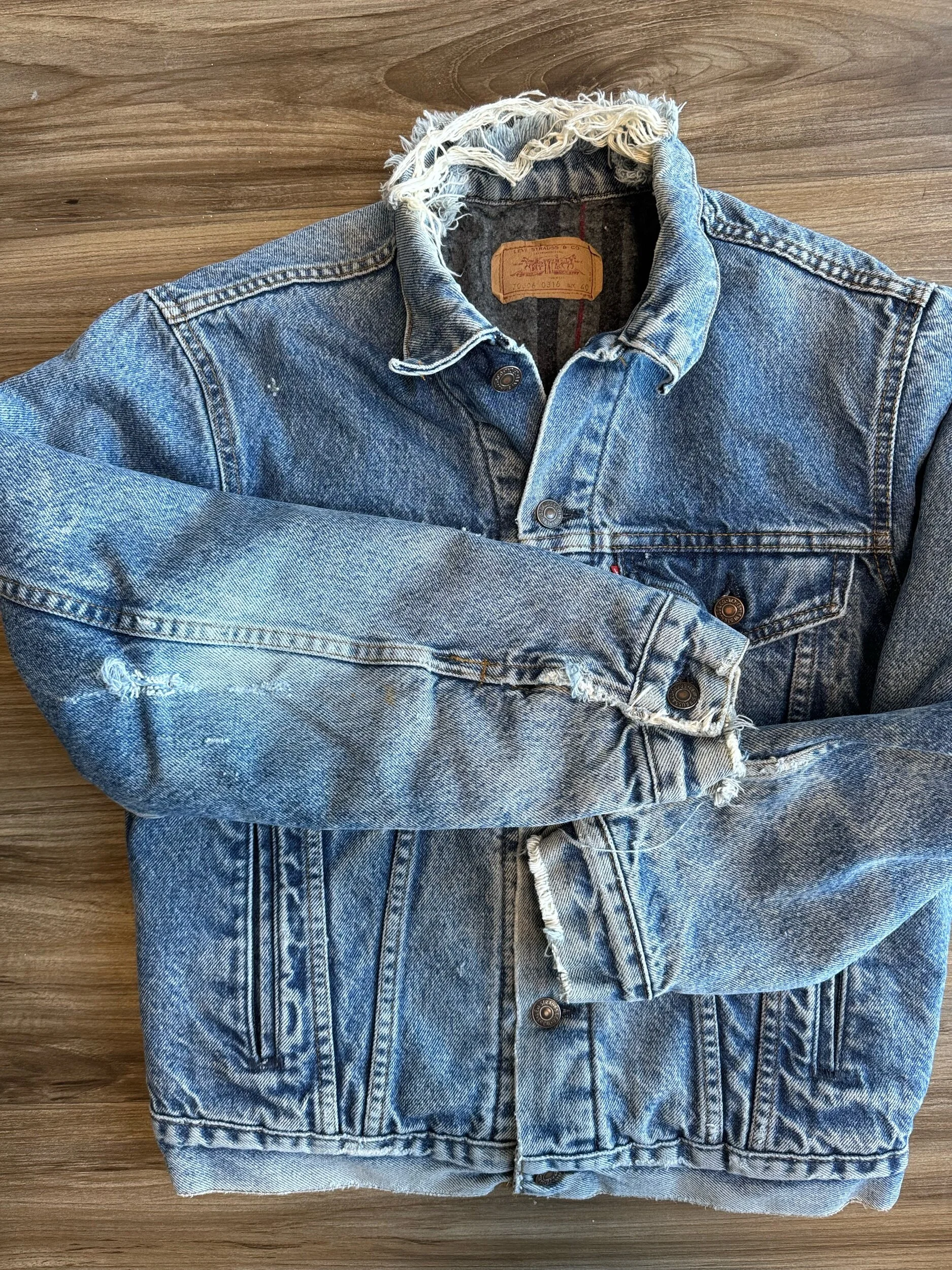 WASH: beautiful medium blue wash with epic fades and awesome neck distress. Warm blanket lining in body and arms. Wrist distress. This jacket is awesome!!!