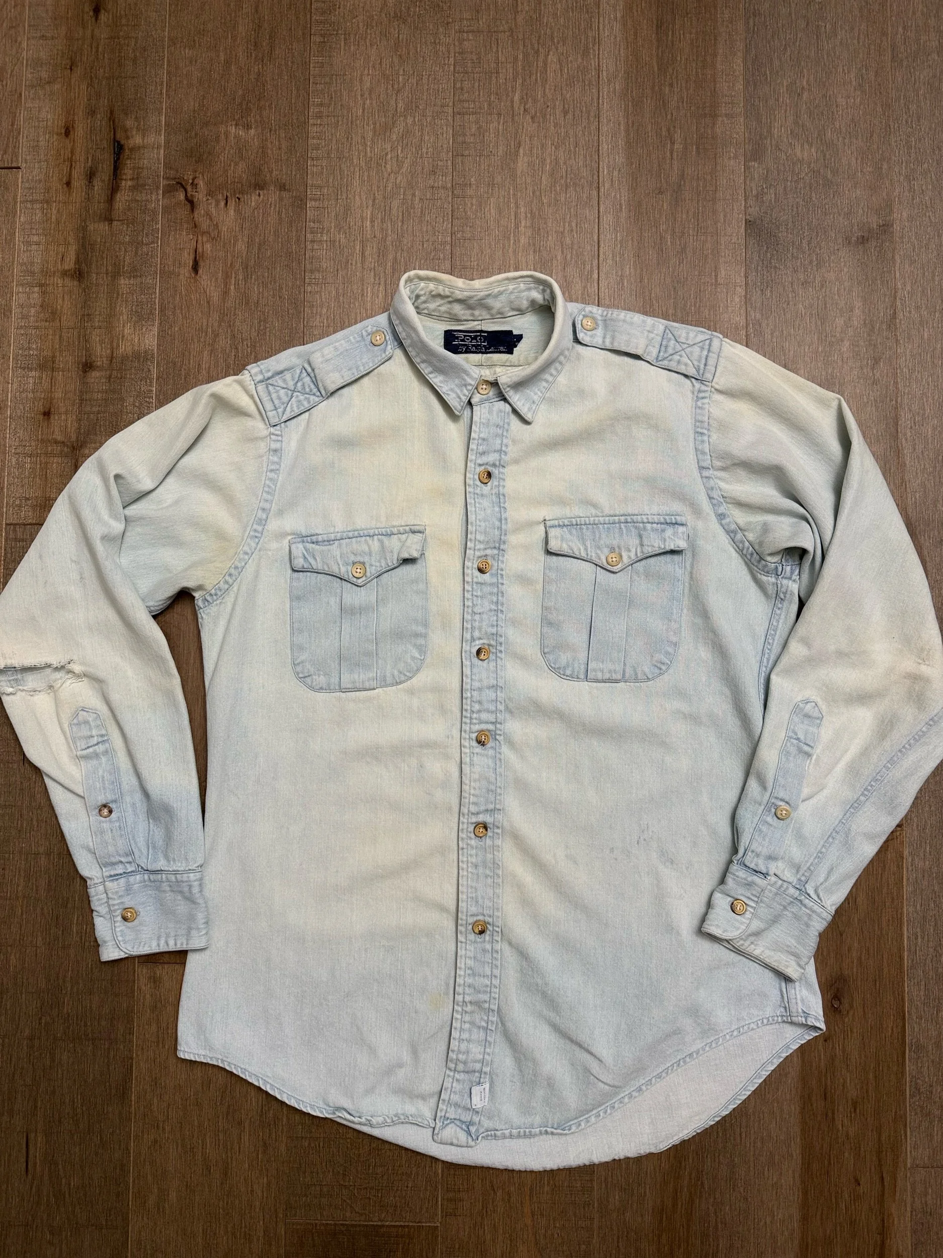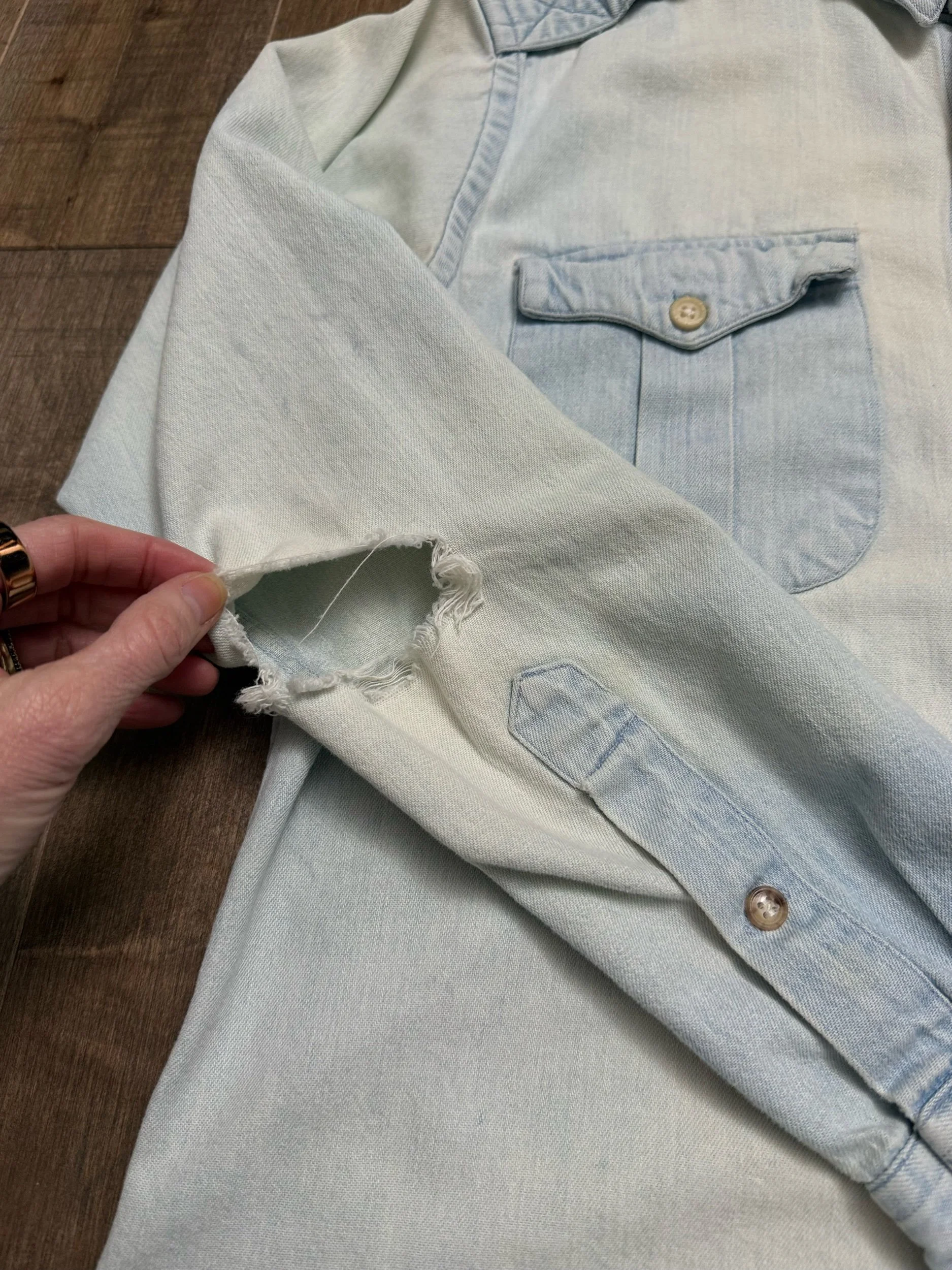 This shirt has been worn and loved! So super sun faded, sleeve distress. Some armpit yellowing. Would be a perfect summer shirt — very similar to the one I recently bought at the Doug Bihlmaier auction!