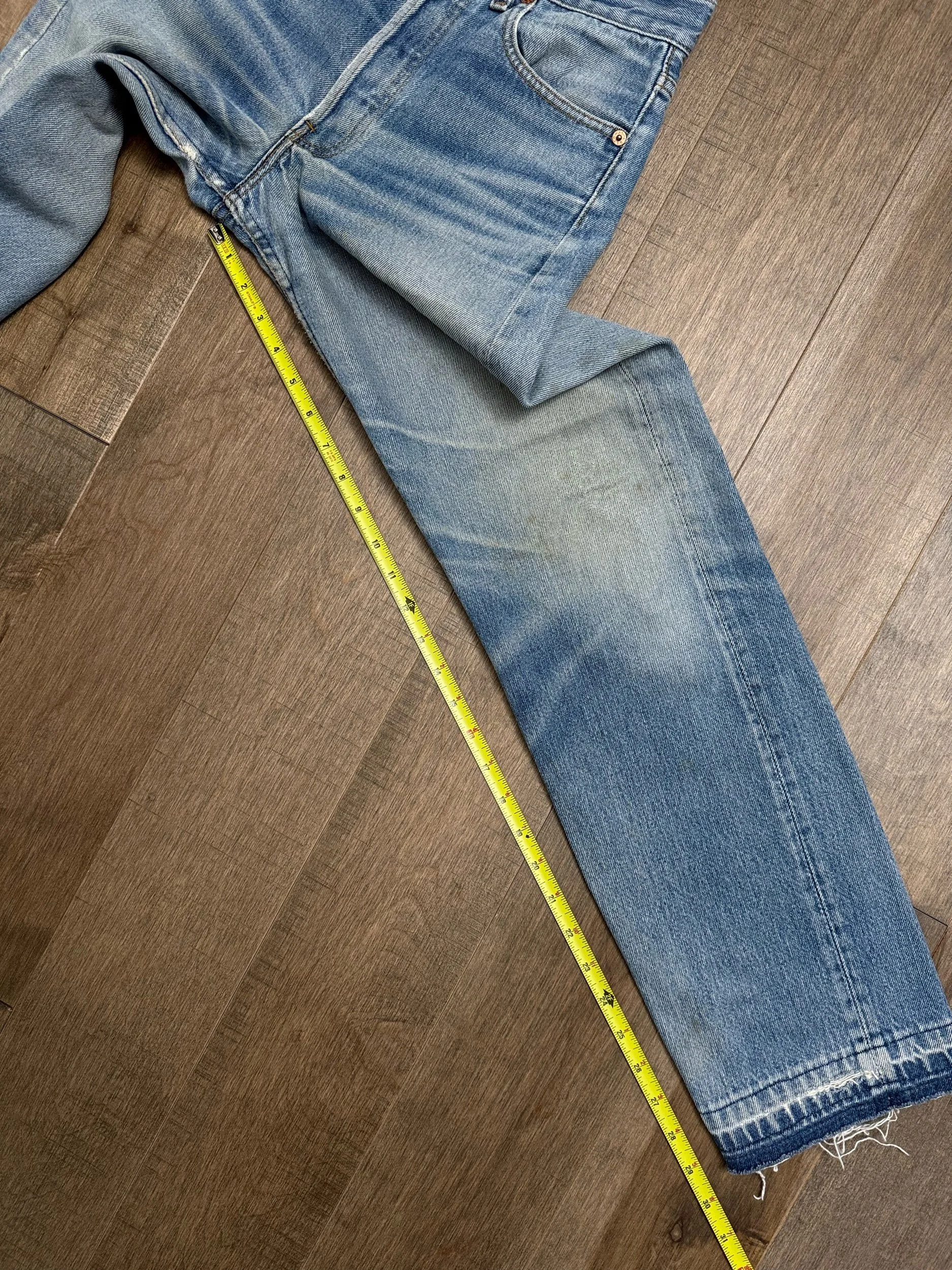 WASH: insane sun faded light medium blue wash with cool distress. Slightly dirt tinged knees. Adds character. These were clearly shortened years ago, and the hems were later released — Giving those cool fade lines at the bottom bottoms of each leg. You could have a tailor re-fold the release hem inside and reattach it. I showed how that would look in one picture. So very soft! Rip in the knee could be patched for a small fee, just respond to your order confirmation email.