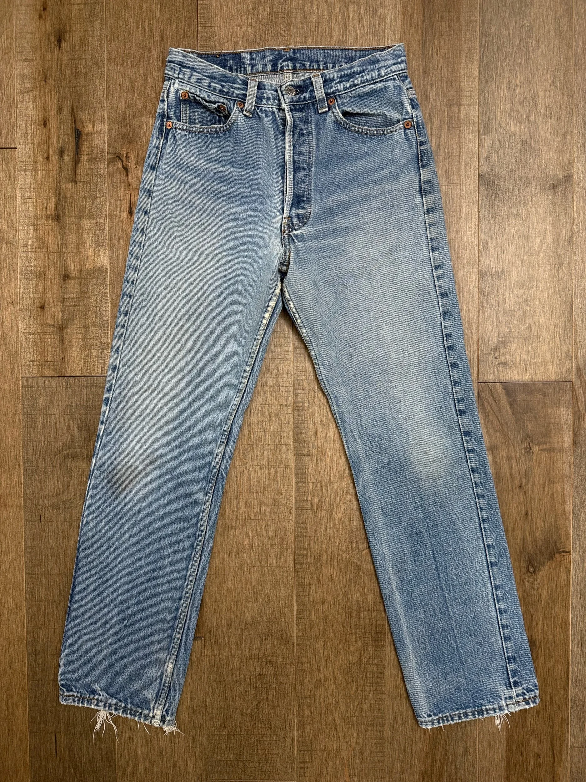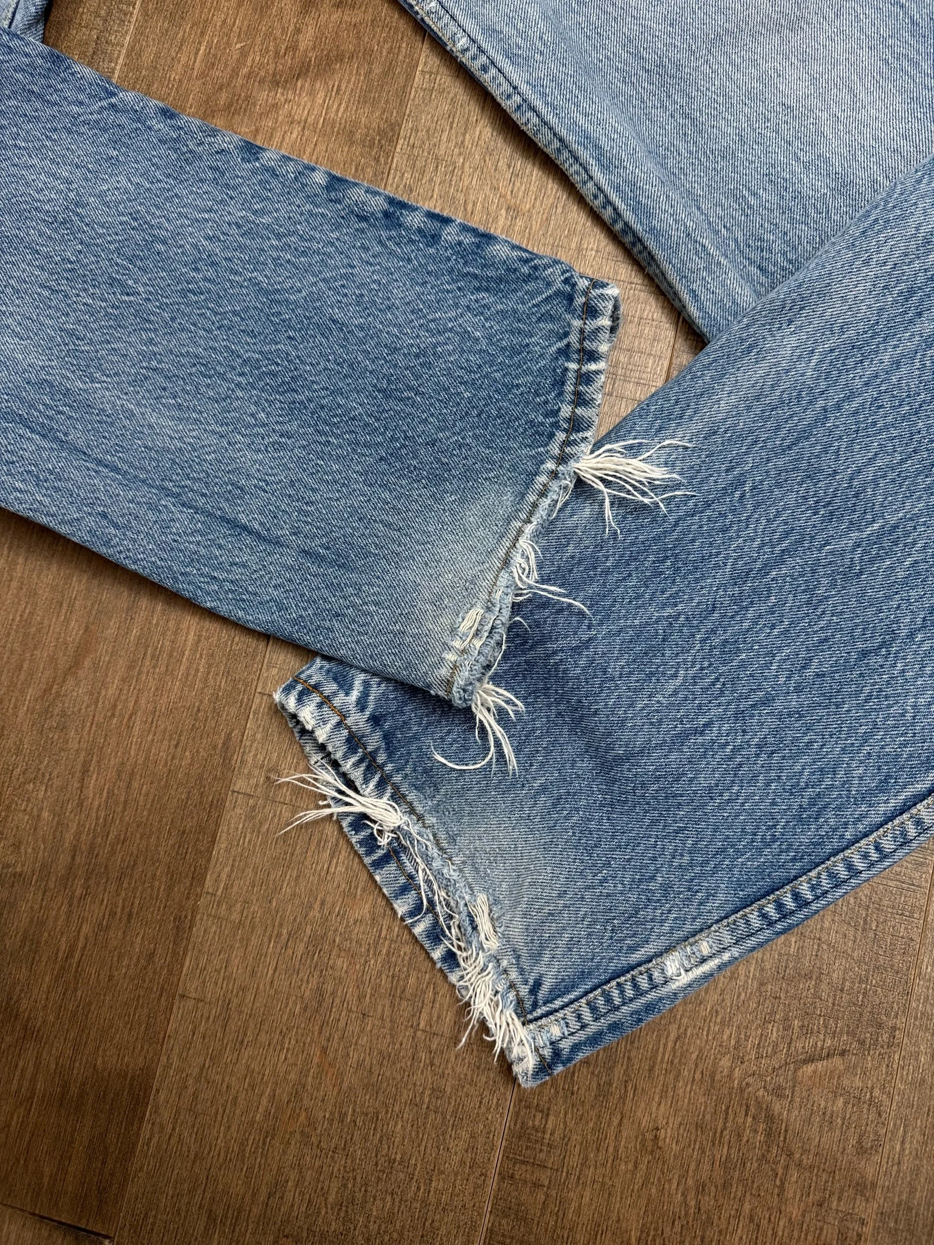 WASH: stunning light medium blue wash with perfect organic sun fades — stain near right knee. Loose loop (can be reattached)