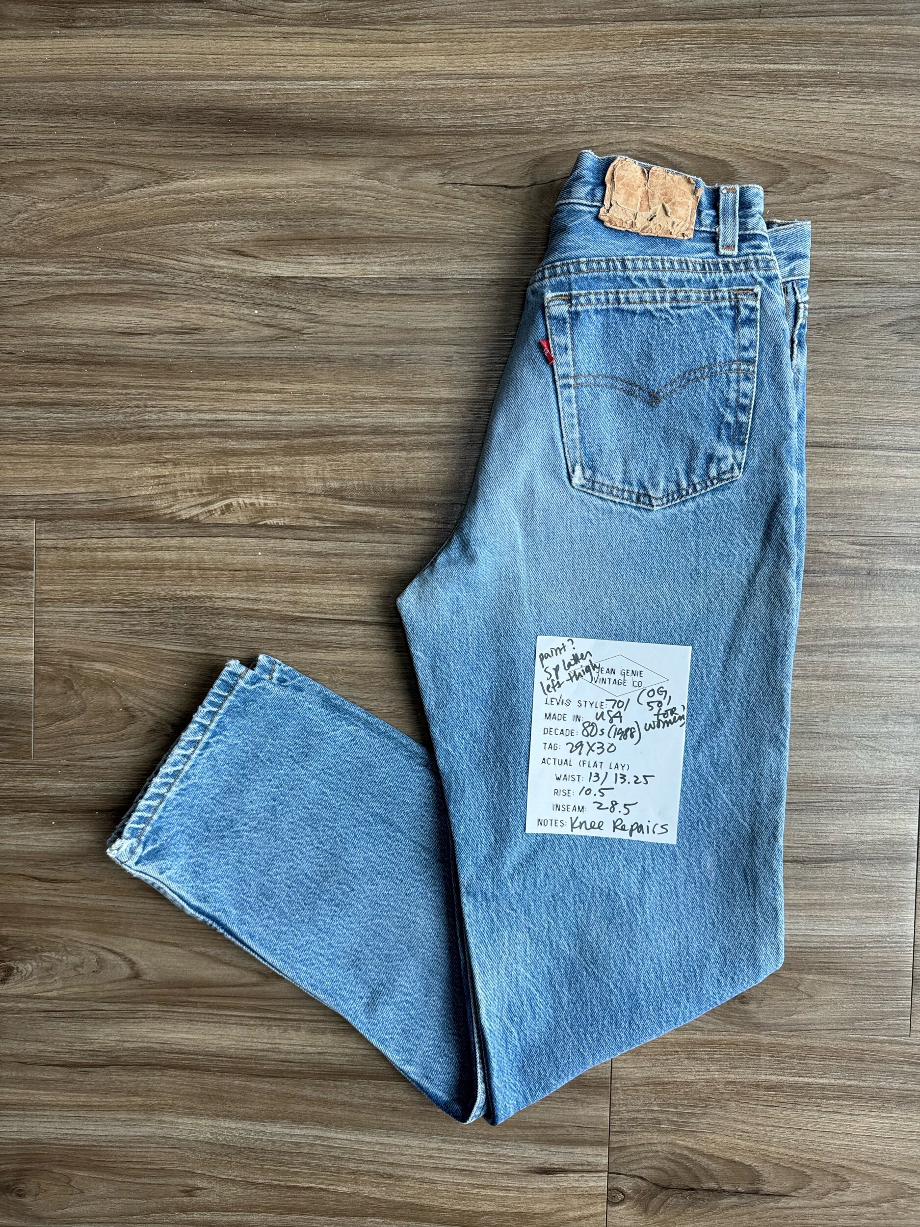 WASH: beautiful classic medium blue wash with awesome organic sun fades. Repaired (invisible mending) knees. Paint (faint) splatter left thigh.