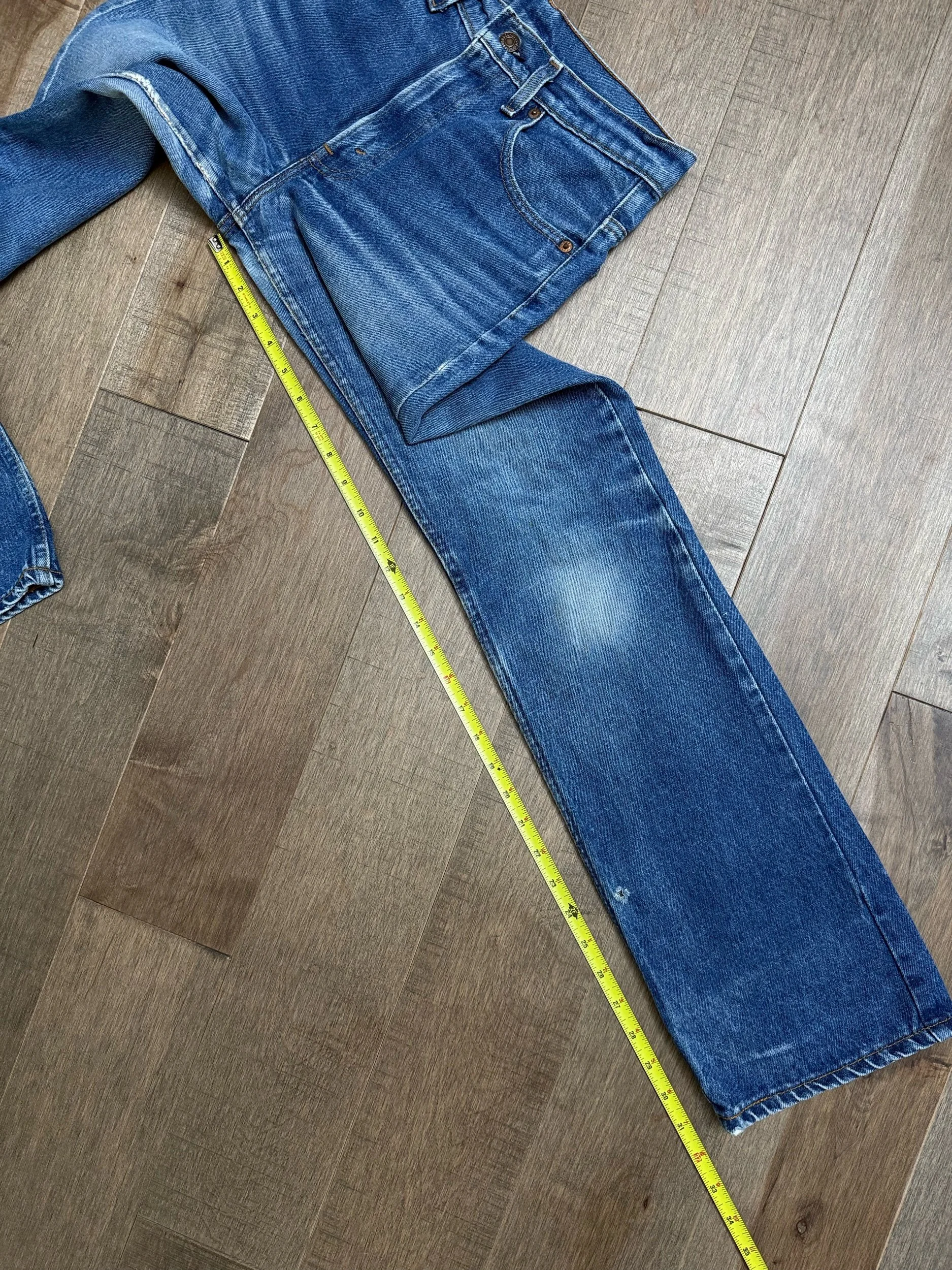 WASH: WOWOW! Insanely beautiful medium blue wash with sick organic sun fades. Little thin spot in bum (we have options if that is bothersome, just ask after purchase — reply to order confirmation)