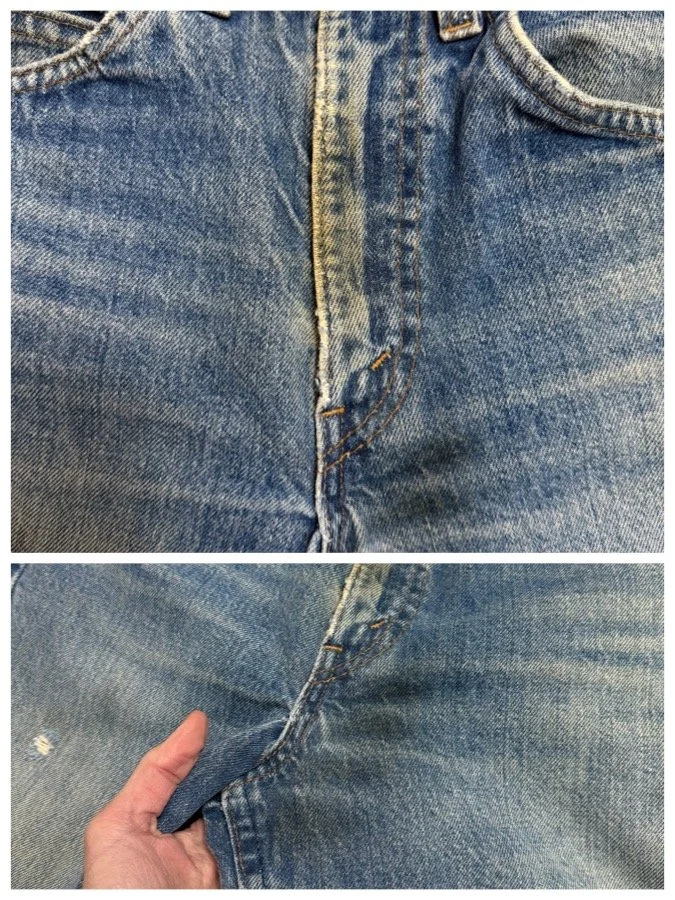 Keep in mind, vintage jeans are not new jeans. Every pair is at least 20 years old, most are older. This means they’ve been worn and likely have signs of wear - i.e. thinning areas, loose threads, signs of previous repair work, discolorations, faint (or not so faint stains), organic distressing, wear at the rivets, wear at the button holes. I do my best to describe these areas/signs of wear&tear, so please - before you buy - understand that you may receive your jeans and there will be signs of aging. Most buy vintage jeans wanting this, but if you want pristine new looking jeans, vintage likely isn’t for you. And that’s A-OK! Also note, the word “vintage” is not synonymous with super worn & faded. Vintage means over 20 years old. An item can be both vintage and still be new or like new condition.