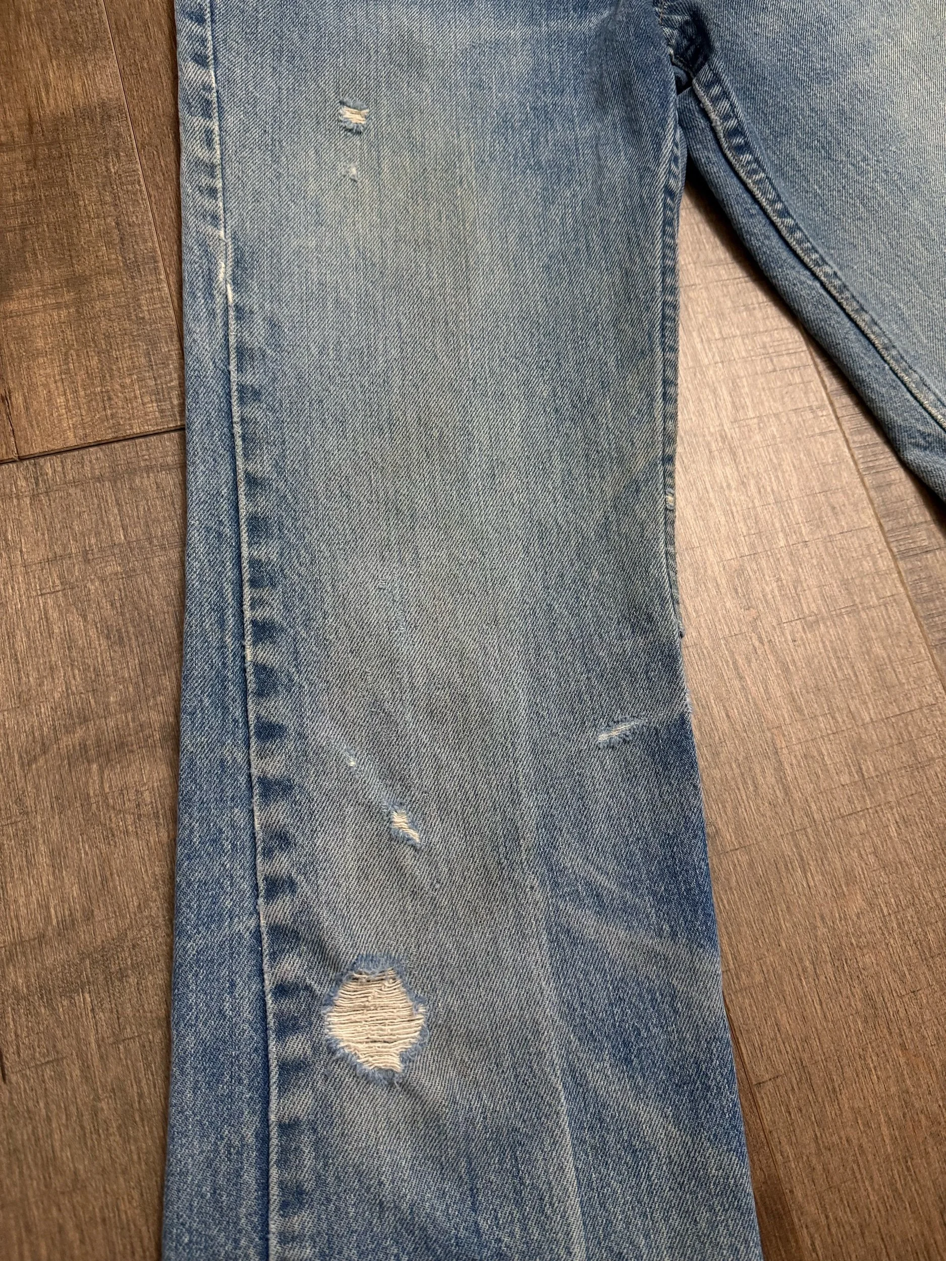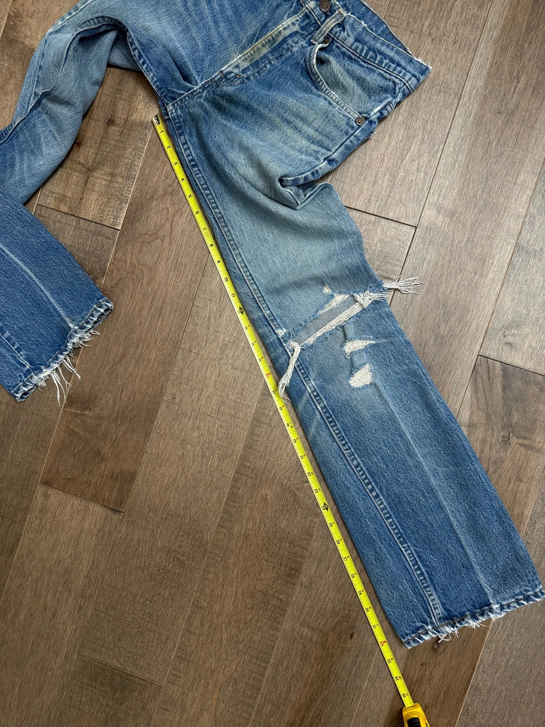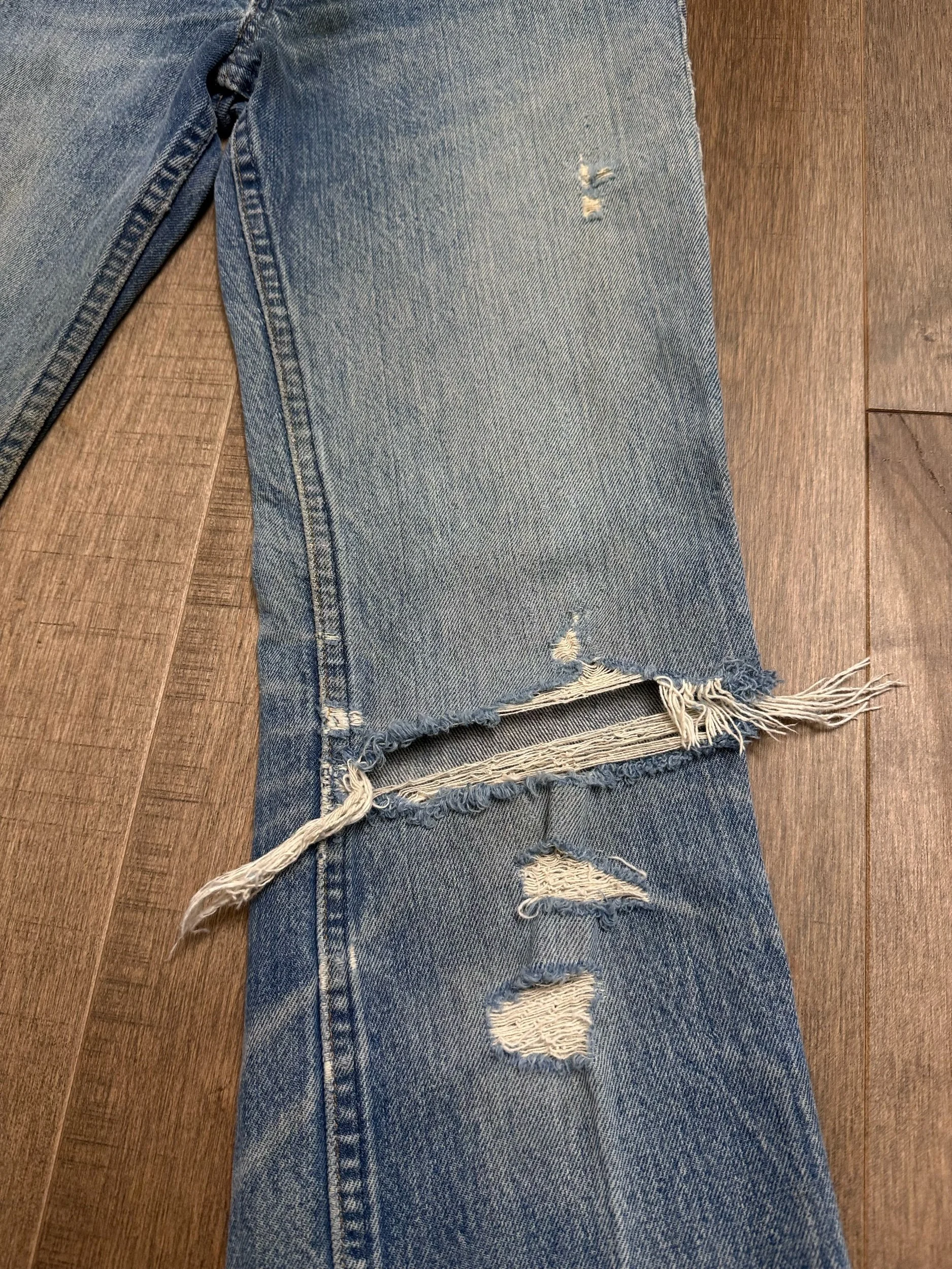 WASH: insane light medium blue wash with fire sun fades - distressed to perfection. Discoloration at the fly into the left of the fly, which looks to be like a possible color transfer from a leather saddle? These were mine, but I haven’t been able to fit in them and since I had Layla, and I feel like it’s time to stop dreaming.