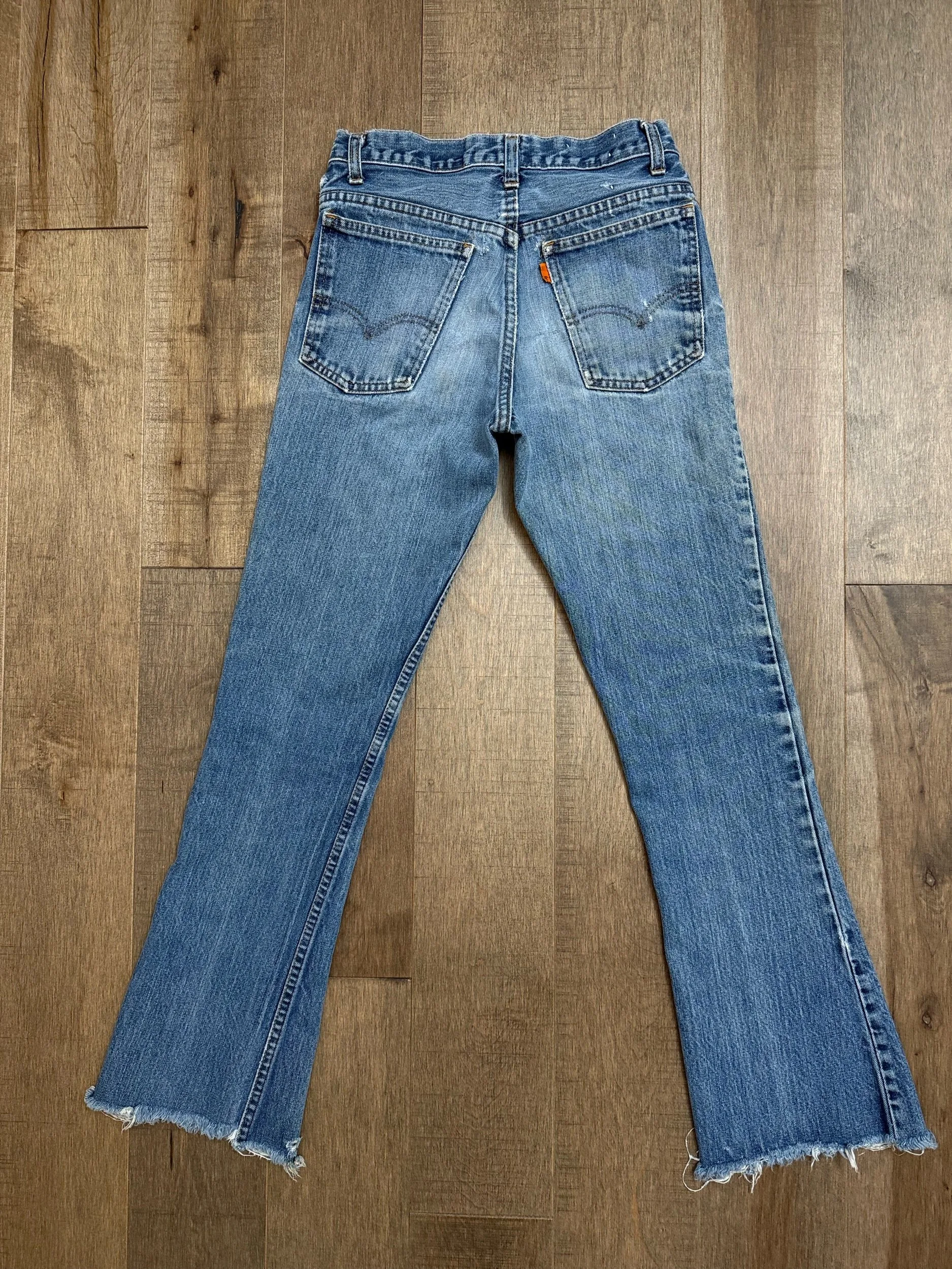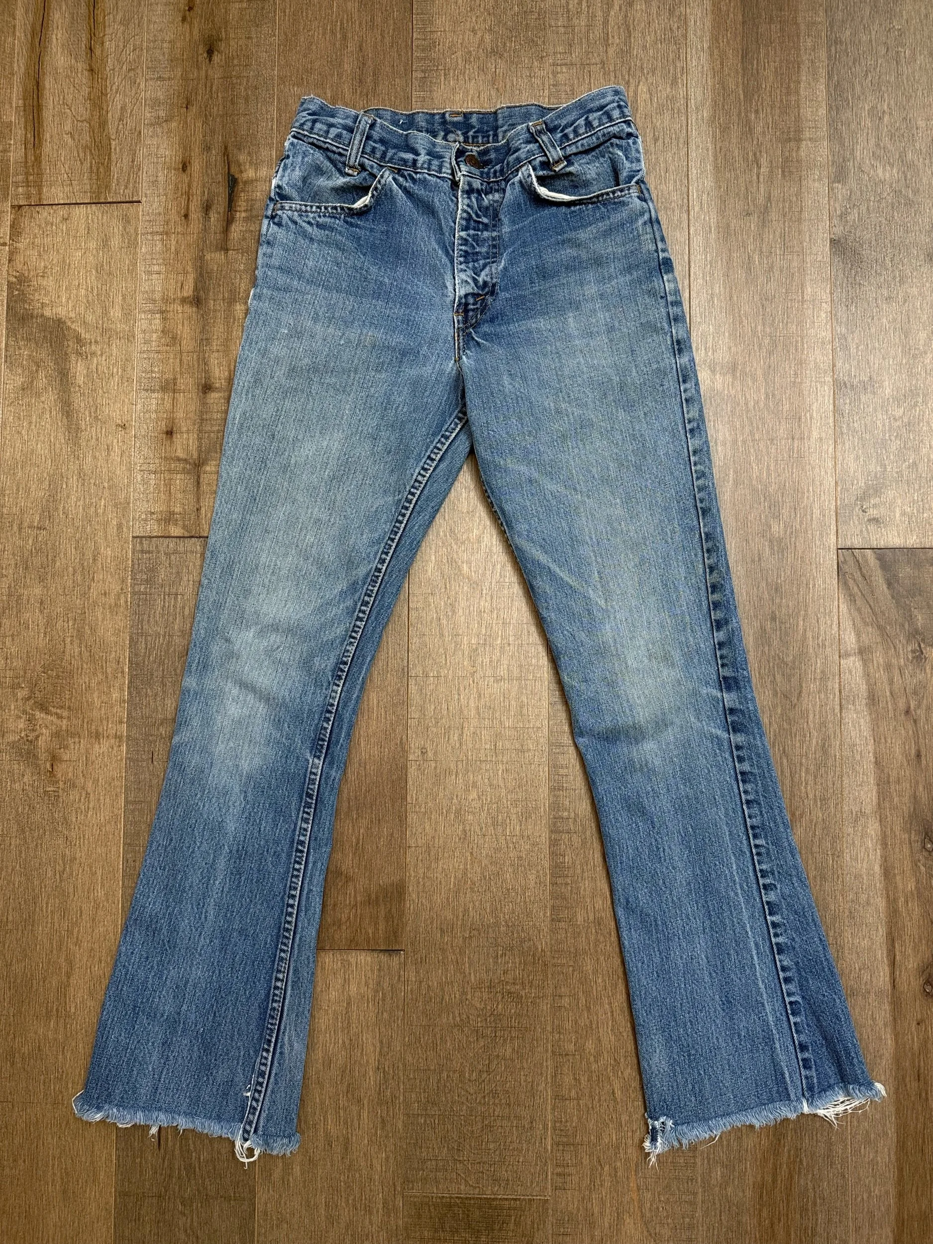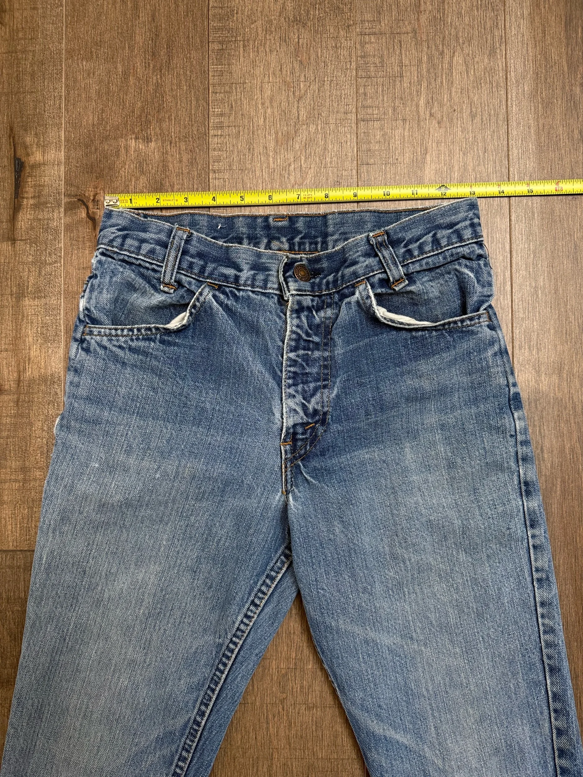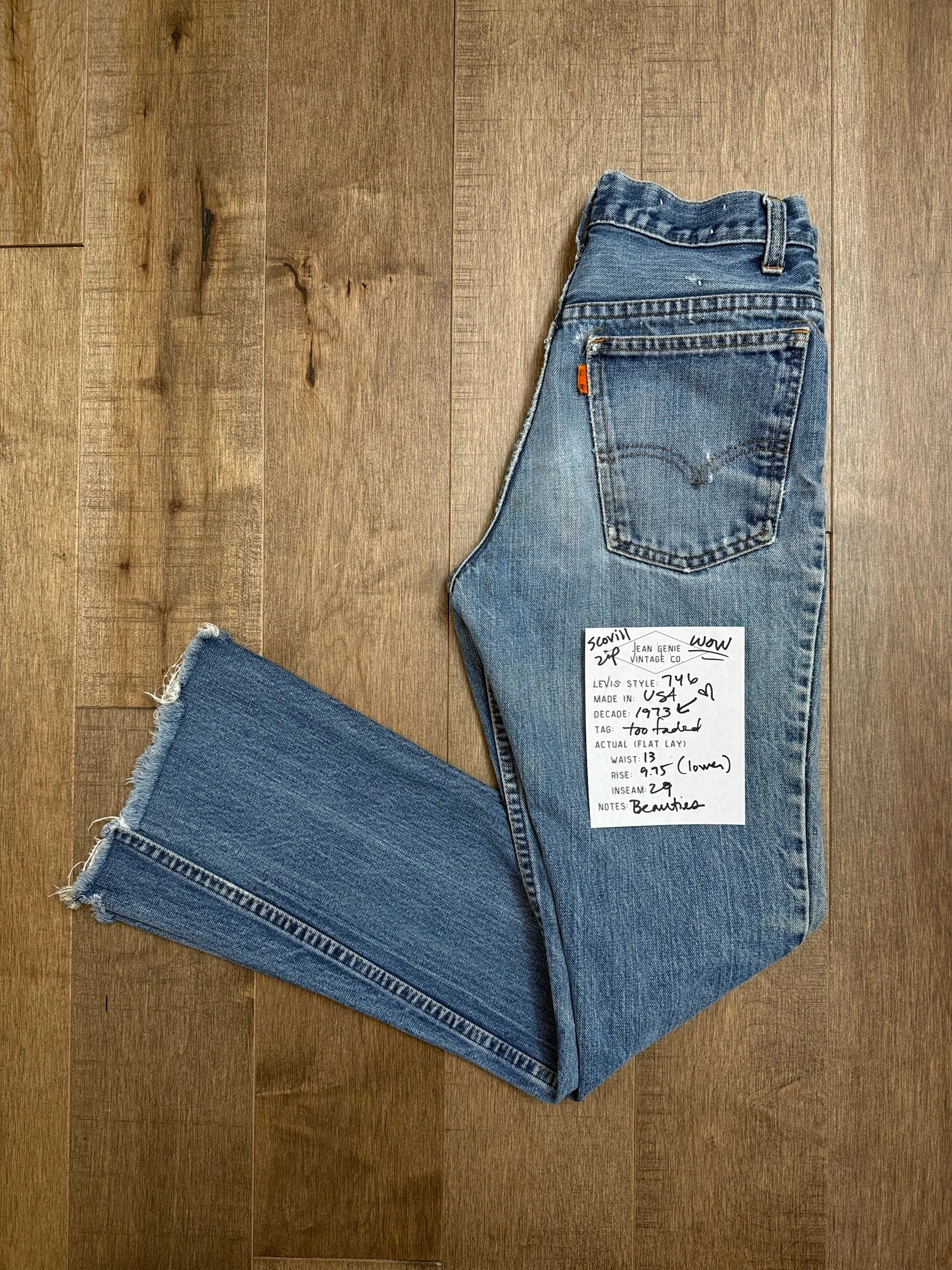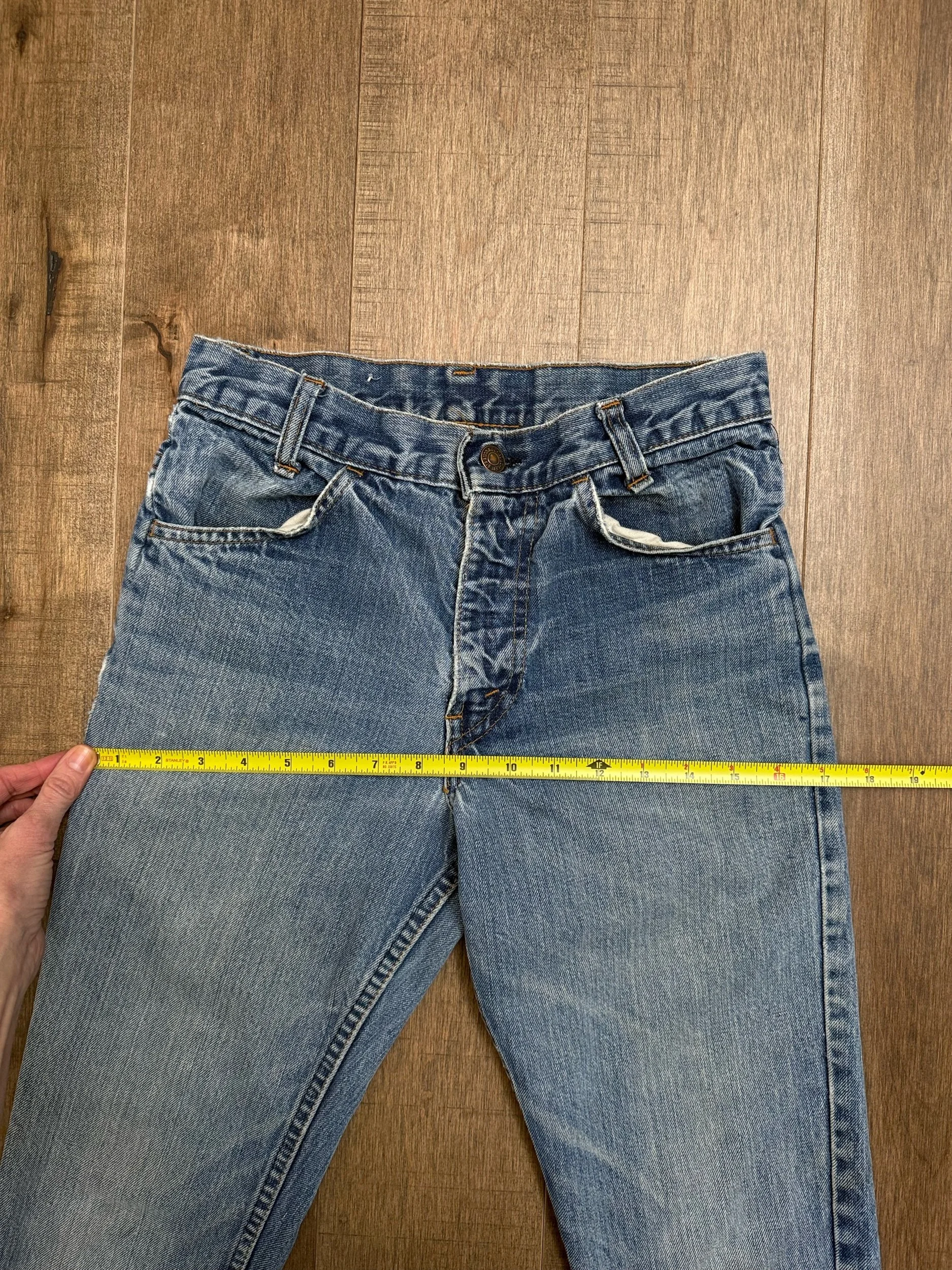 WASH: HOLY SMOKES — these are stunnning. Gorgeous lighter blue wash with epic organic sun fades!!! 1973!?! What!? These are in great shape for 50+ years old. Little thin spot at back pocket rivet. Single stitch back pocket.