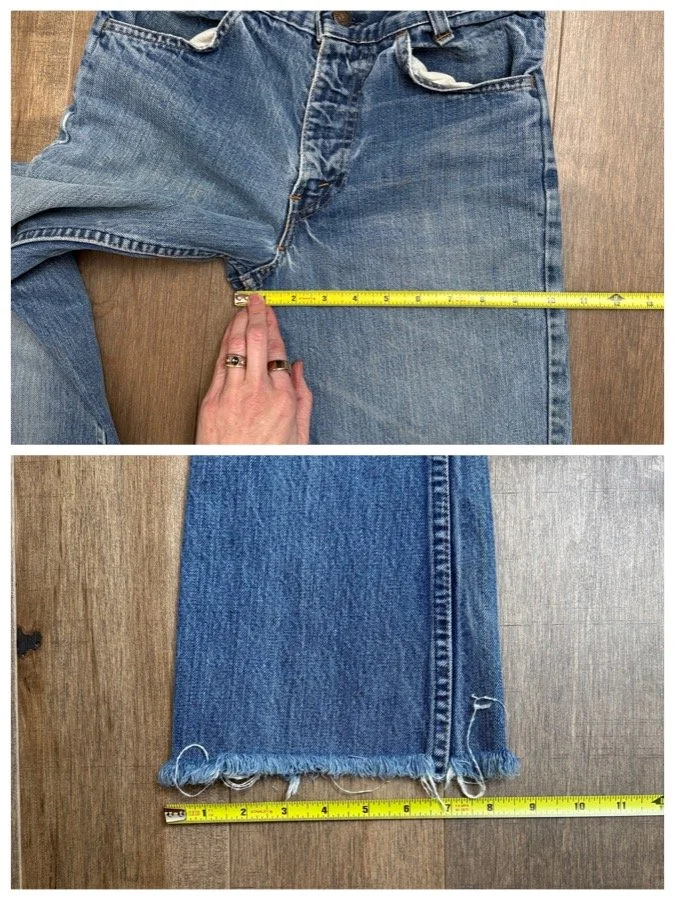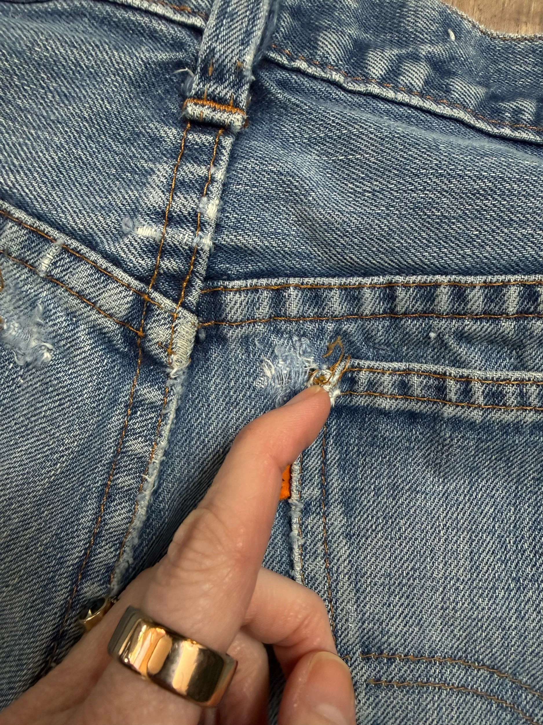 Keep in mind, vintage jeans are not new jeans. Every pair is at least 20 years old, most are older. This means they’ve been worn and likely have signs of wear - i.e. thinning areas, loose threads, signs of previous repair work, discolorations, faint (or not so faint stains), organic distressing, wear at the rivets, wear at the button holes. I do my best to describe these areas/signs of wear&tear, so please - before you buy - understand that you may receive your jeans and there will be signs of aging. Most buy vintage jeans wanting this, but if you want pristine new looking jeans, vintage likely isn’t for you. And that’s A-OK! Also note, the word “vintage” is not synonymous with super worn & faded. Vintage means over 20 years old. An item can be both vintage and still be new or like new condition.