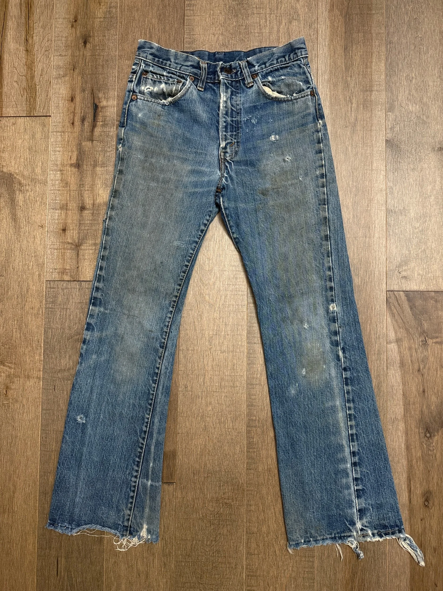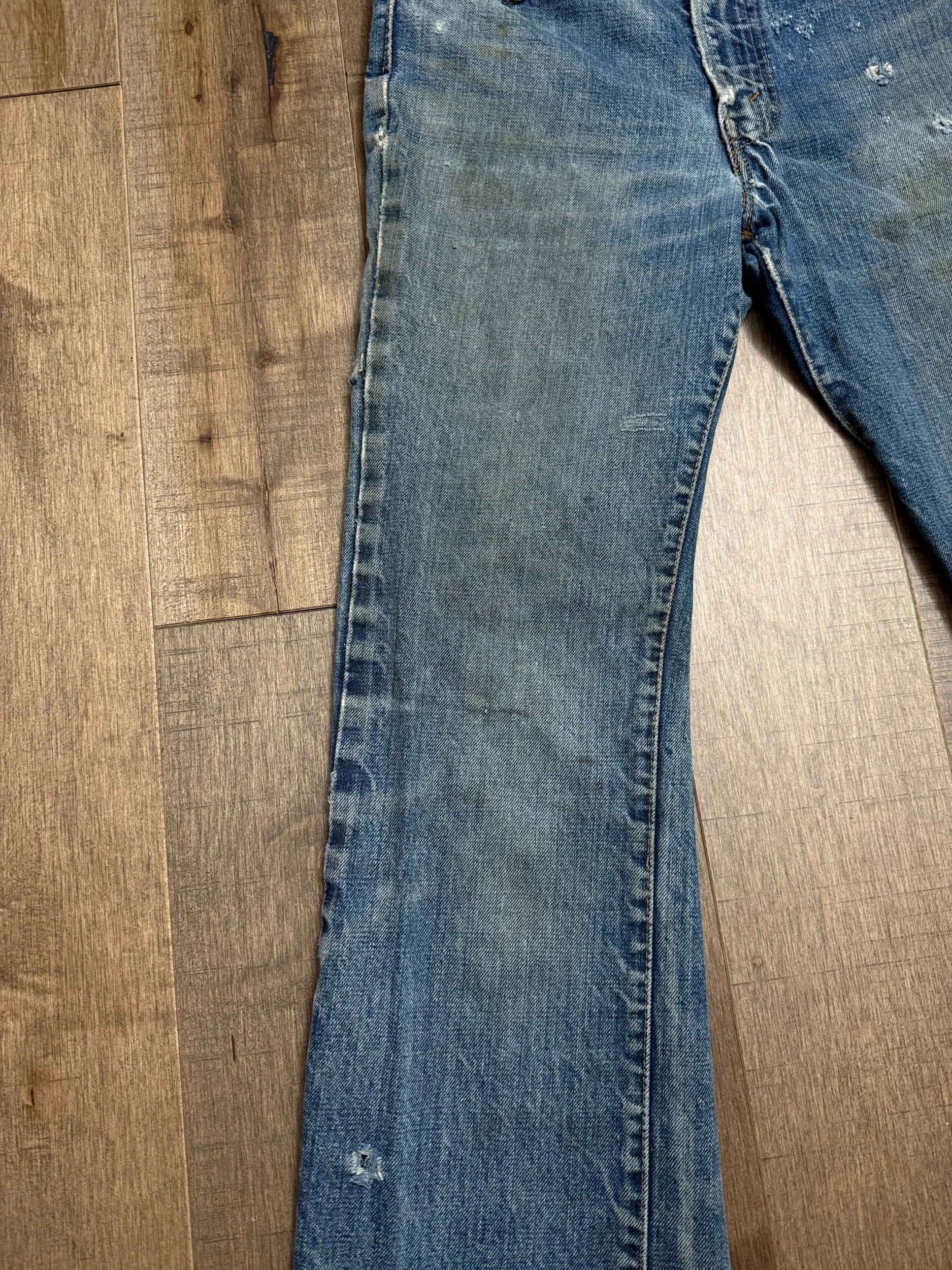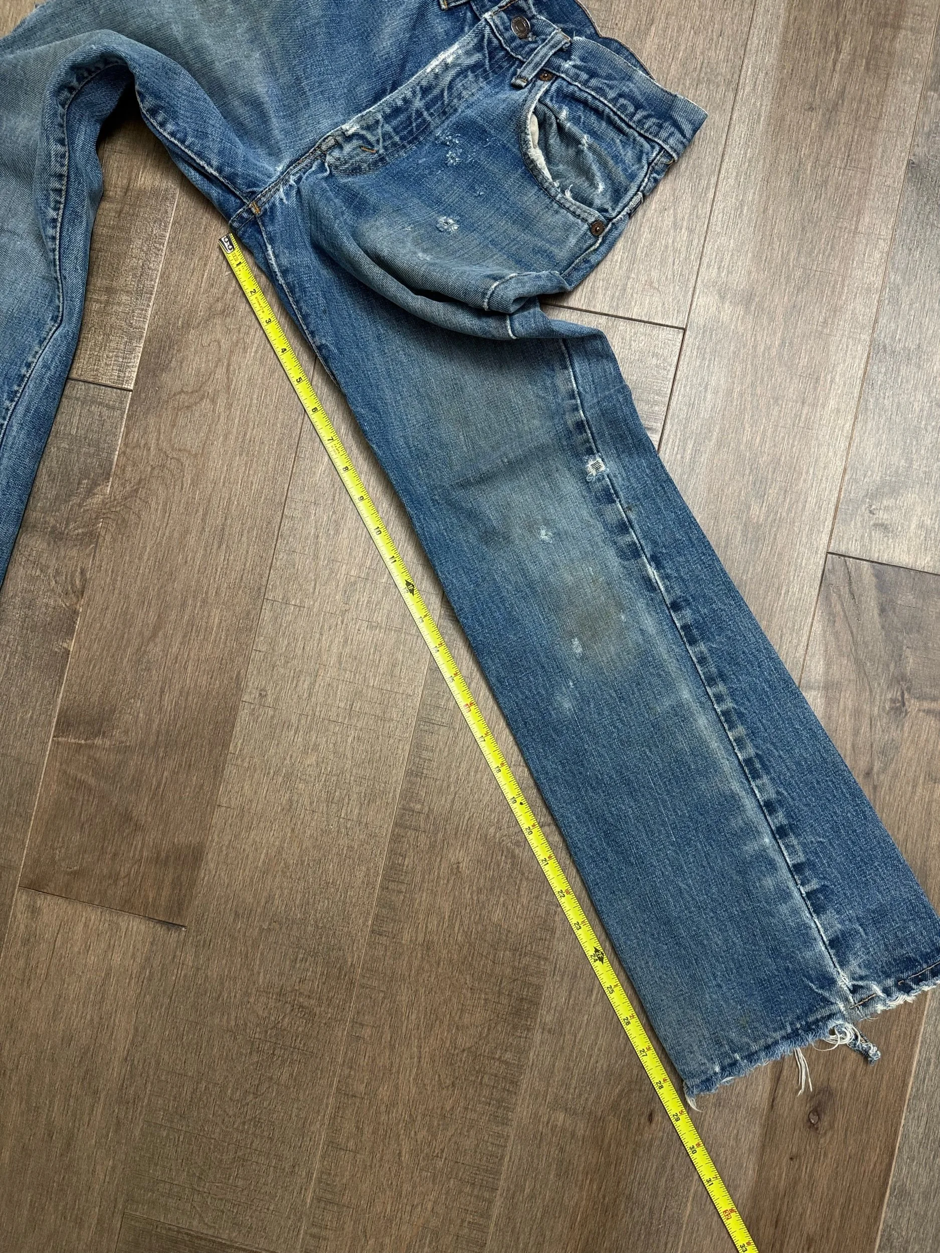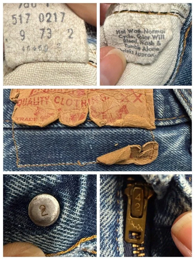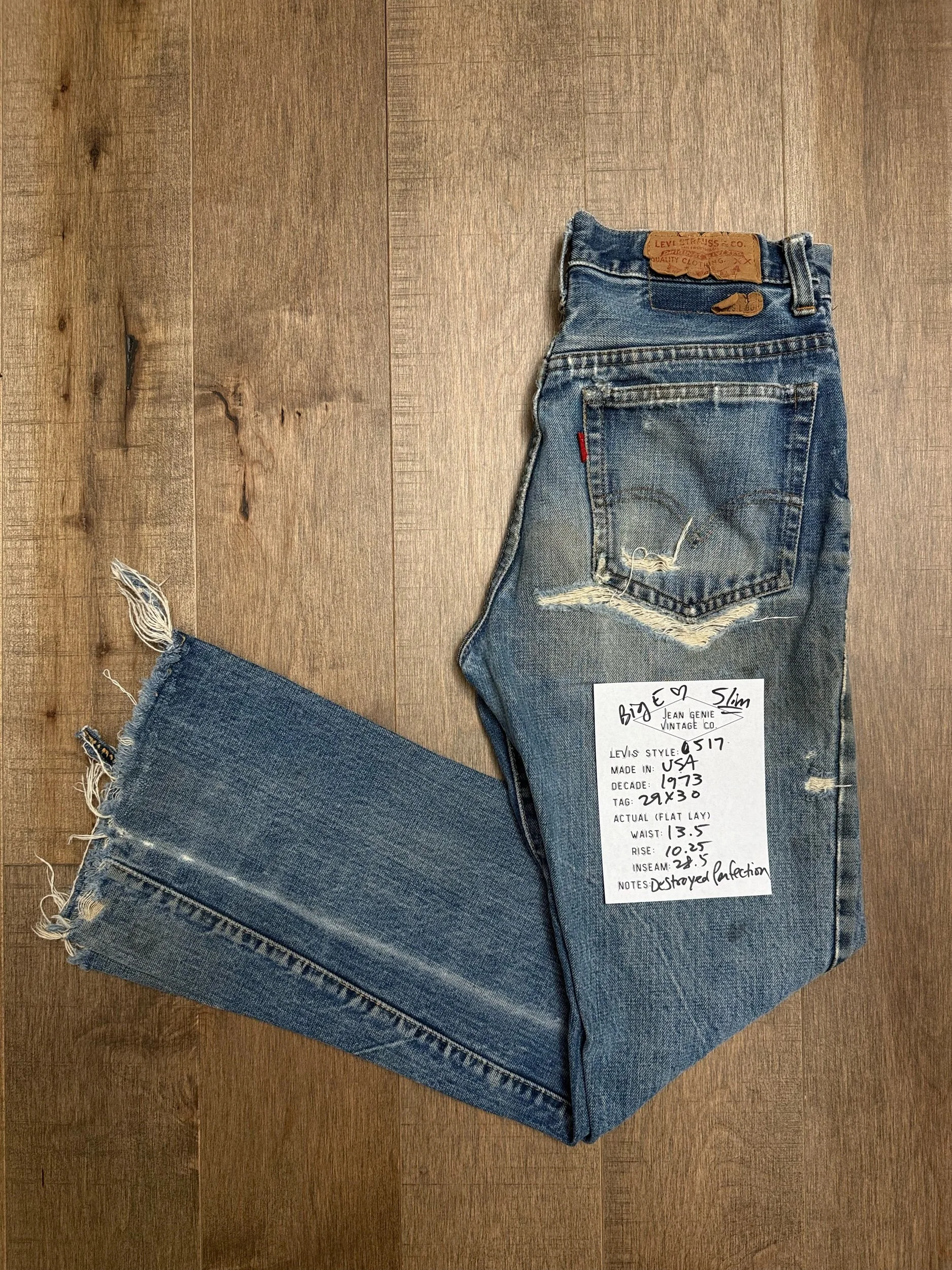 WASH:insane indigo blue wash with dirt-tinged fades, distressed in the best way. Patched bum distress. Slim through the hips. Epic! Very rare do I find a big E tab on a 517.