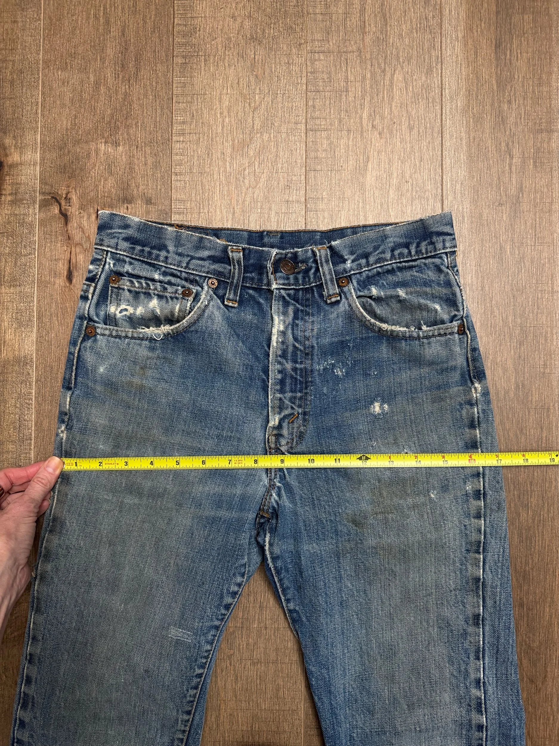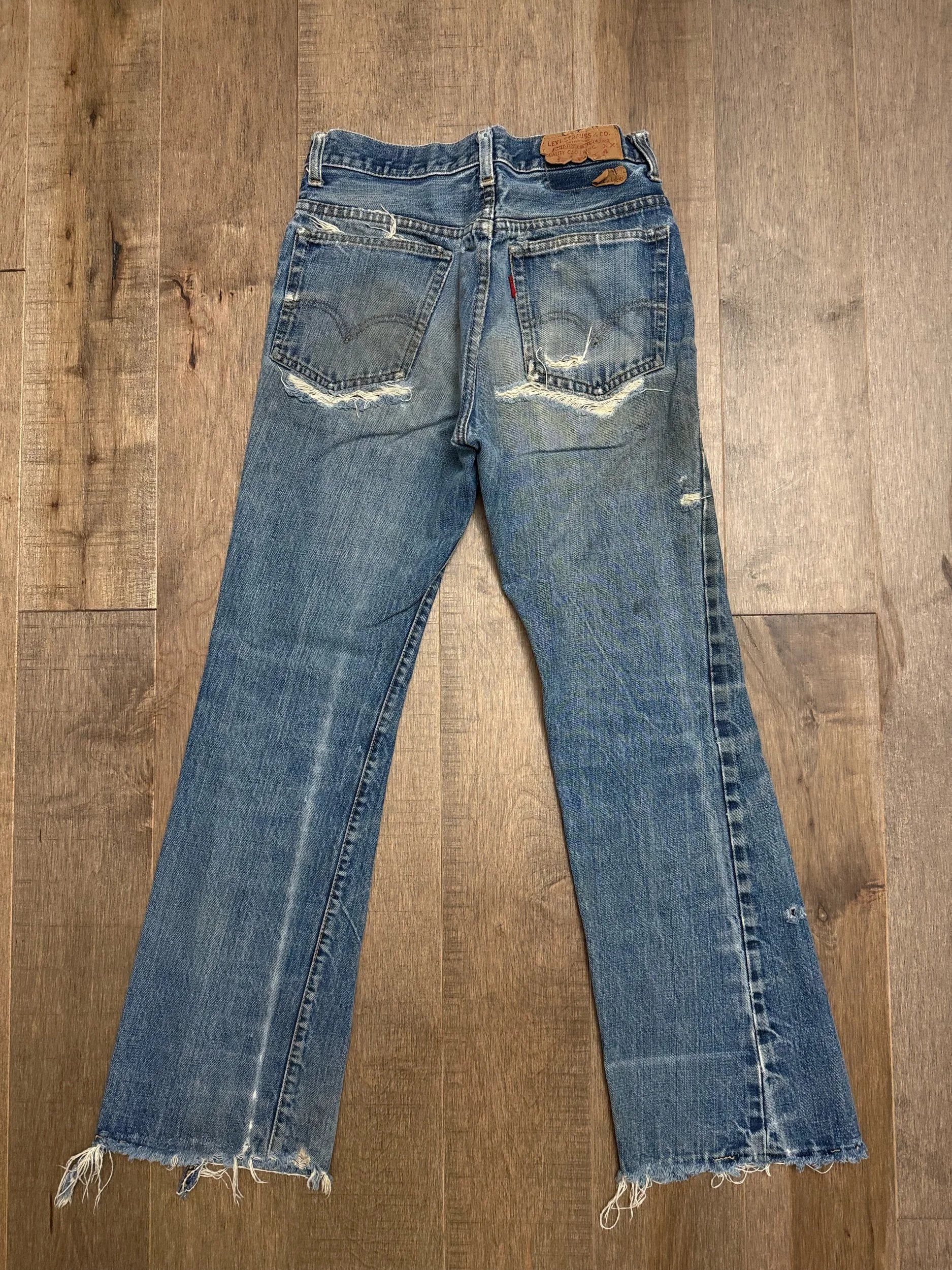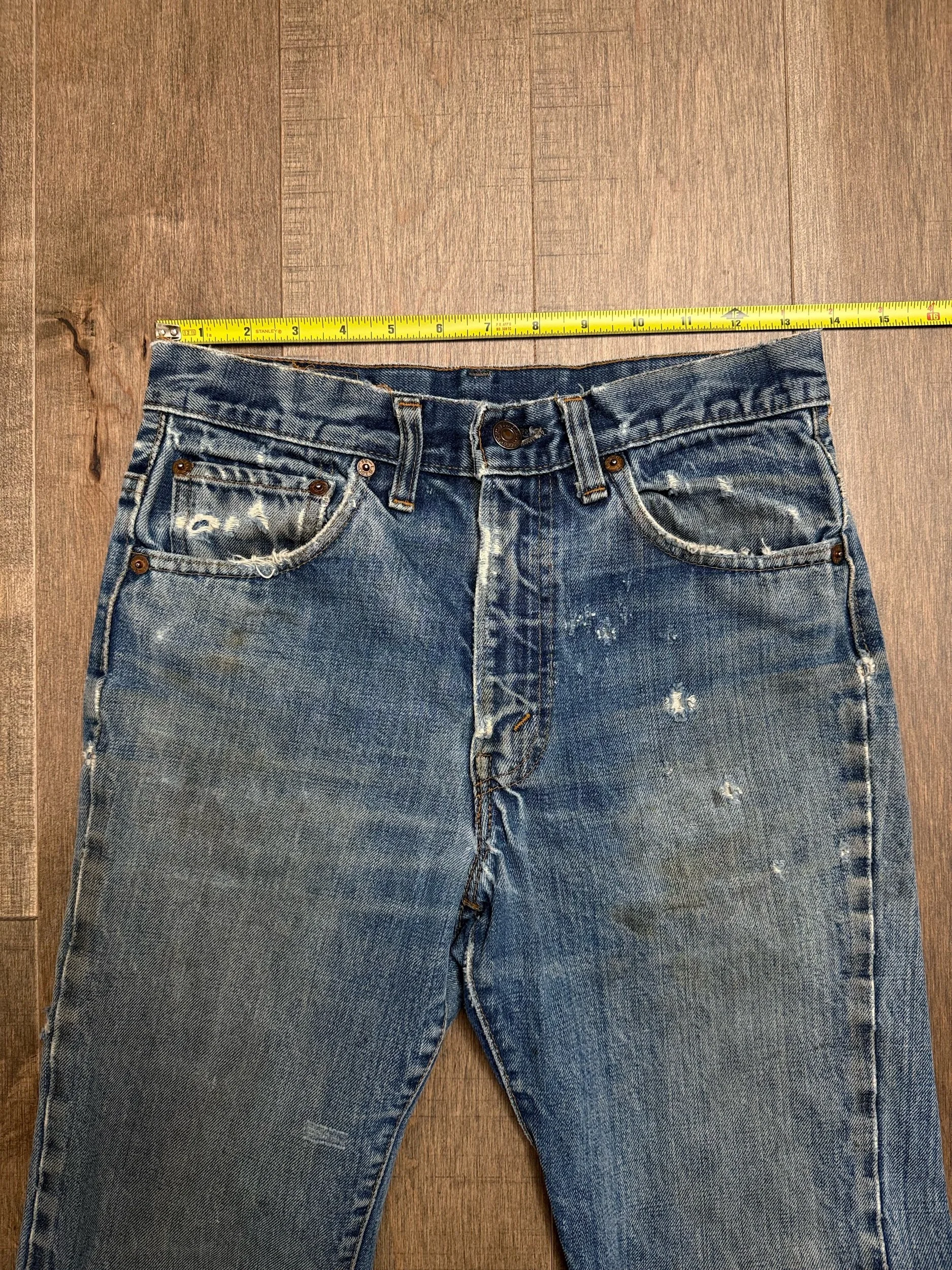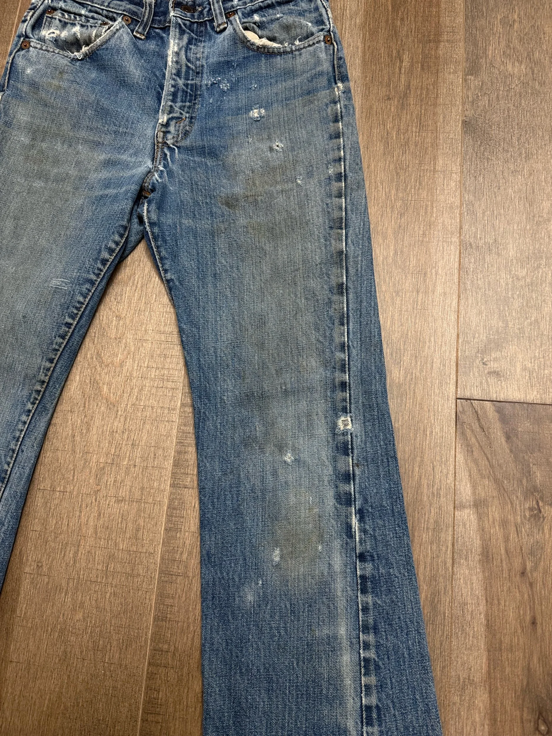 WASH:insane indigo blue wash with dirt-tinged fades, distressed in the best way. Patched bum distress. Slim through the hips. Epic! Very rare do I find a big E tab on a 517.