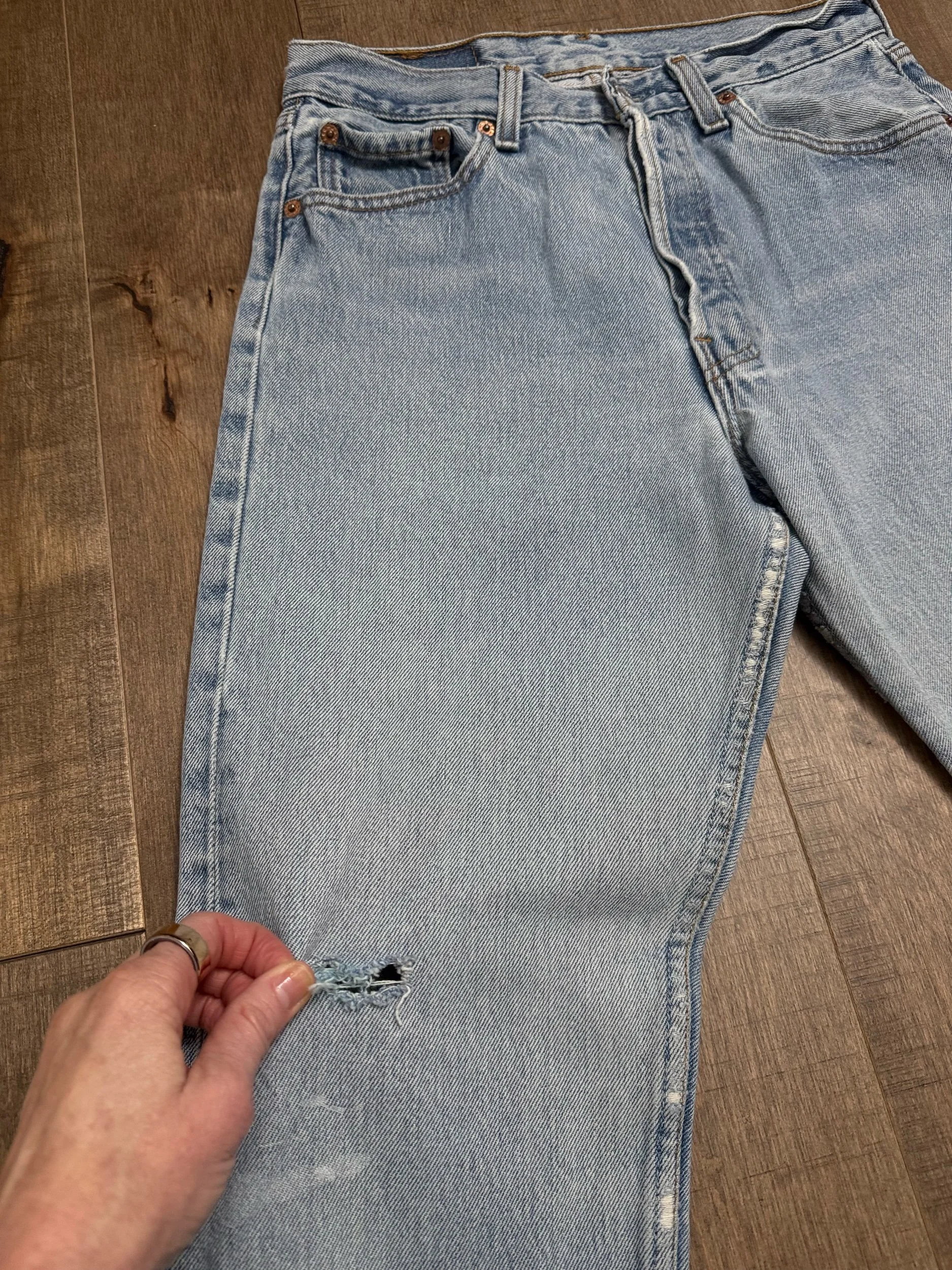 WASH: beautiful light blue wash — right knee hole (can be repaired for small fee, just message through website after purchase)