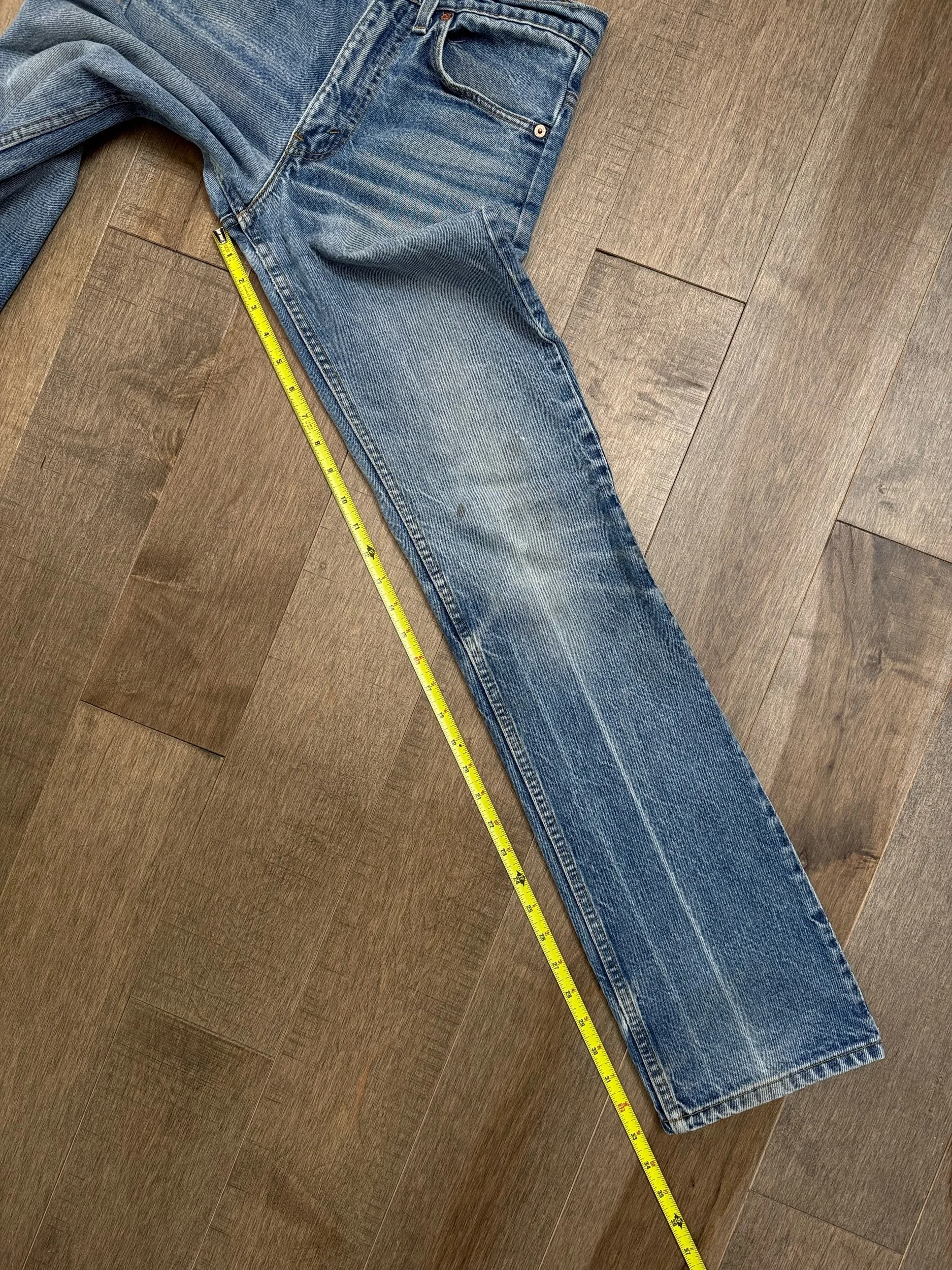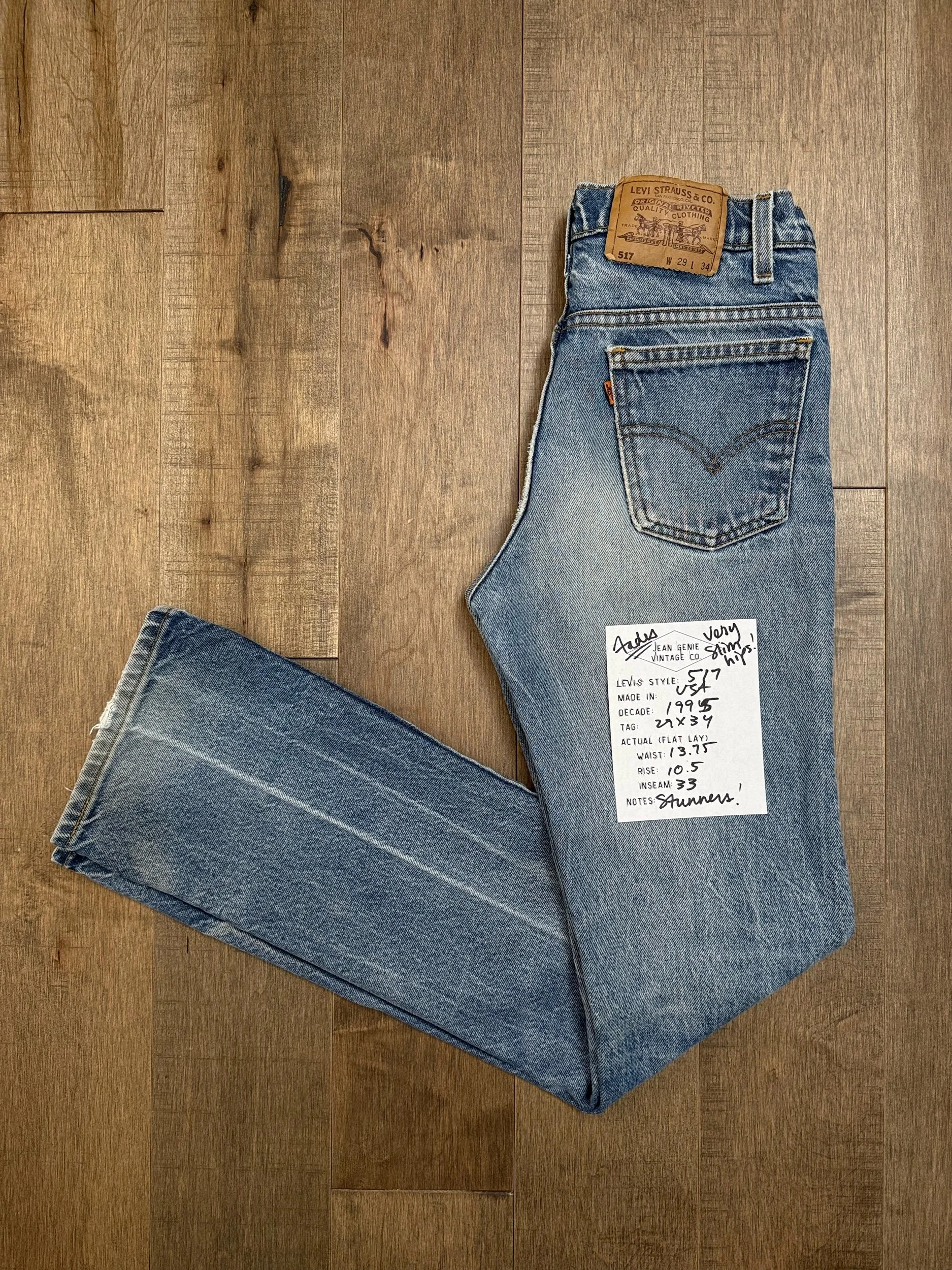 Keep in mind, vintage jeans are not new jeans. Every pair is at least 20 years old, most are older. This means they’ve been worn and likely have signs of wear - i.e. thinning areas, loose threads, signs of previous repair work, discolorations, faint (or not so faint stains), organic distressing, wear at the rivets, wear at the button holes. I do my best to describe these areas/signs of wear&tear, so please - before you buy - understand that you may receive your jeans and there will be signs of aging. Most buy vintage jeans wanting this, but if you want pristine new looking jeans, vintage likely isn’t for you. And that’s A-OK! Also note, the word “vintage” is not synonymous with super worn & faded. Vintage means over 20 years old. An item can be both vintage and still be new or like new condition.