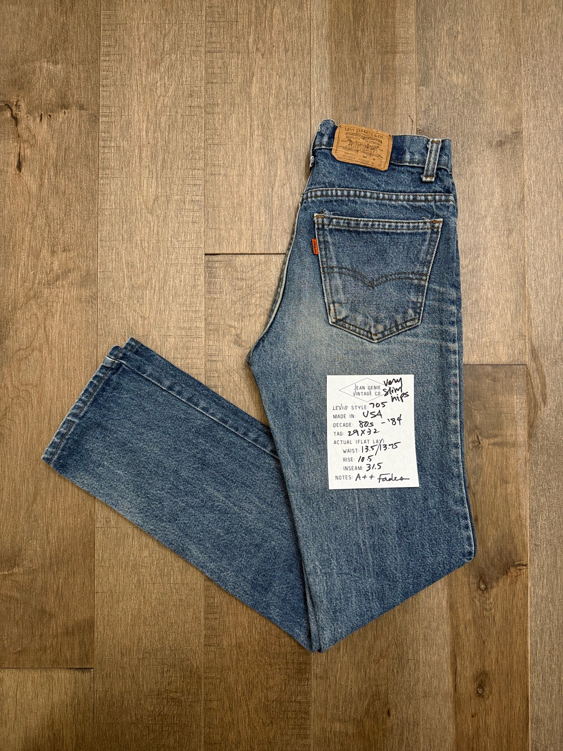 The 705: Straight leg. Zip Fly. Like a 505 but slimmer hips and slightly lower rise.