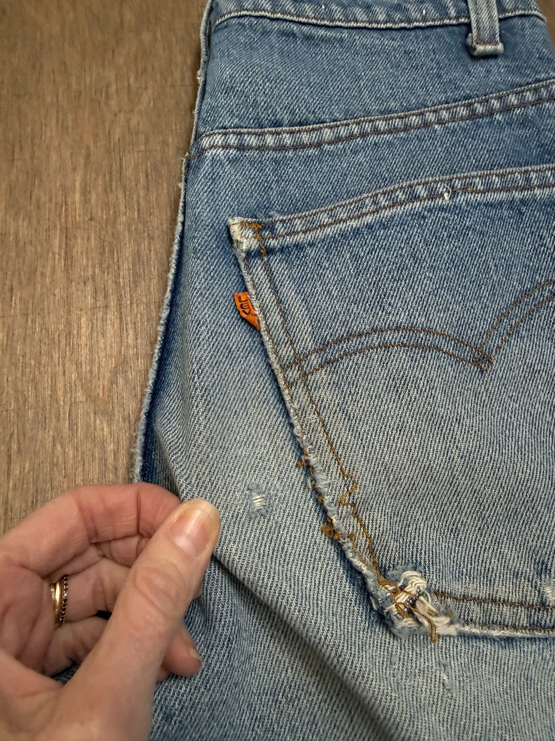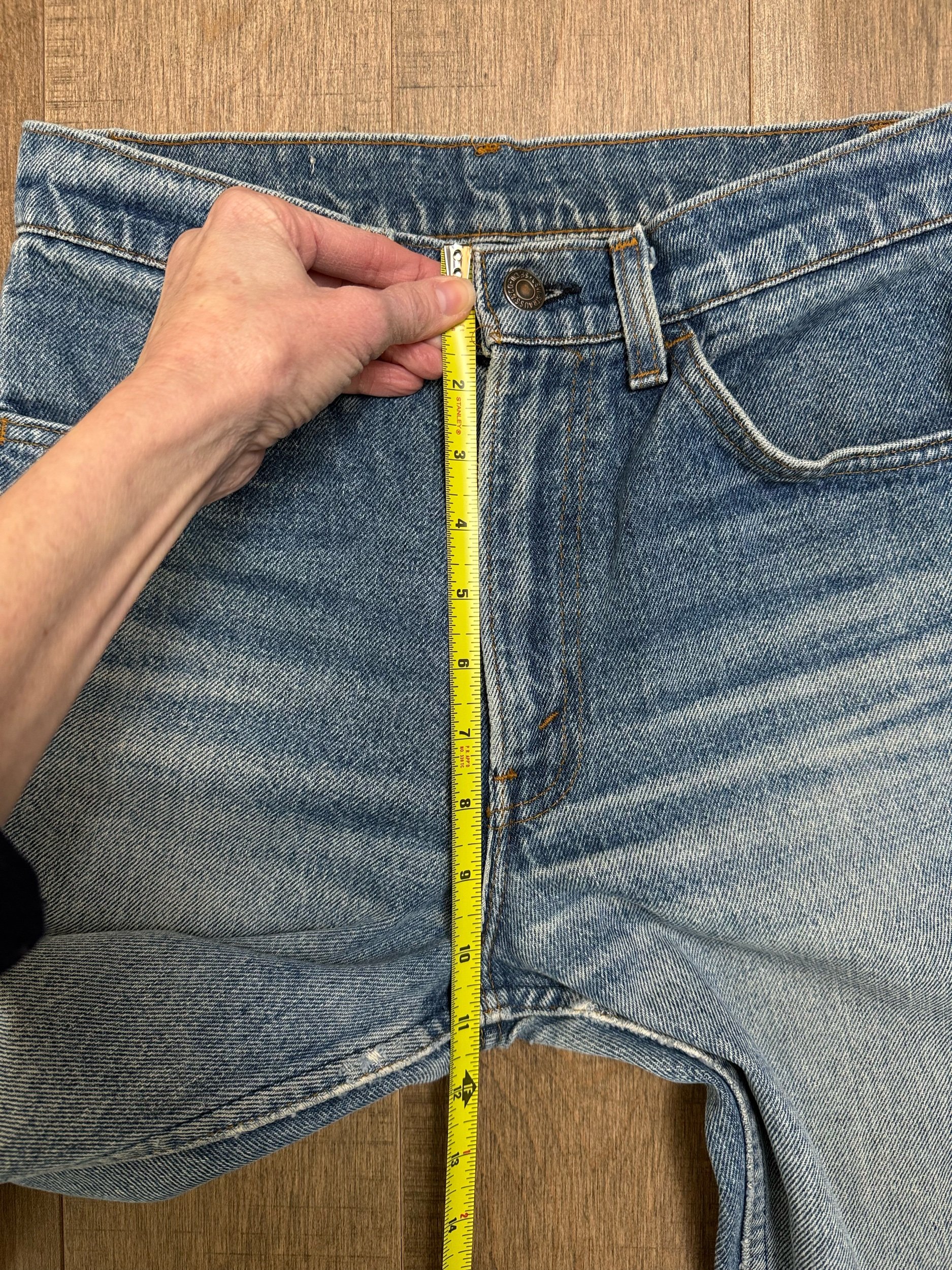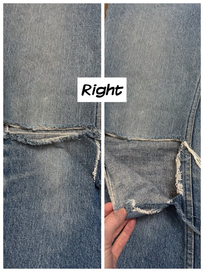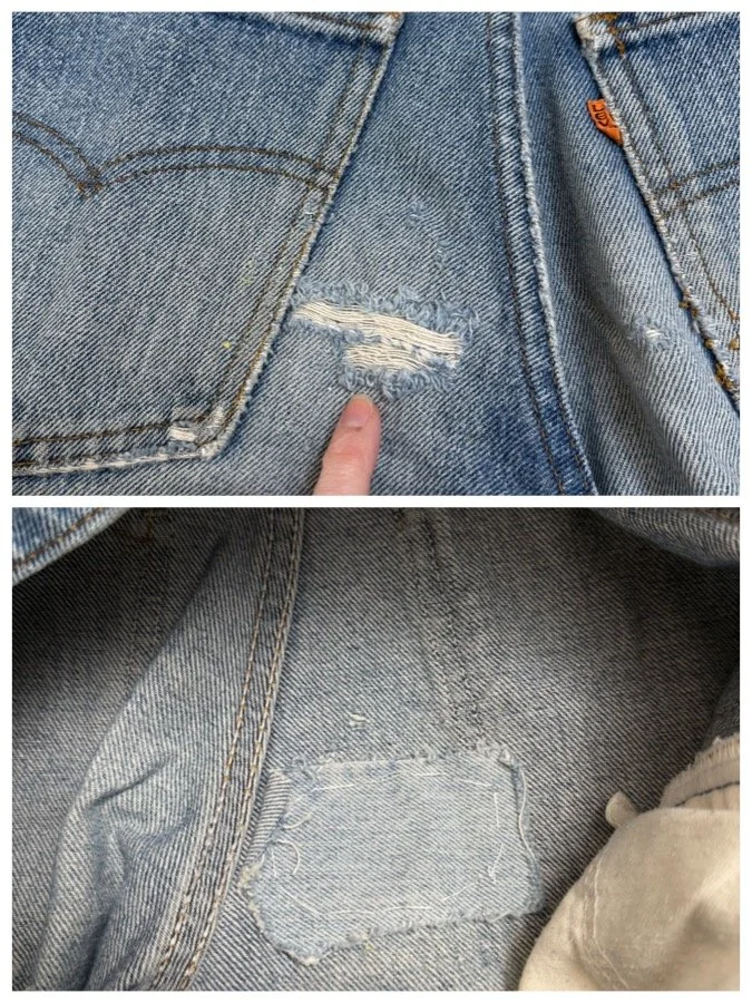 Keep in mind, vintage jeans are not new jeans. Every pair is at least 20 years old, most are older. This means they’ve been worn and likely have signs of wear - i.e. thinning areas, loose threads, signs of previous repair work, discolorations, faint (or not so faint stains), organic distressing, wear at the rivets, wear at the button holes. I do my best to describe these areas/signs of wear&tear, so please - before you buy - understand that you may receive your jeans and there will be signs of aging. Most buy vintage jeans wanting this, but if you want pristine new looking jeans, vintage likely isn’t for you. And that’s A-OK! Also note, the word “vintage” is not synonymous with super worn & faded. Vintage means over 20 years old. An item can be both vintage and still be new or like new condition.