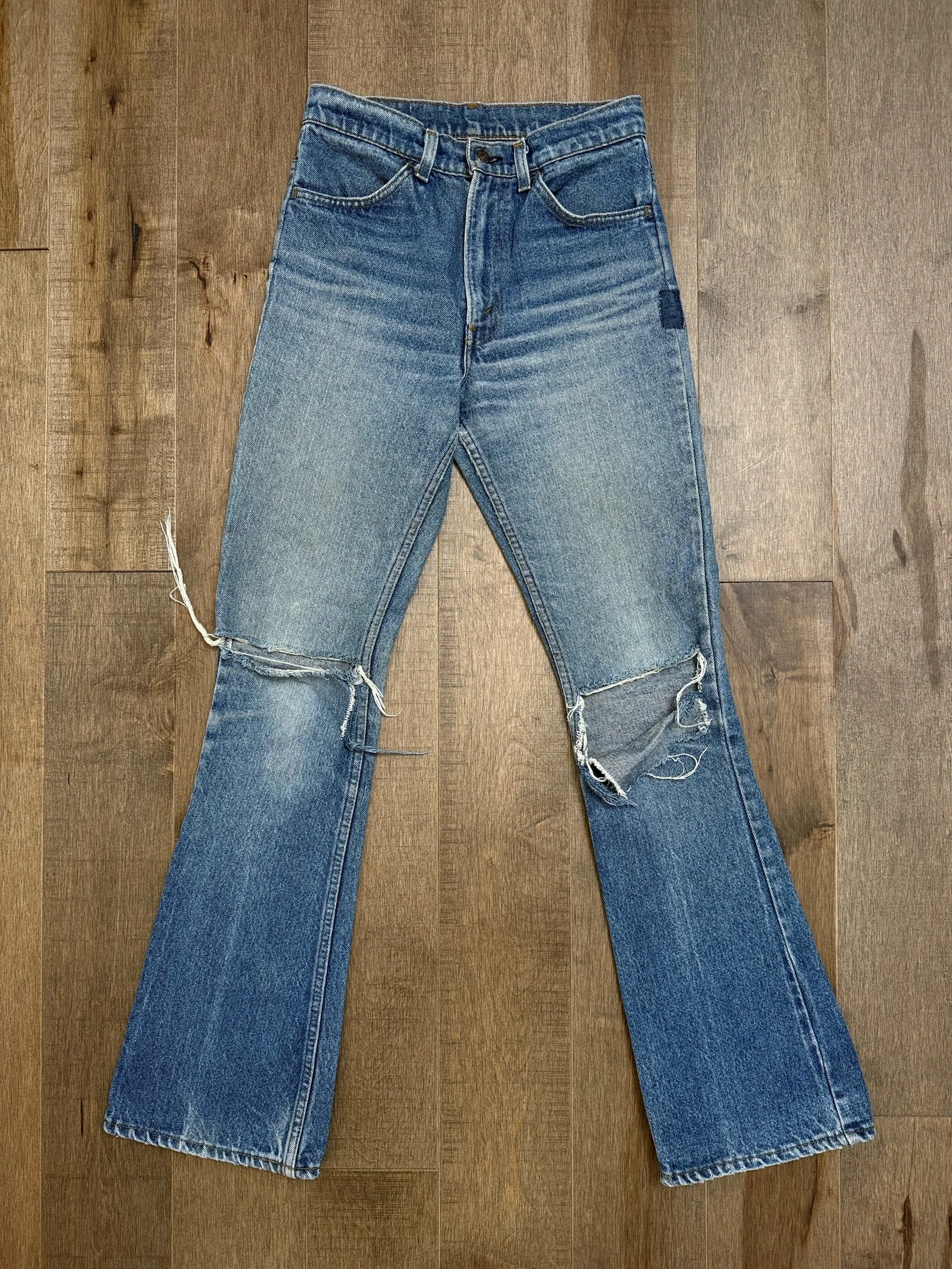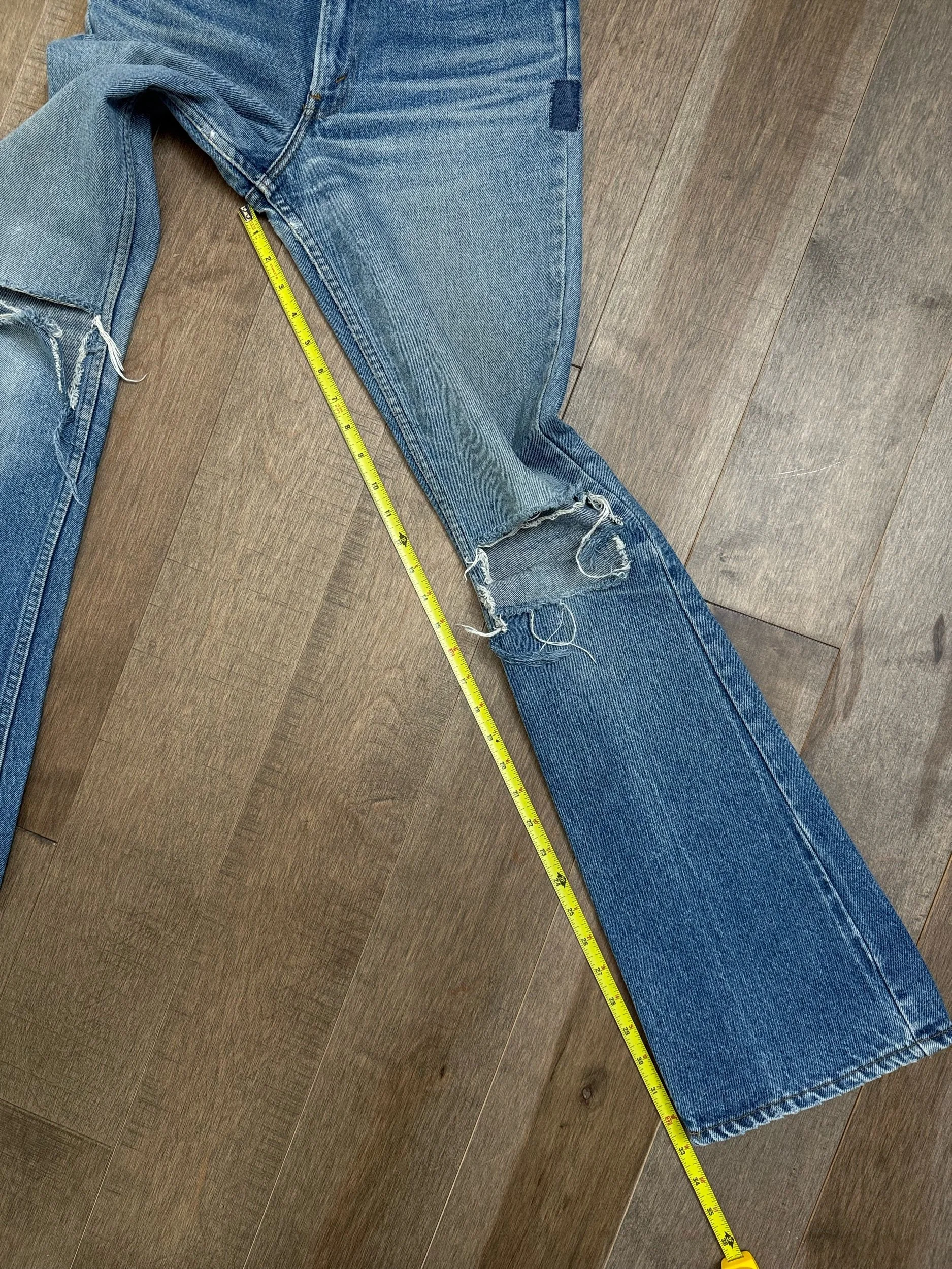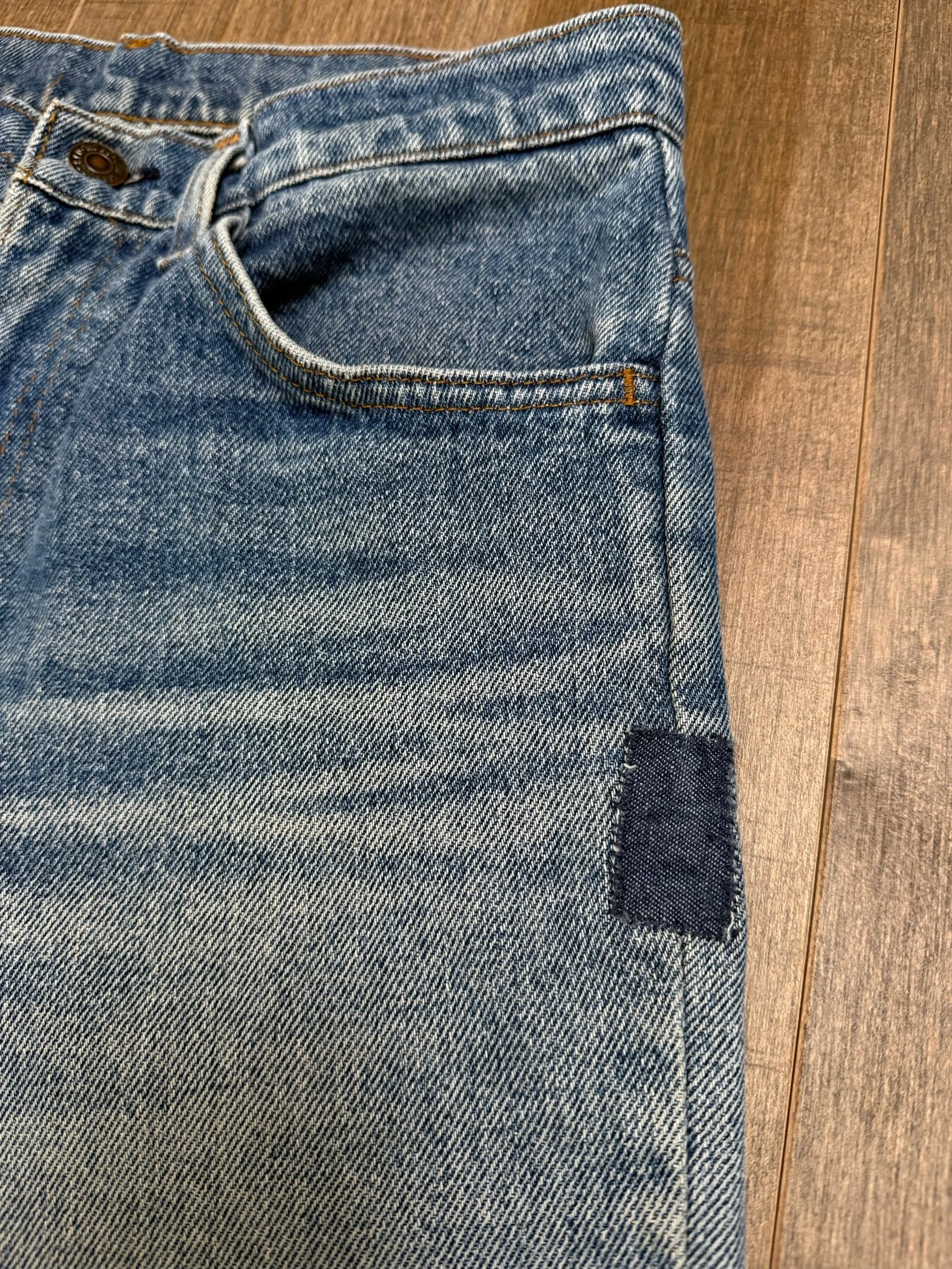 WASH: beautiful classic heavily sun faded medium blue wash with patched left bum repair, little thin spot right bum, knee rips (potential to be repaired, just message through website after purchase).