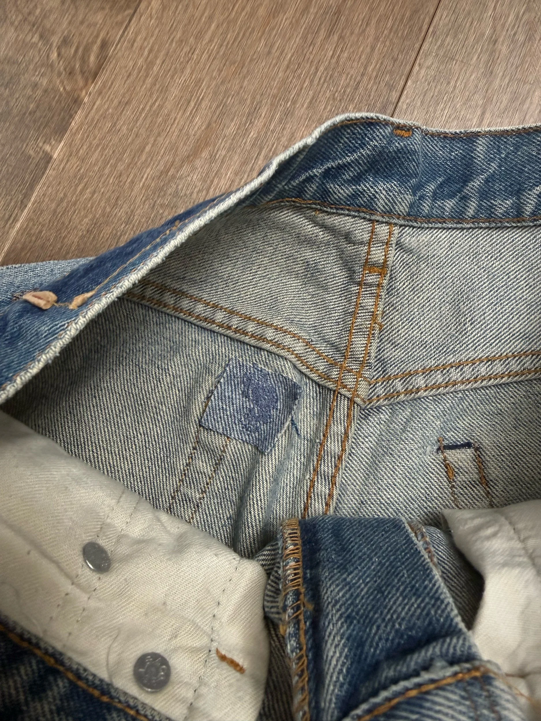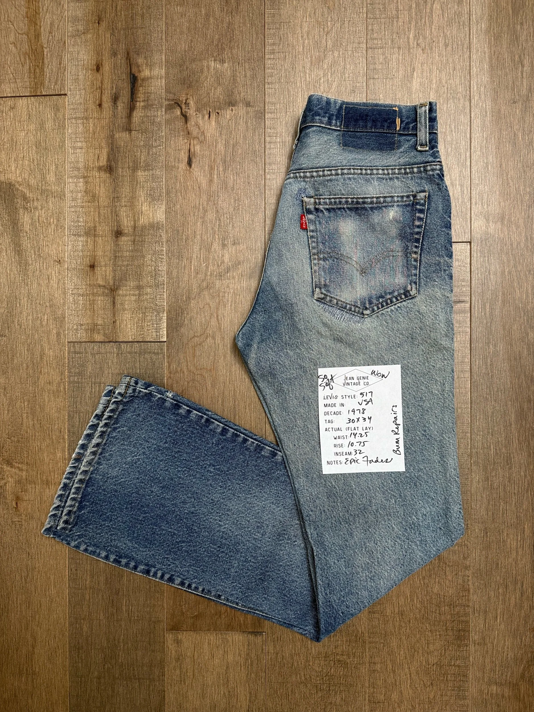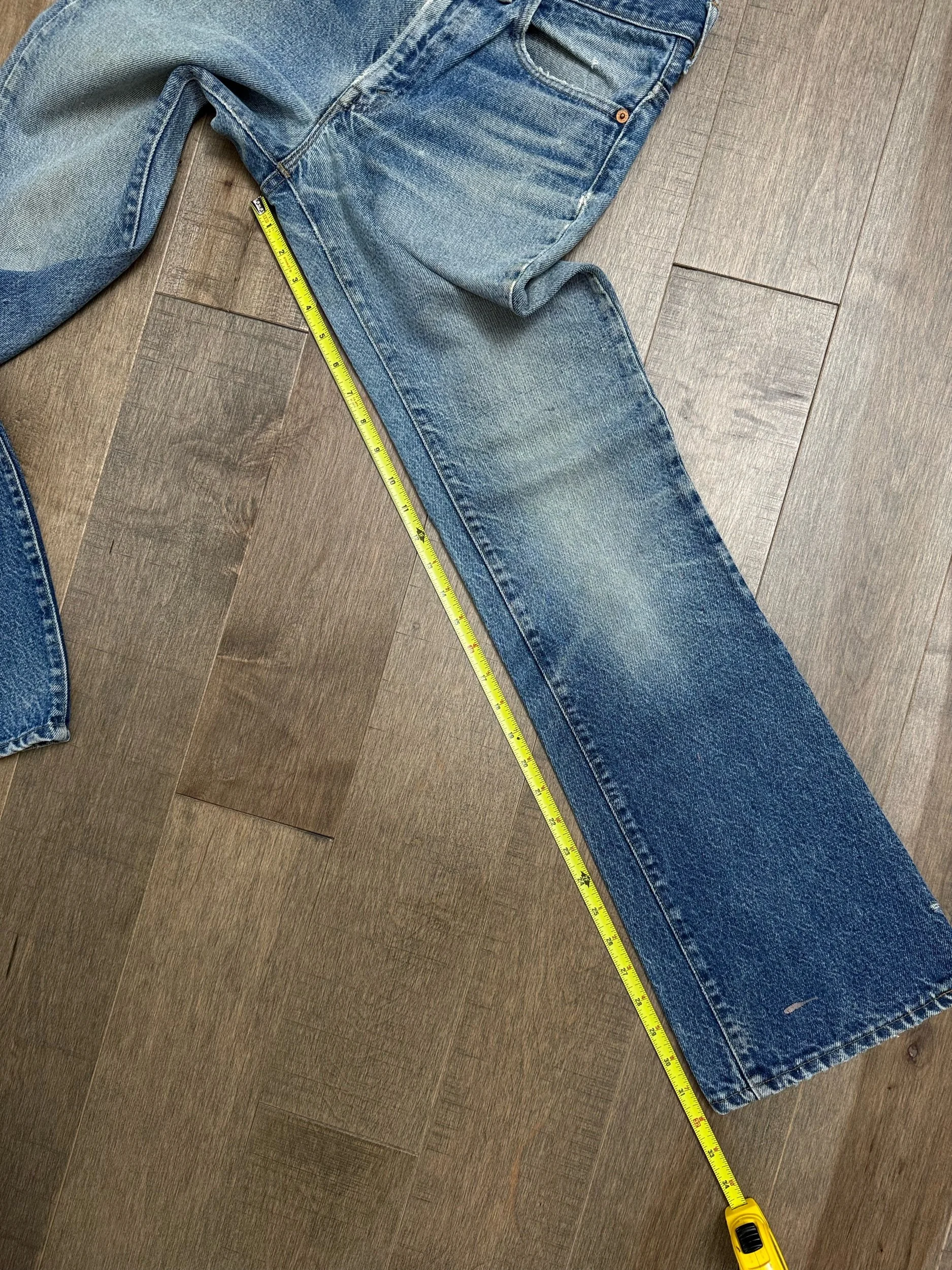 WASH: epic super sun faded medium blue wash with cool bum repairs. So so soft! 48 years old — wow!