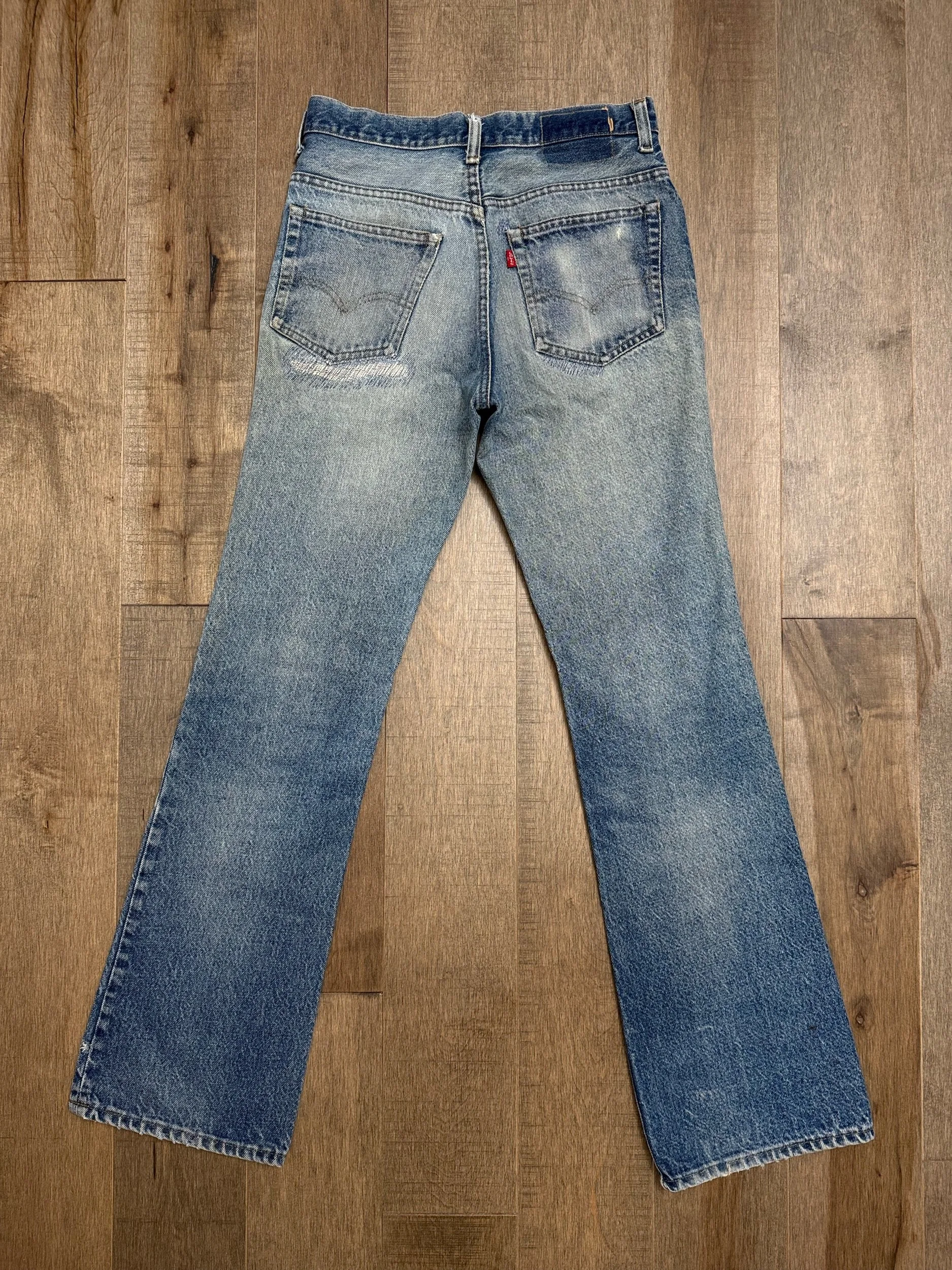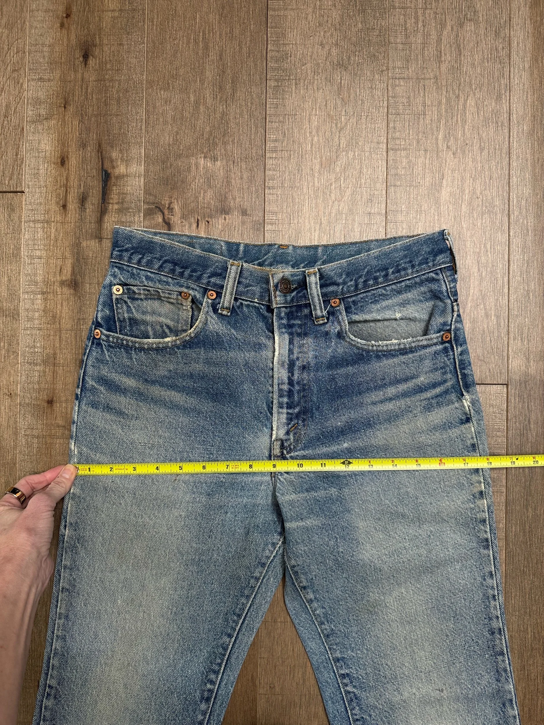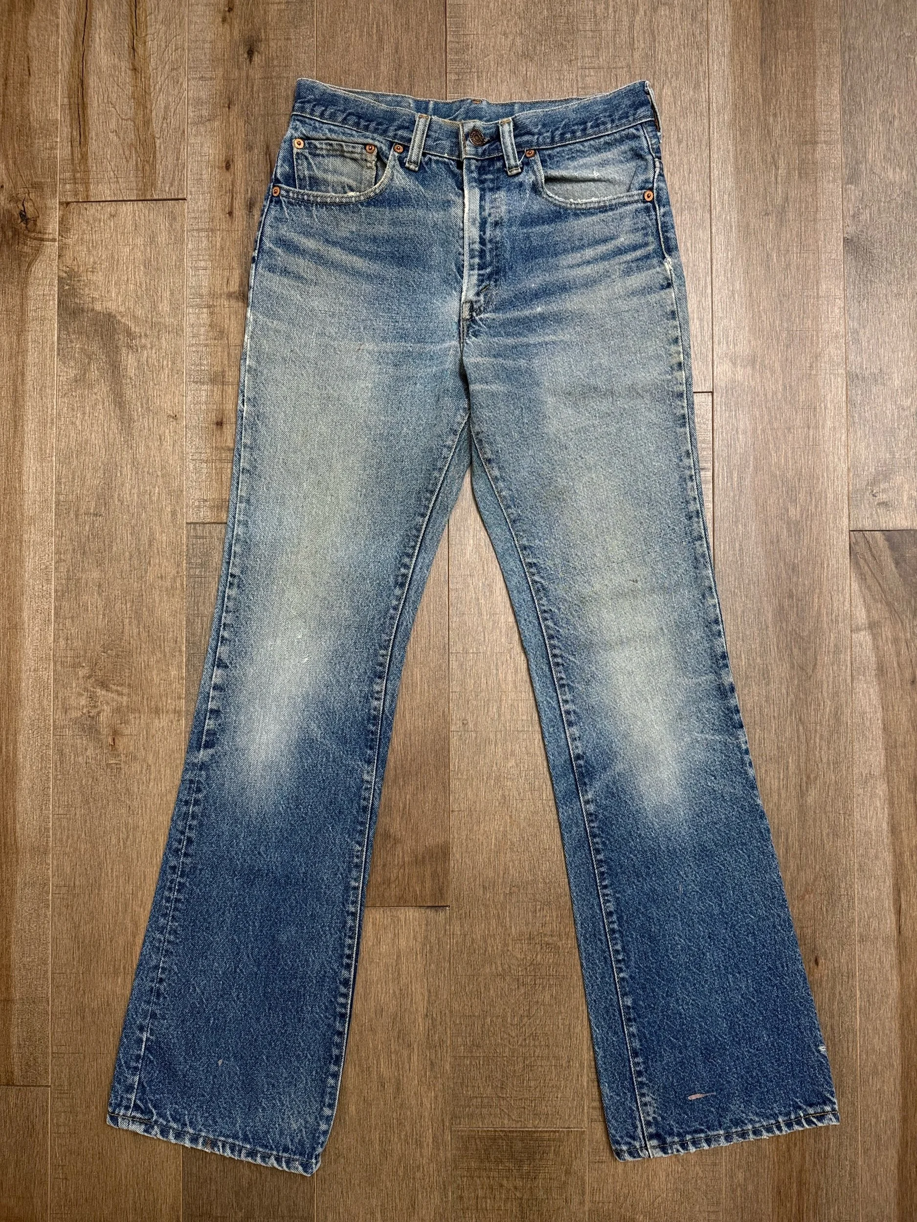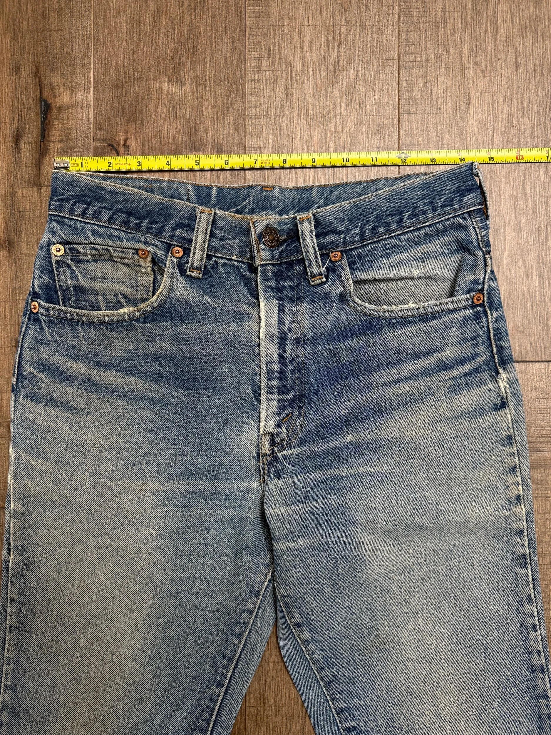 WASH: epic super sun faded medium blue wash with cool bum repairs. So so soft! 48 years old — wow!