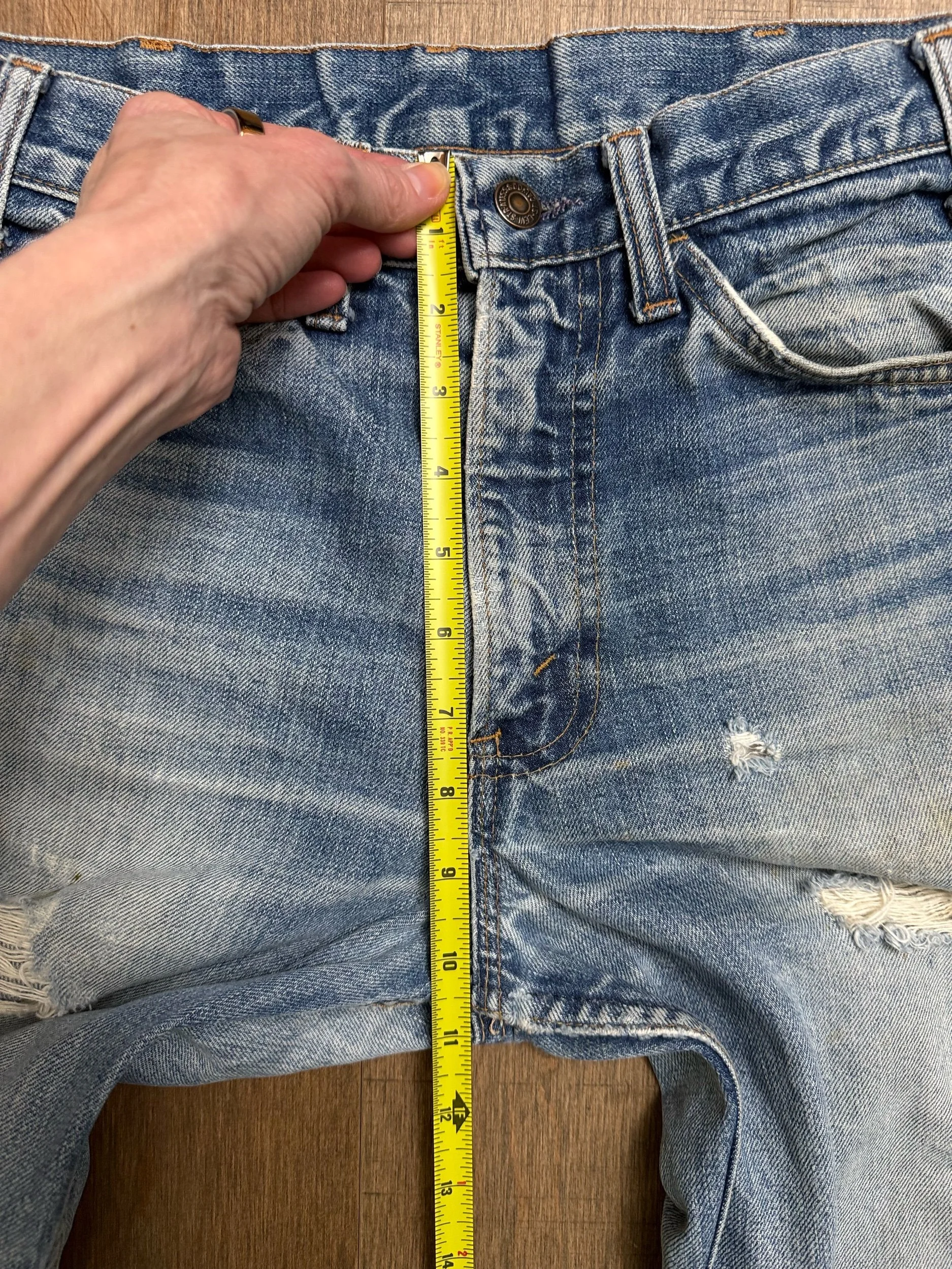 WASH: epic sun faded medium indigo wash with awesome organic sun fades, distress and discolored areas. So much character! Repairs can be made to the distressed areas for a fee, just reply to your order confirmation.
