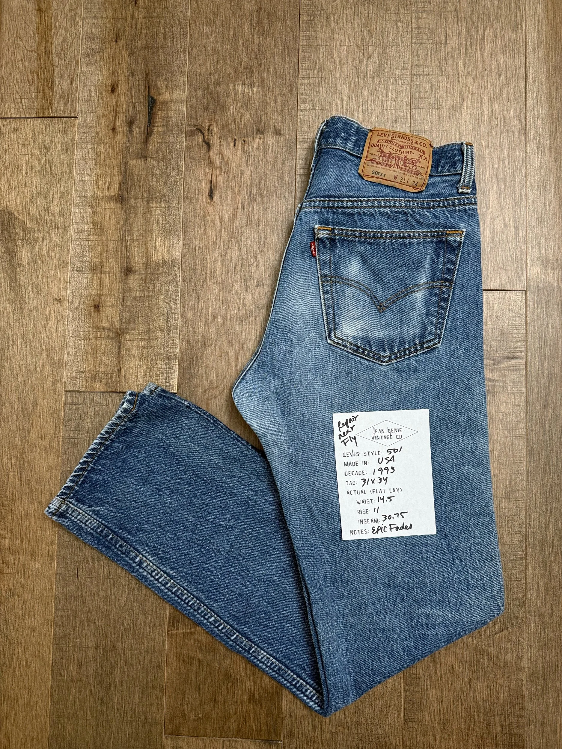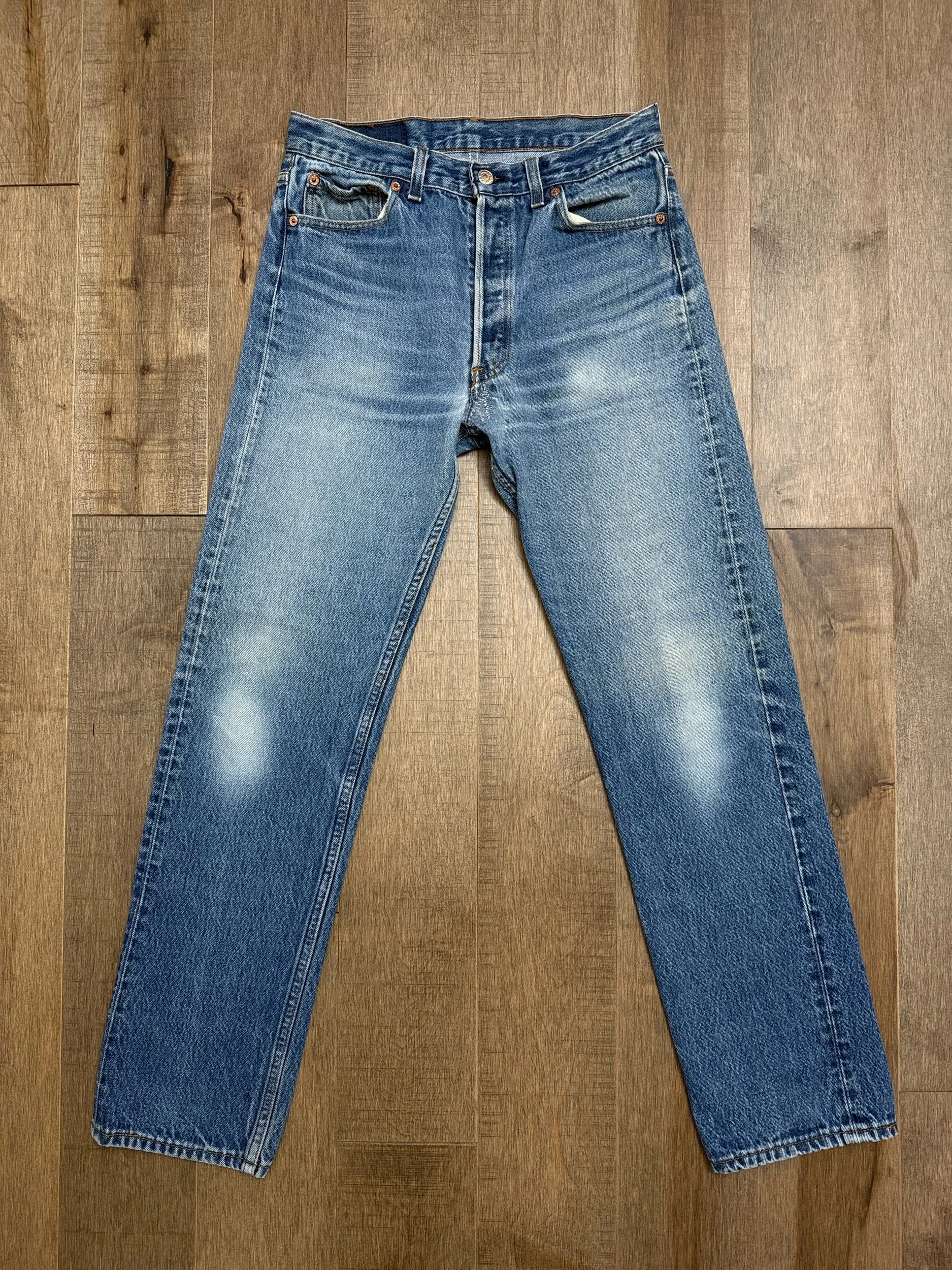 WASH: gorgeous medium blue wash with epic organic sun fades. Machine repair near fly.