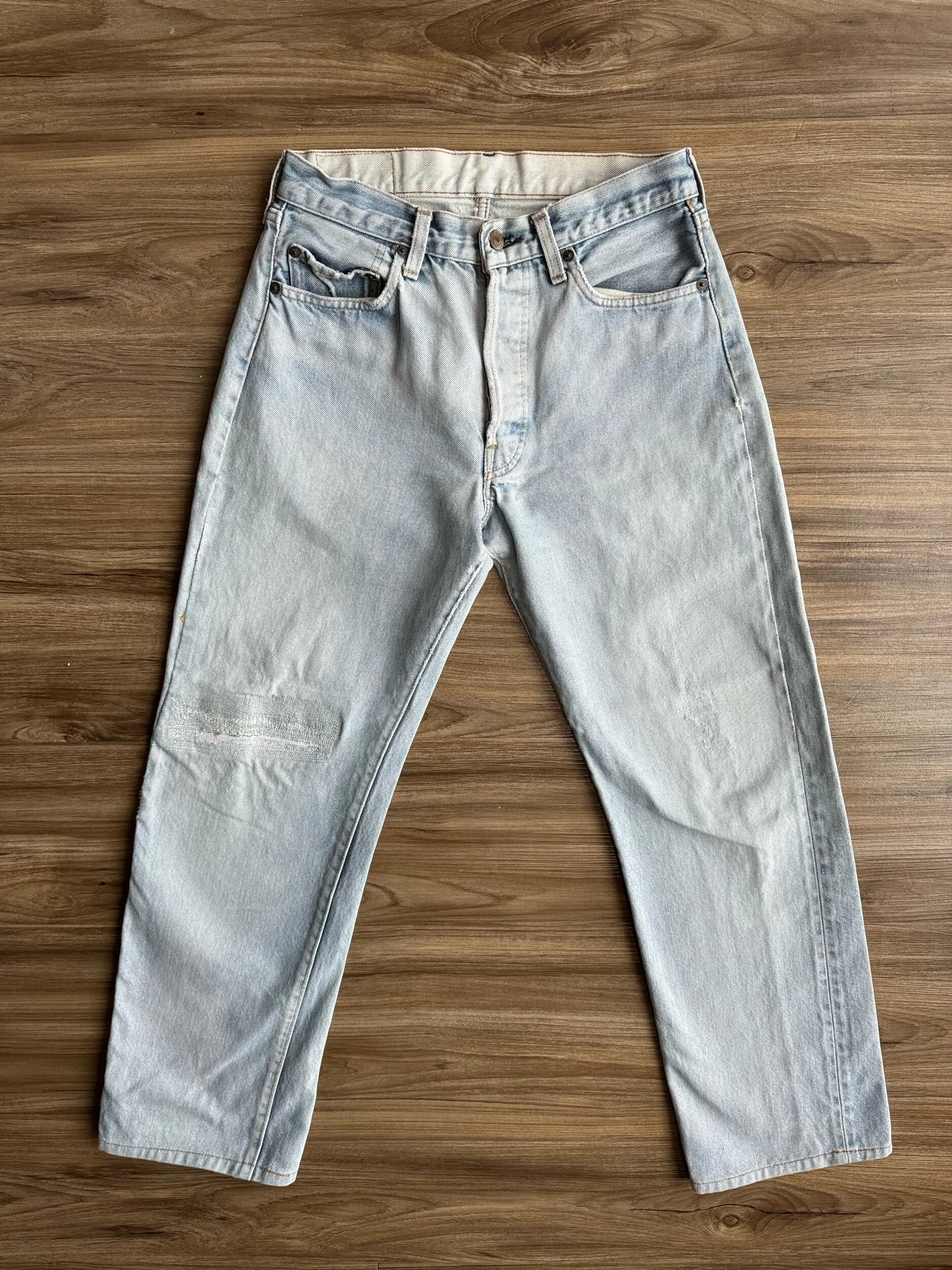 WASH: very light blue wash (might have even been lightened more intentionally decades ago by previous owner) with cool sun fades, nice right knee repair.