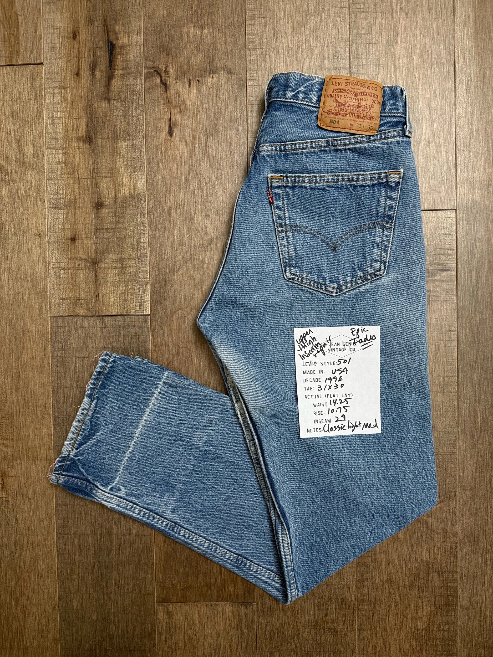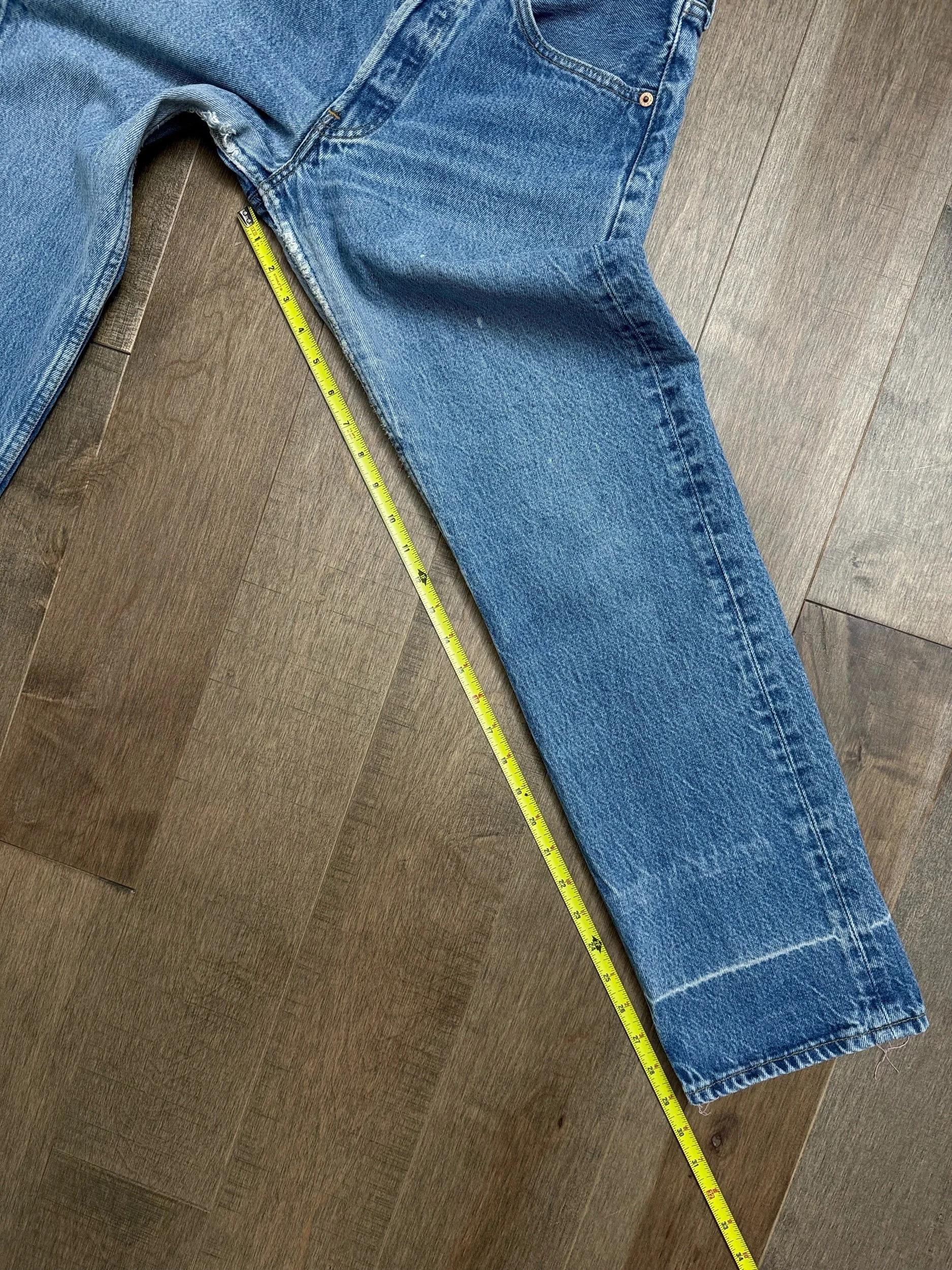 WASH: beautiful light medium blue wash with the coolest organic sun fades — especially those around the bottoms of the legs, which occurs from someone cuffing them repetitively over decades. There is one open area in the upper inner thigh seam that has come apart, and will be repaired prior to shipping. No extra fee.
