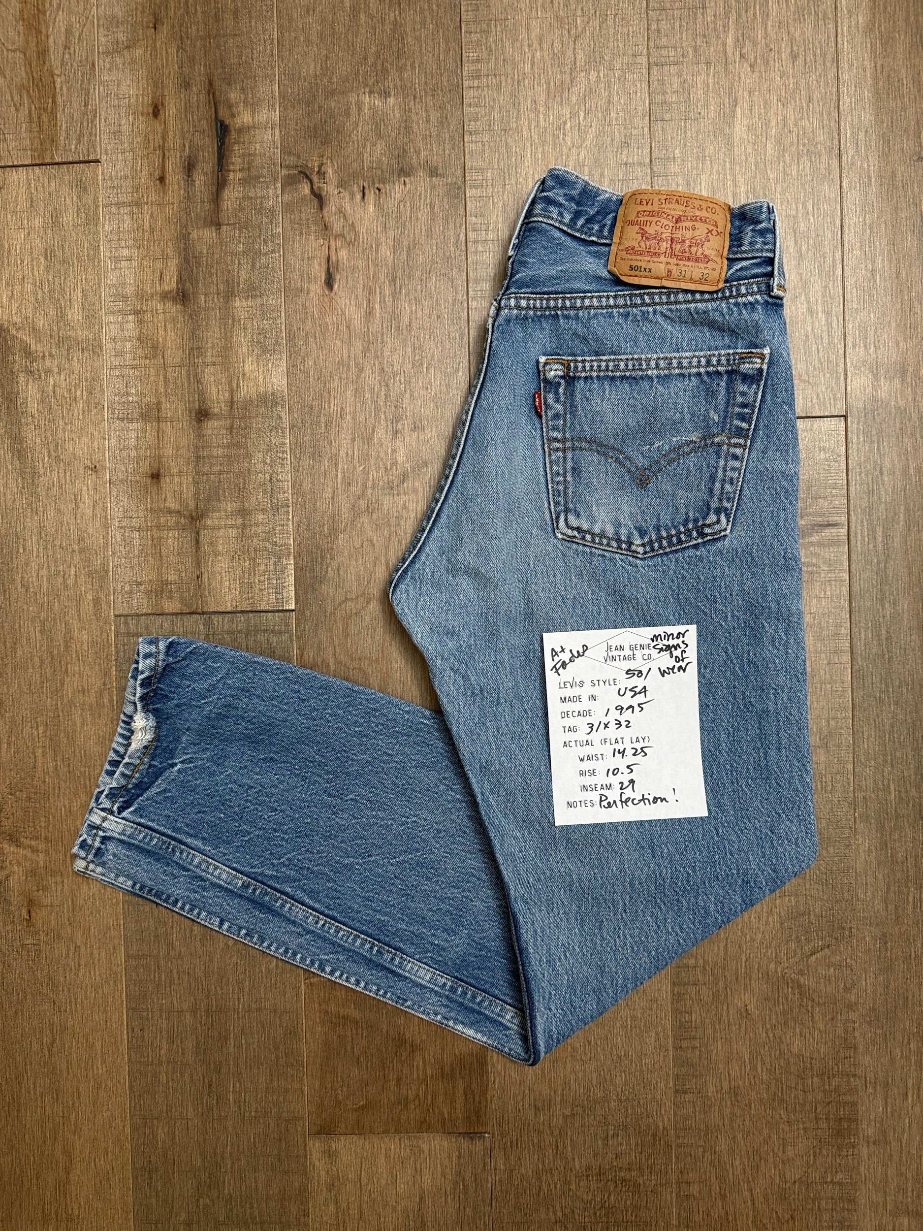 WASH: beautiful light-medium classic blue wash with perfect organic sun fades. Minor distress/signs of wear right thigh.