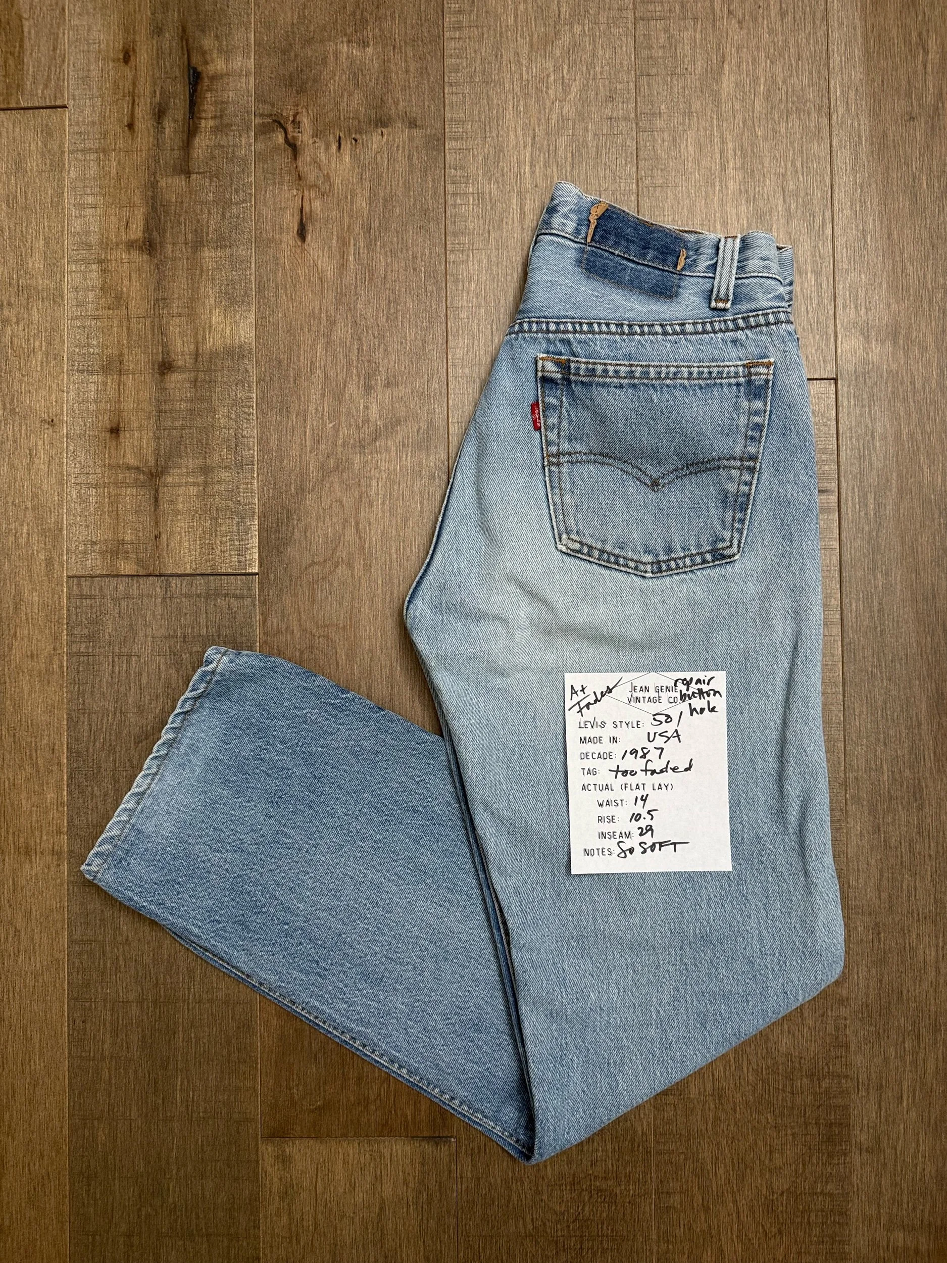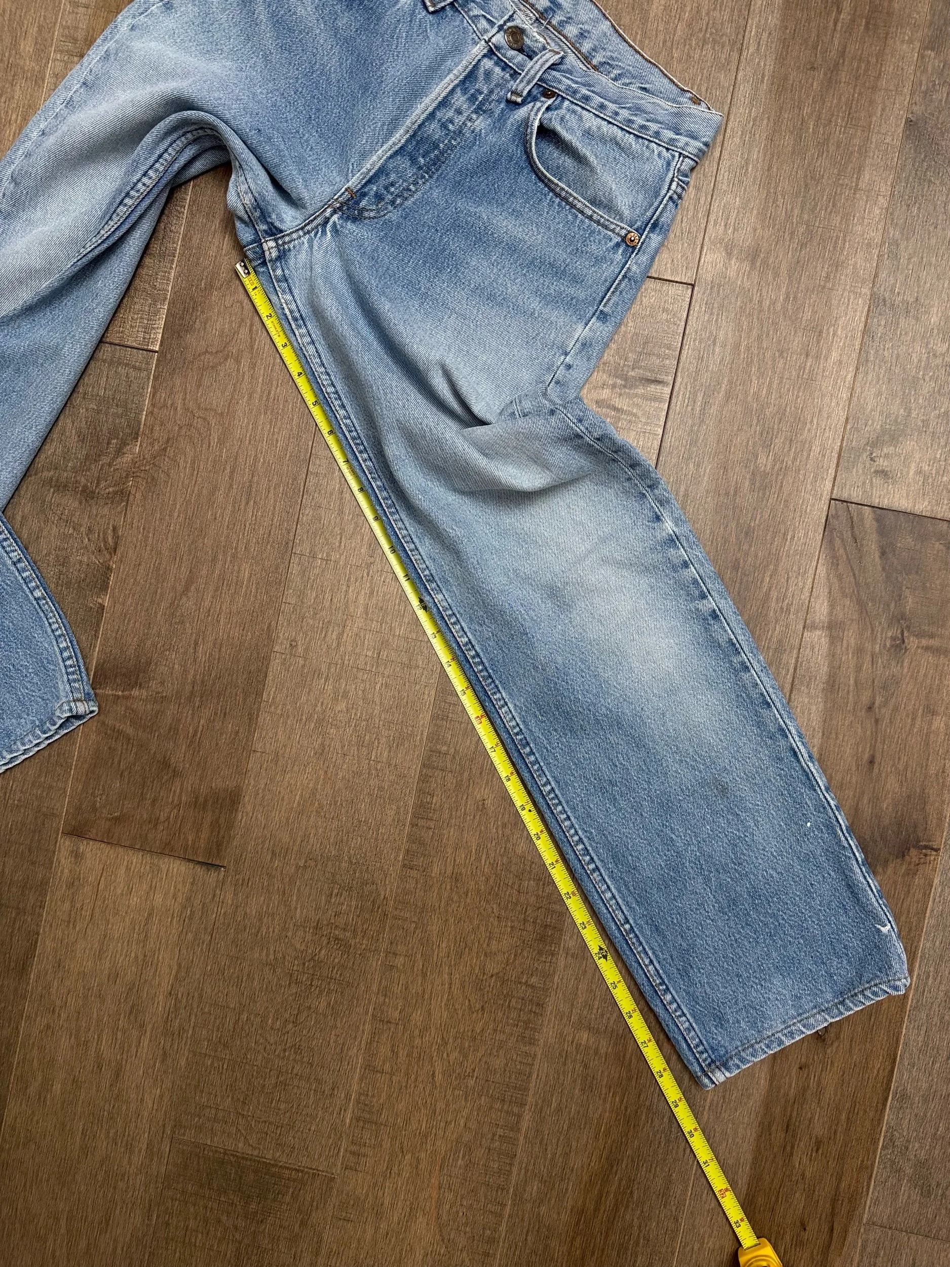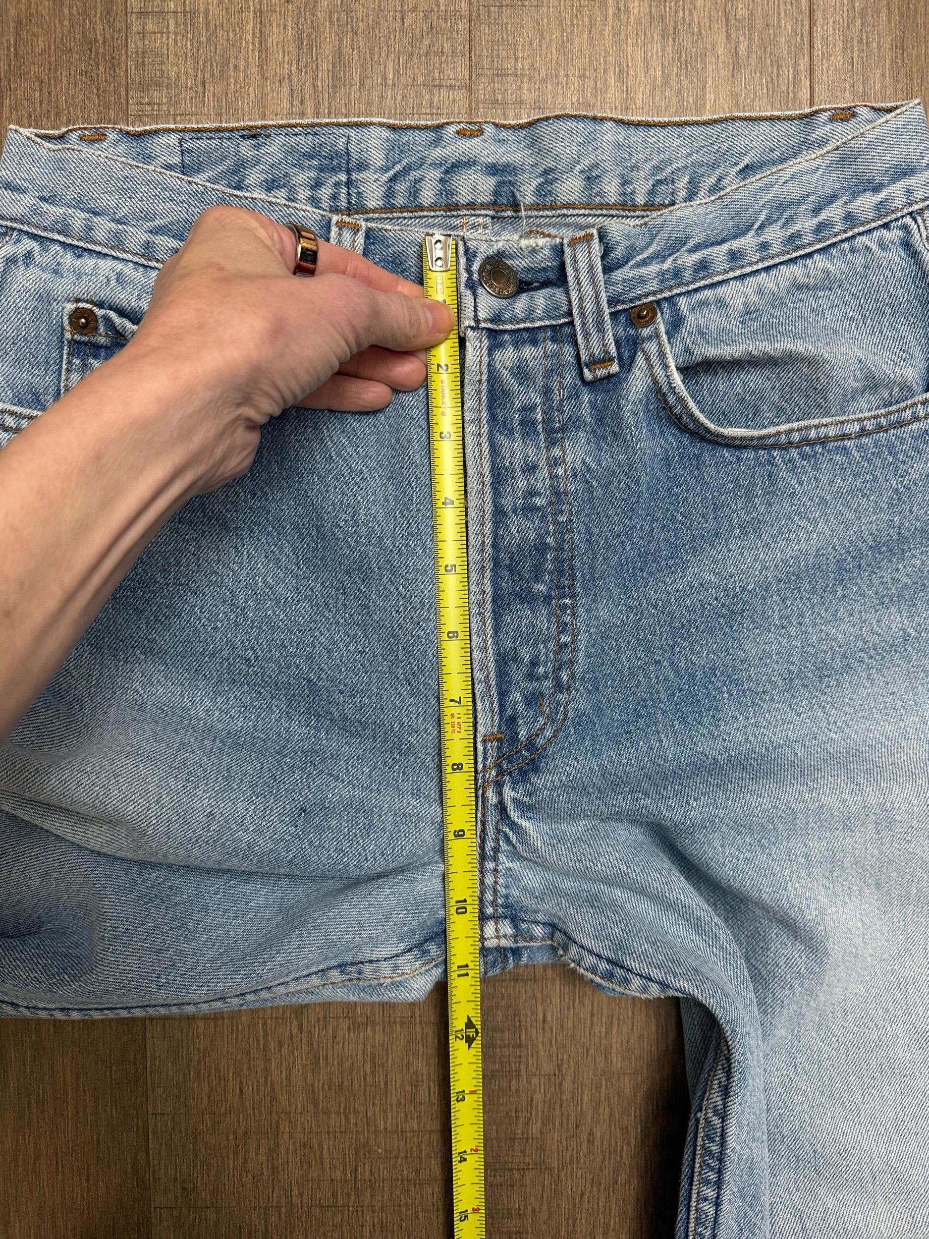 WASH: stunning light blue wash with perfect organic sun fades. Soft and worn in! Button hole in fly — repaired