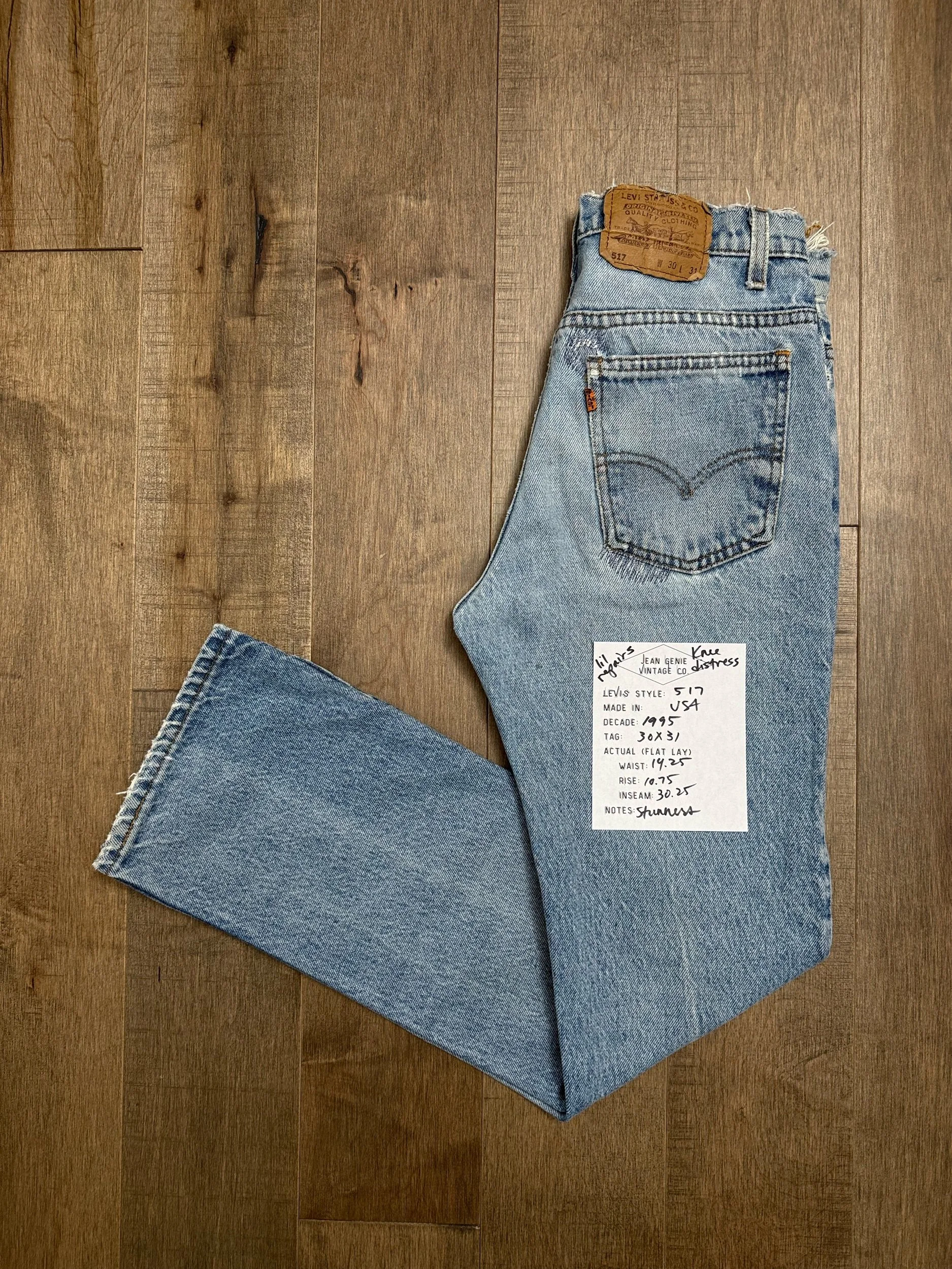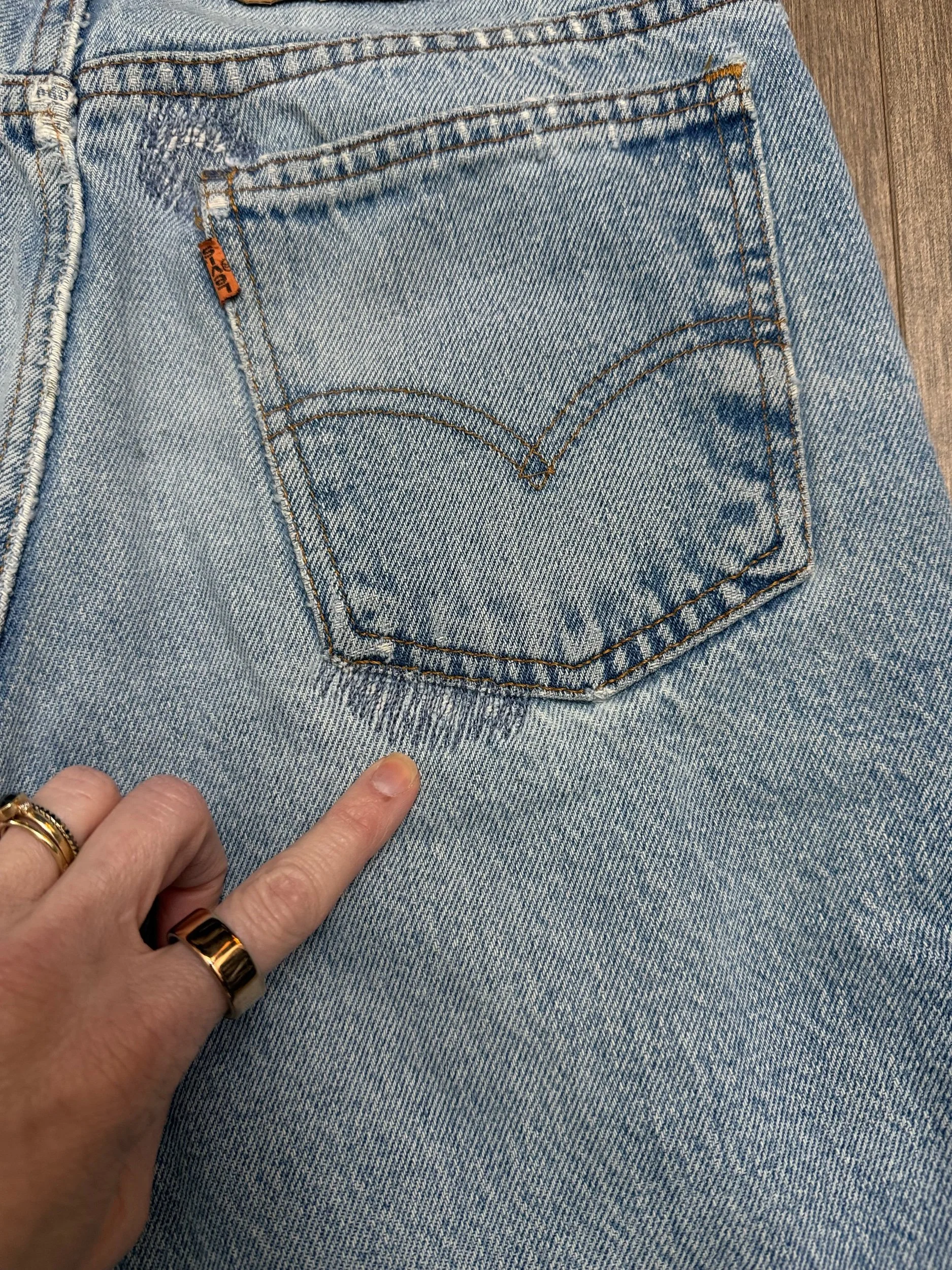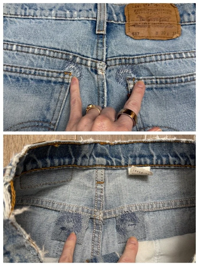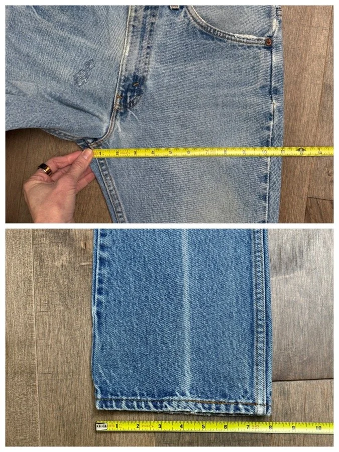 Keep in mind, vintage jeans are not new jeans. Every pair is at least 20 years old, most are older. This means they’ve been worn and likely have signs of wear - i.e. thinning areas, loose threads, signs of previous repair work, discolorations, faint (or not so faint stains), organic distressing, wear at the rivets, wear at the button holes. I do my best to describe these areas/signs of wear&tear, so please - before you buy - understand that you may receive your jeans and there will be signs of aging. Most buy vintage jeans wanting this, but if you want pristine new looking jeans, vintage likely isn’t for you. And that’s A-OK! Also note, the word “vintage” is not synonymous with super worn & faded. Vintage means over 20 years old. An item can be both vintage and still be new or like new condition.
