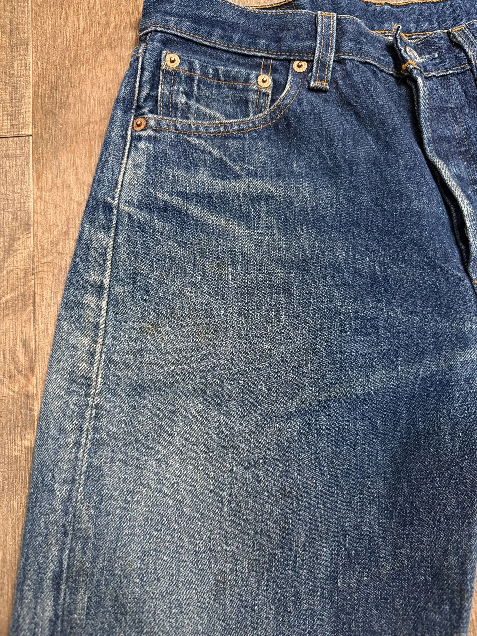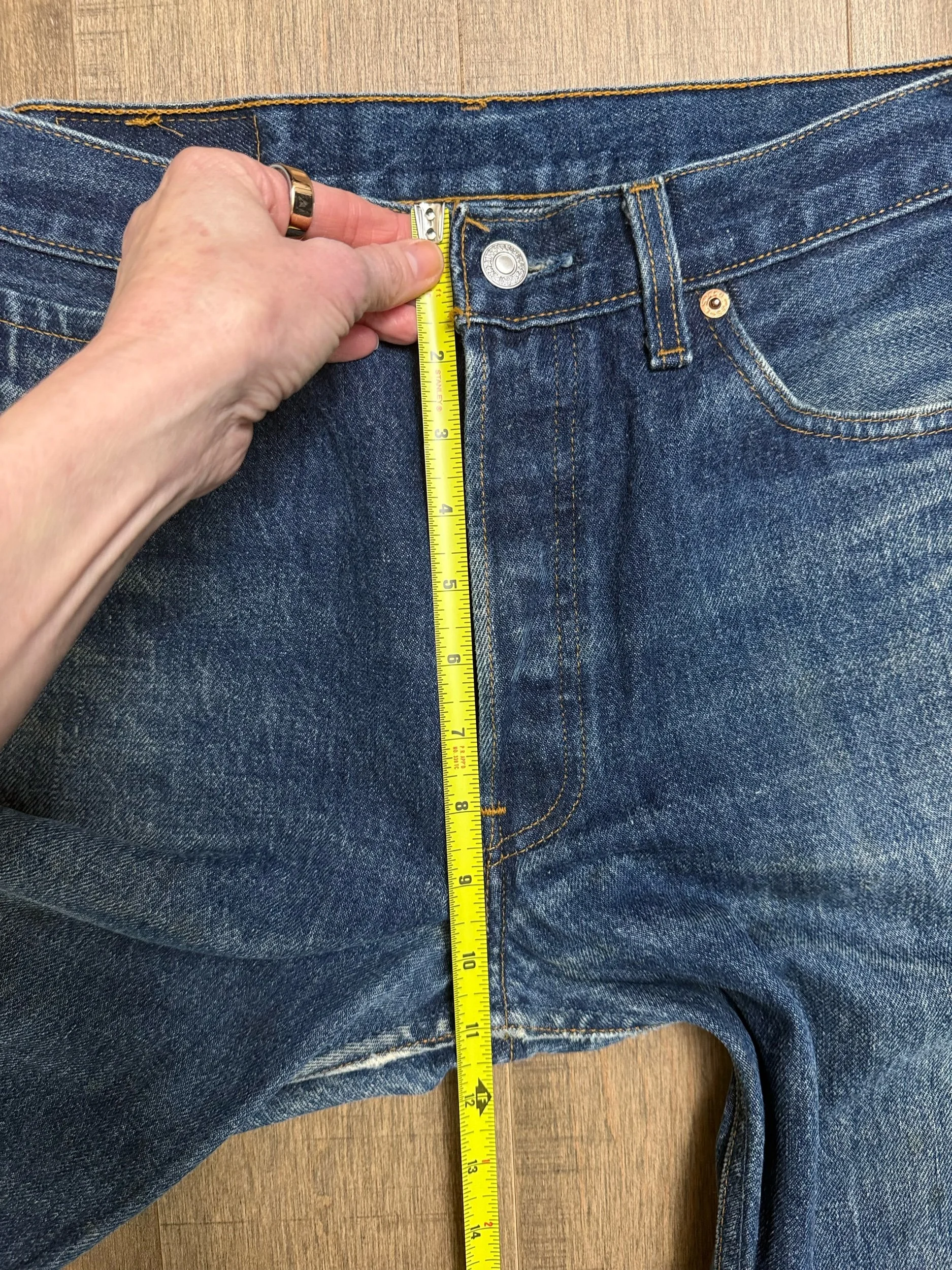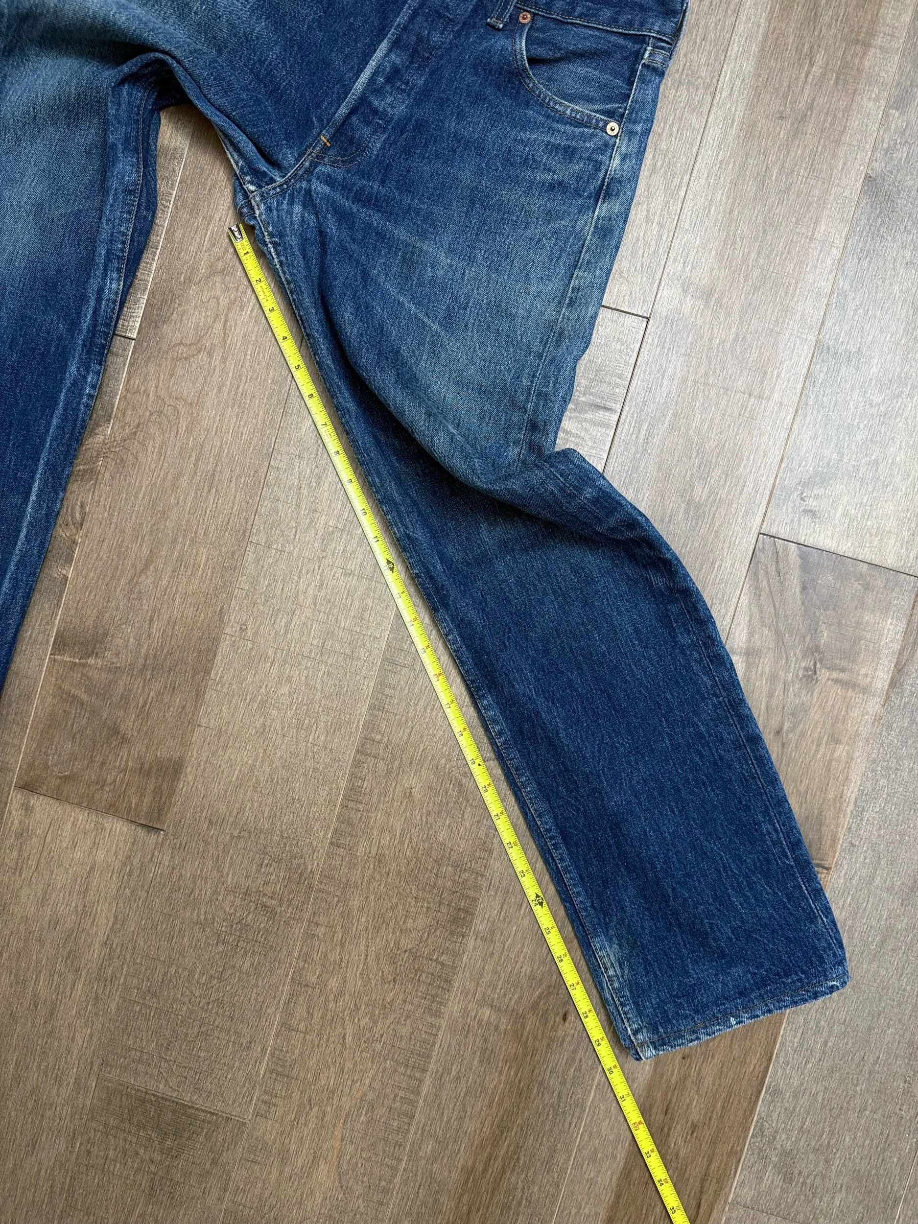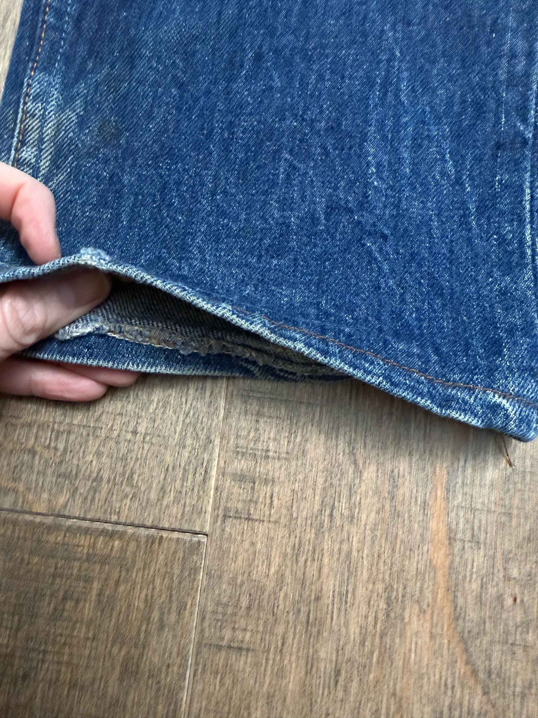 WASH: gorgeous dark blue wash with FIRE organic sun fades, some signs of wear as shown in photos. Shortened decades ago with natural wear at hem bottoms. WOW