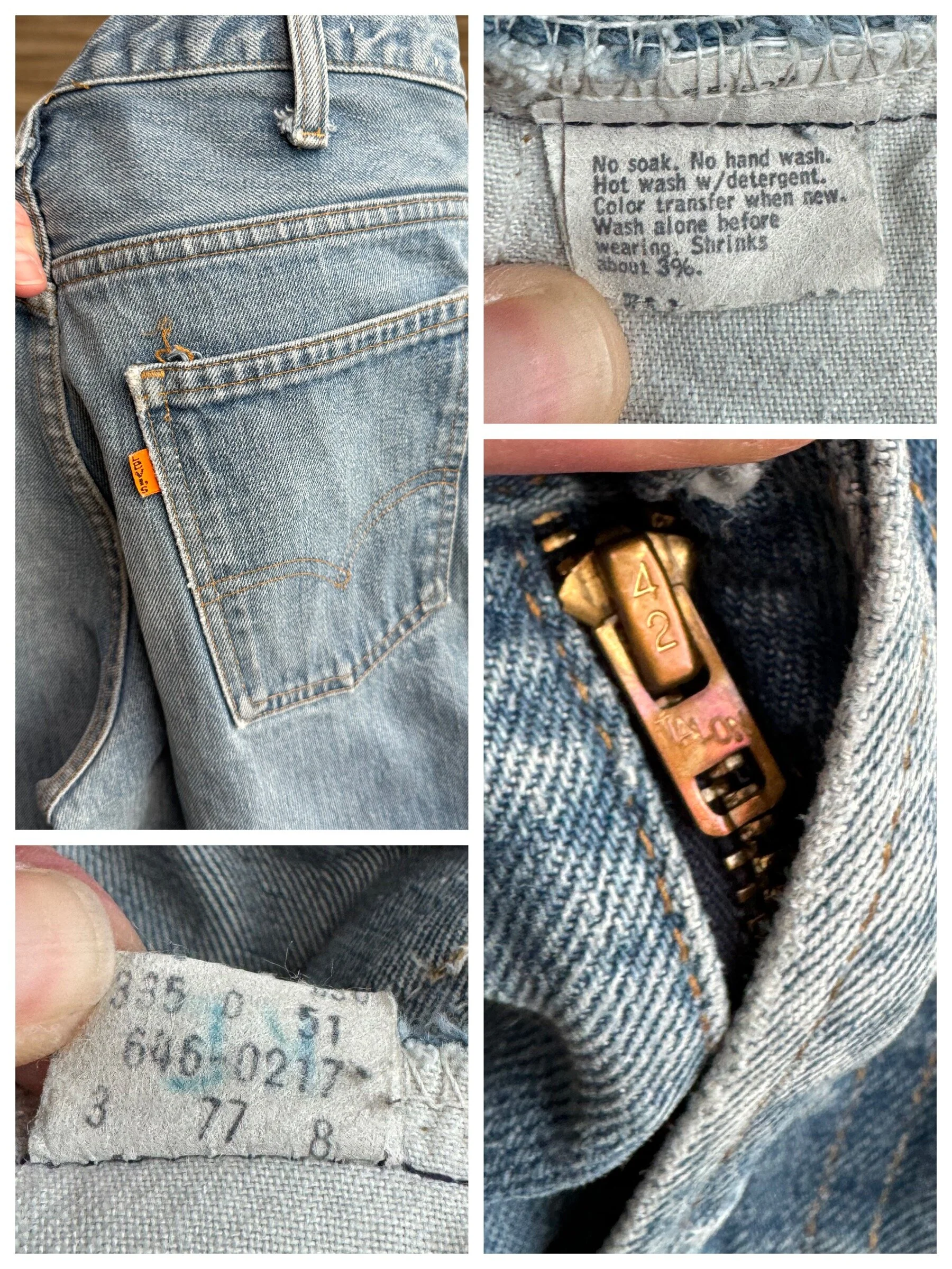 Keep in mind, vintage jeans are not new jeans. Every pair is at least 20 years old, most are older. This means they’ve been worn and likely have signs of wear - i.e. thinning areas, loose threads, signs of previous repair work, discolorations, faint (or not so faint stains), organic distressing, wear at the rivets, wear at the button holes. I do my best to describe these areas/signs of wear&tear, so please - before you buy - understand that you may receive your jeans and there will be signs of aging. Most buy vintage jeans wanting this, but if you want pristine new looking jeans, vintage likely isn’t for you. And that’s A-OK!