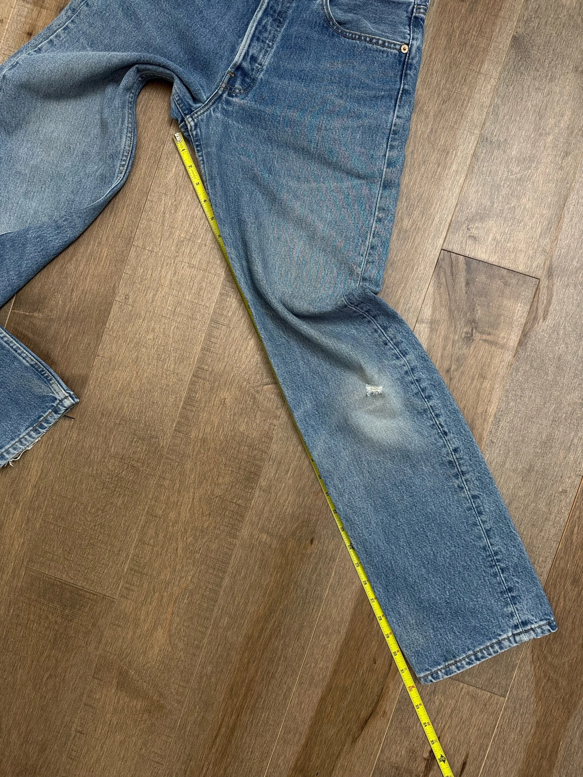 WASH: beautiful classic medium blue wash with perfect organic sun fades, knee distress. (Can be repaired for a fee, just email me through website)