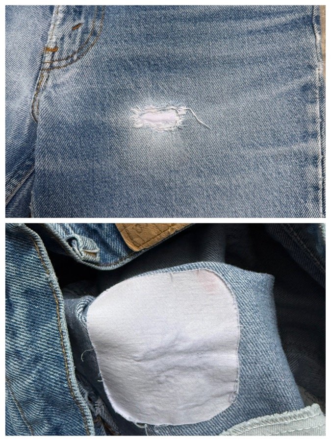 WASH: beautiful light medium blue wash with epic organic sun fades and minor distress. The whole under the left front pocket has been patched from the inside. See pictures.