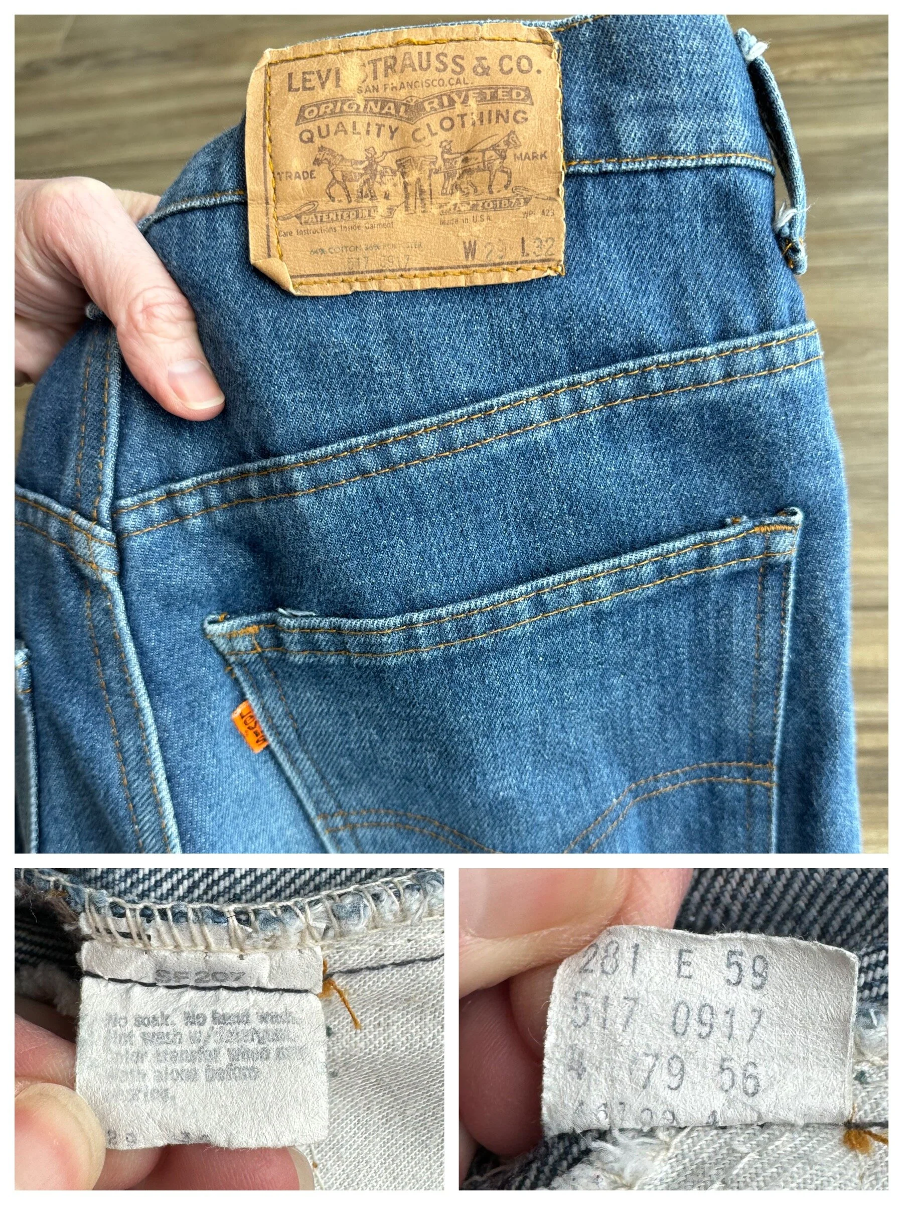 Keep in mind, vintage jeans are not new jeans. Every pair is at least 20 years old, most are older. This means they’ve been worn and likely have signs of wear - i.e. thinning areas, loose threads, signs of previous repair work, discolorations, faint (or not so faint stains), organic distressing, wear at the rivets, wear at the button holes. I do my best to describe these areas/signs of wear&tear, so please - before you buy - understand that you may receive your jeans and there will be signs of aging. Most buy vintage jeans wanting this, but if you want pristine new looking jeans, vintage likely isn’t for you. And that’s A-OK!