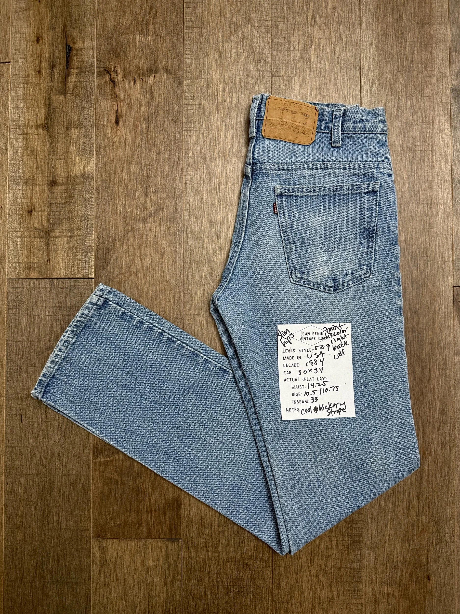 WASH: rare cool medium blue wash with awesome hickory stripe weave — faint discoloration back of right calf