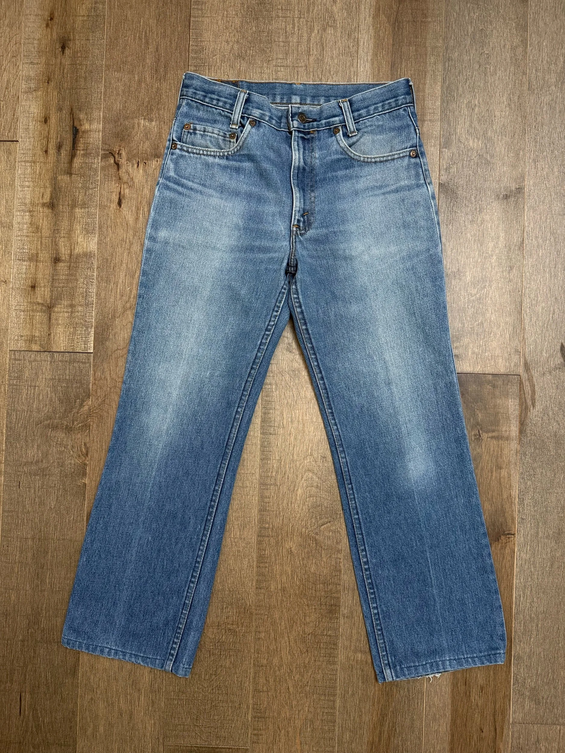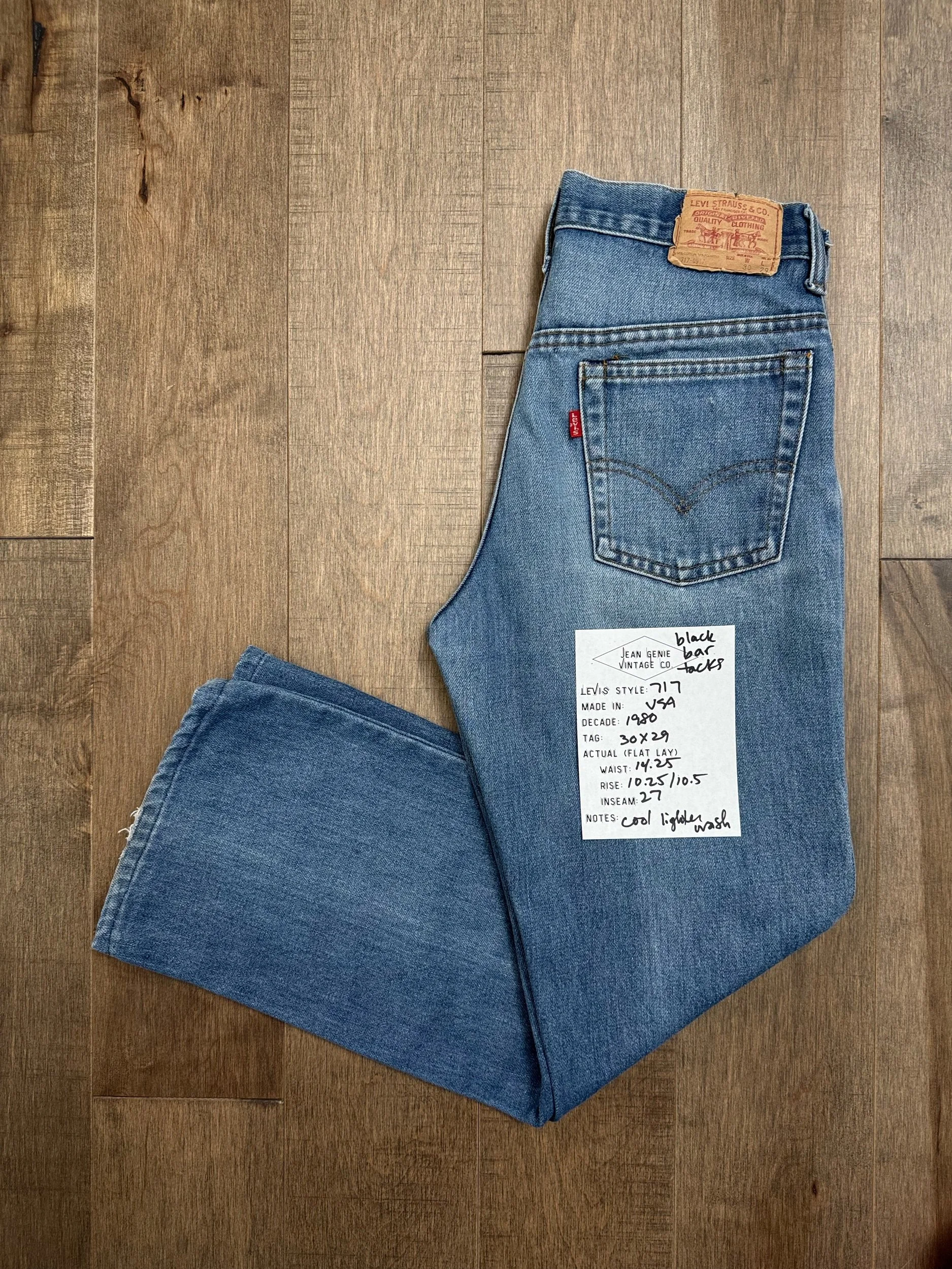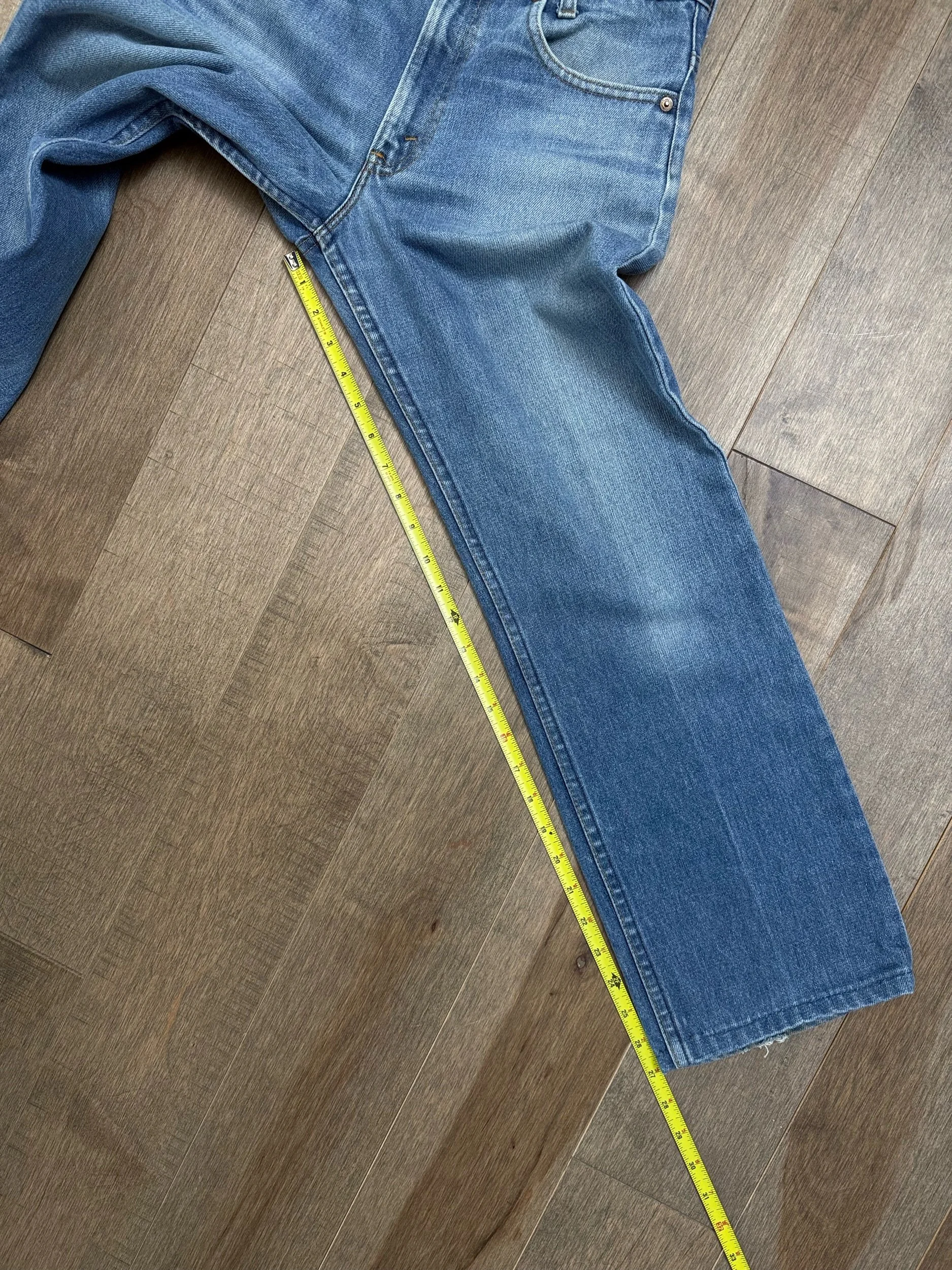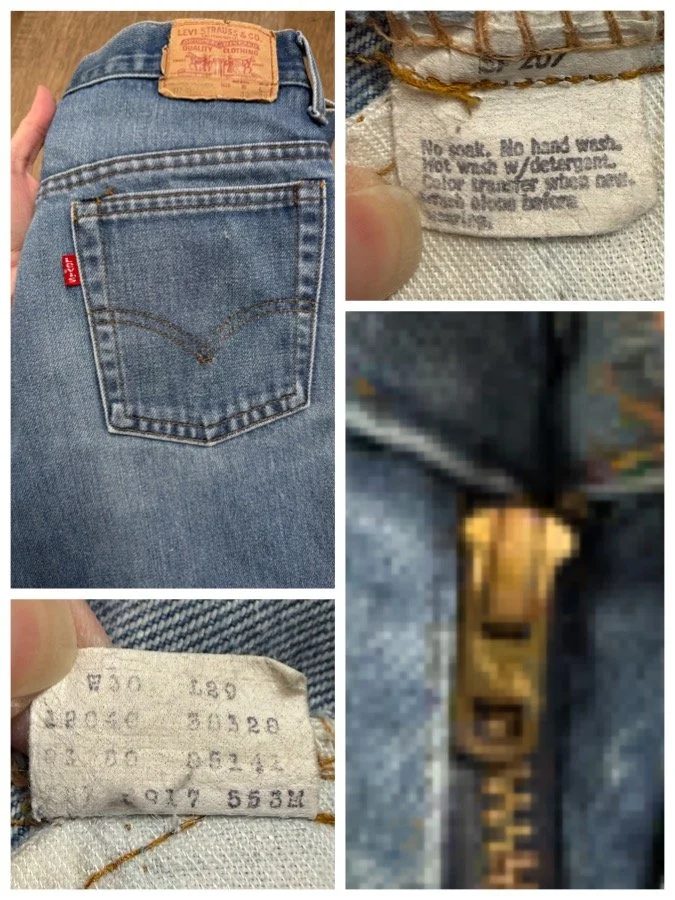 WASH: beautiful light blue wash with awesome perfect sun fades. Shortened decades ago with natural hem wear at bottoms. Black bar tacks the collectors love!
