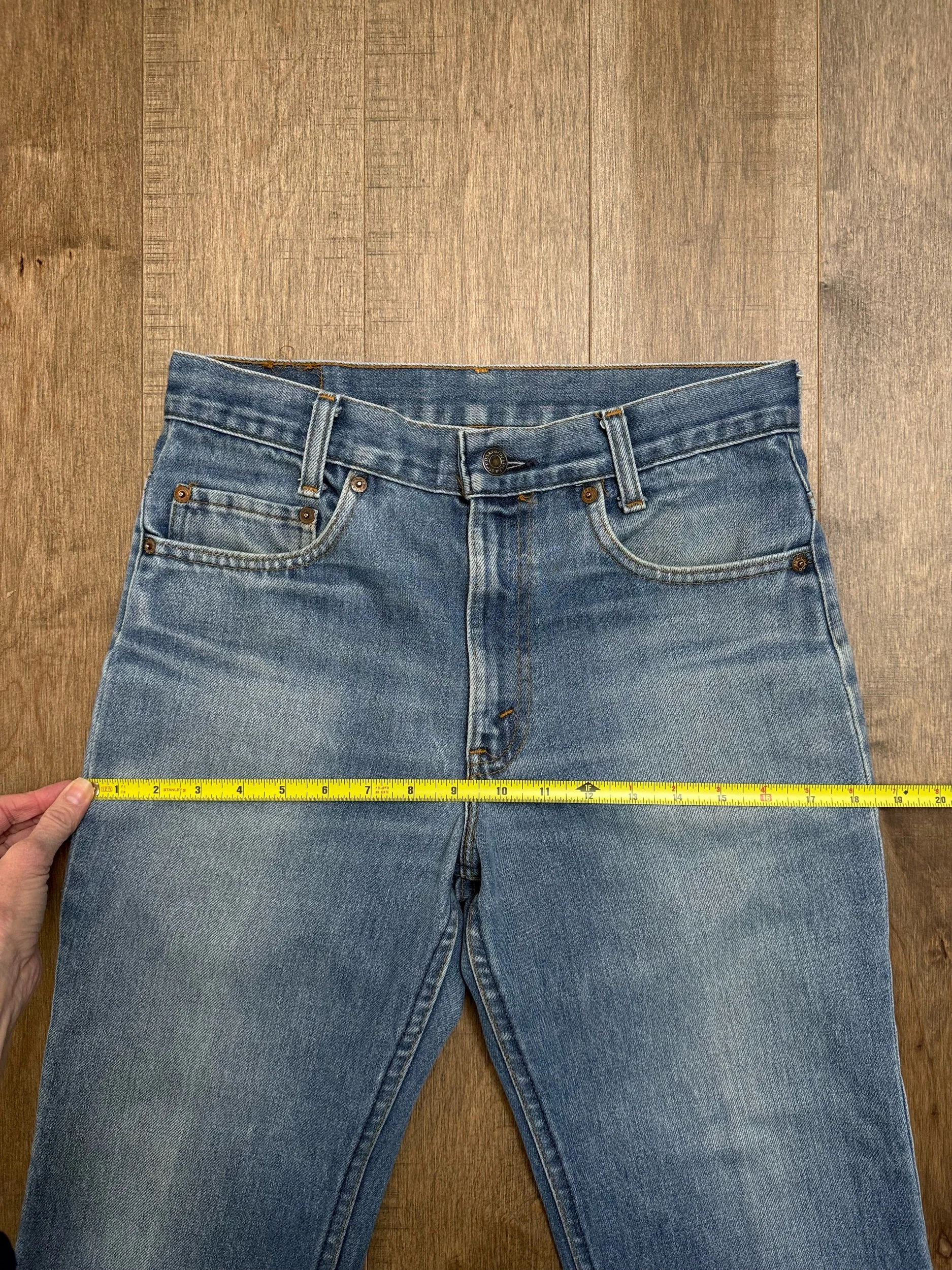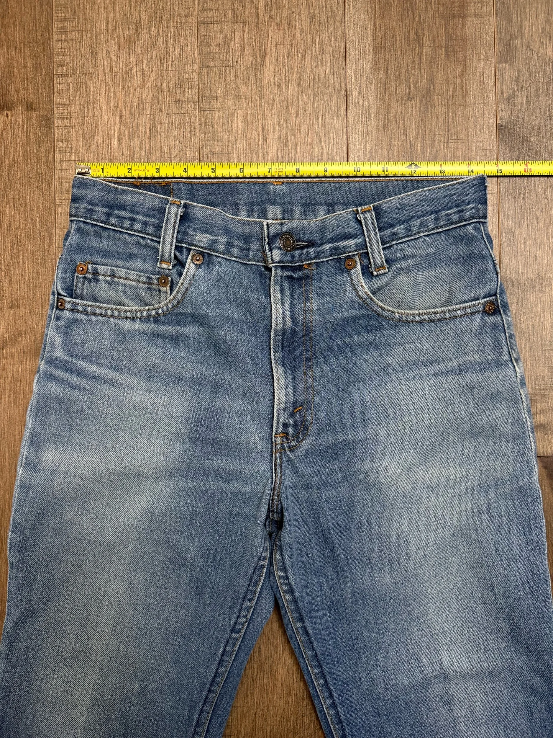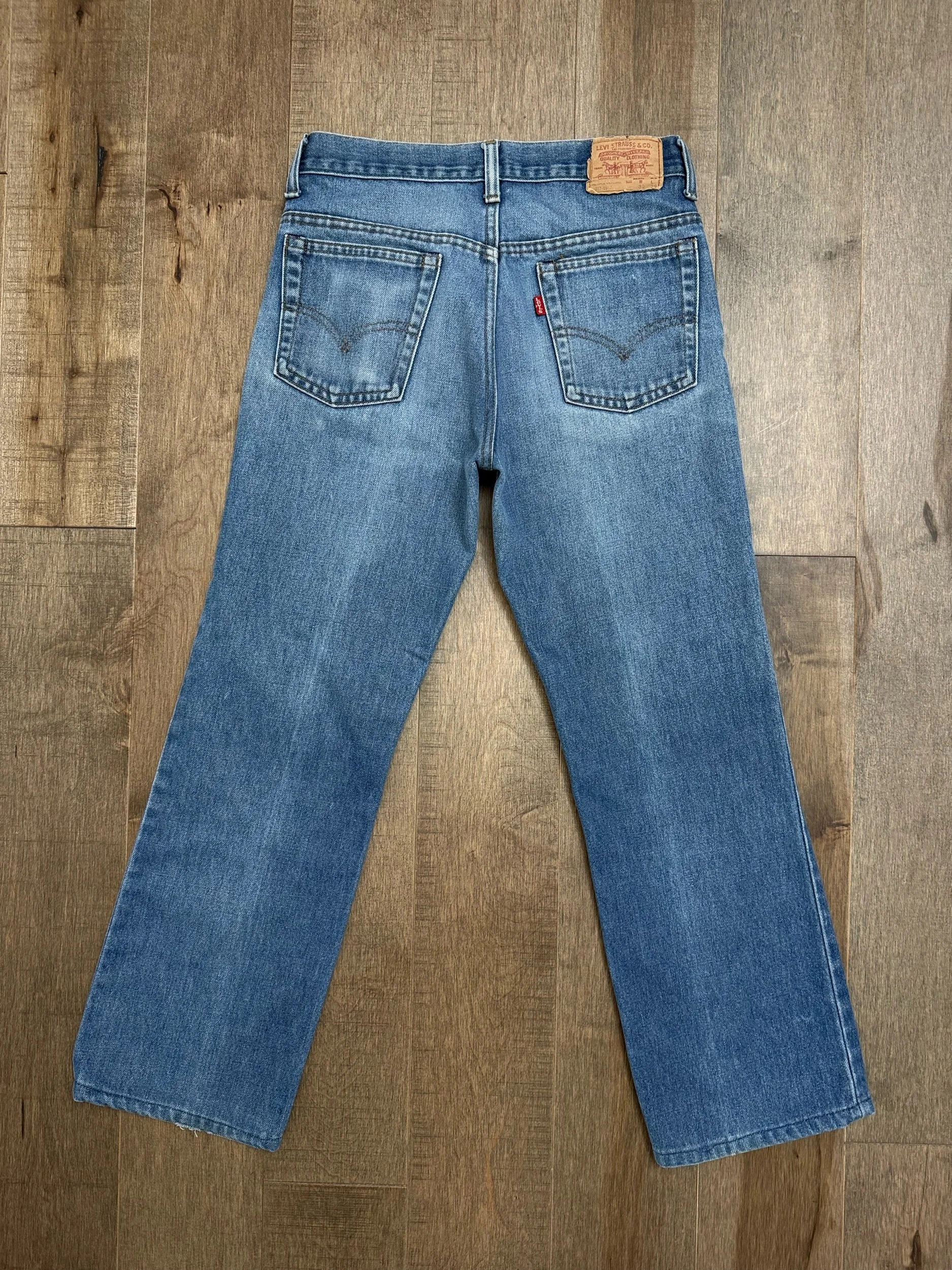 WASH: beautiful light blue wash with awesome perfect sun fades. Shortened decades ago with natural hem wear at bottoms. Black bar tacks the collectors love!