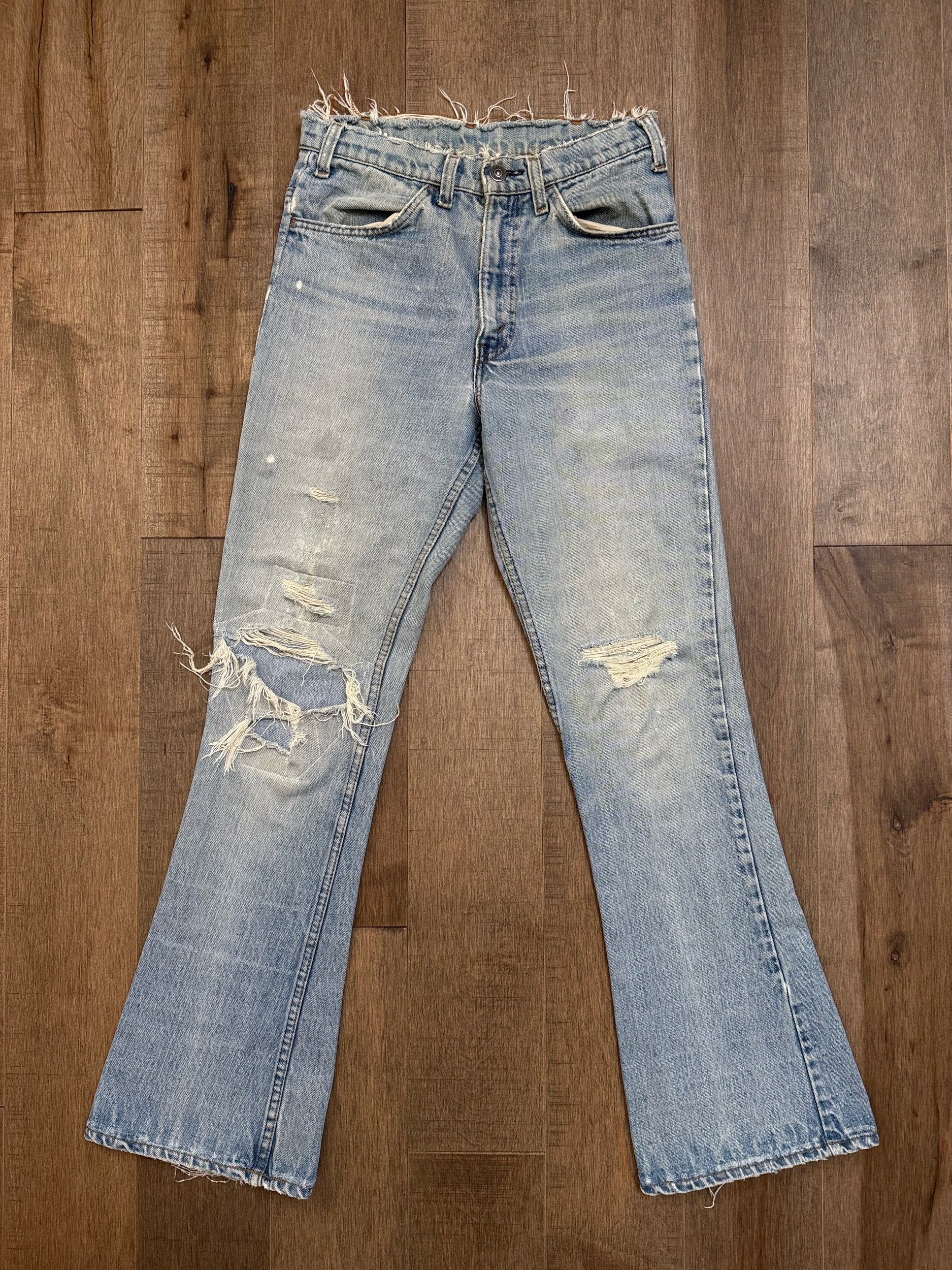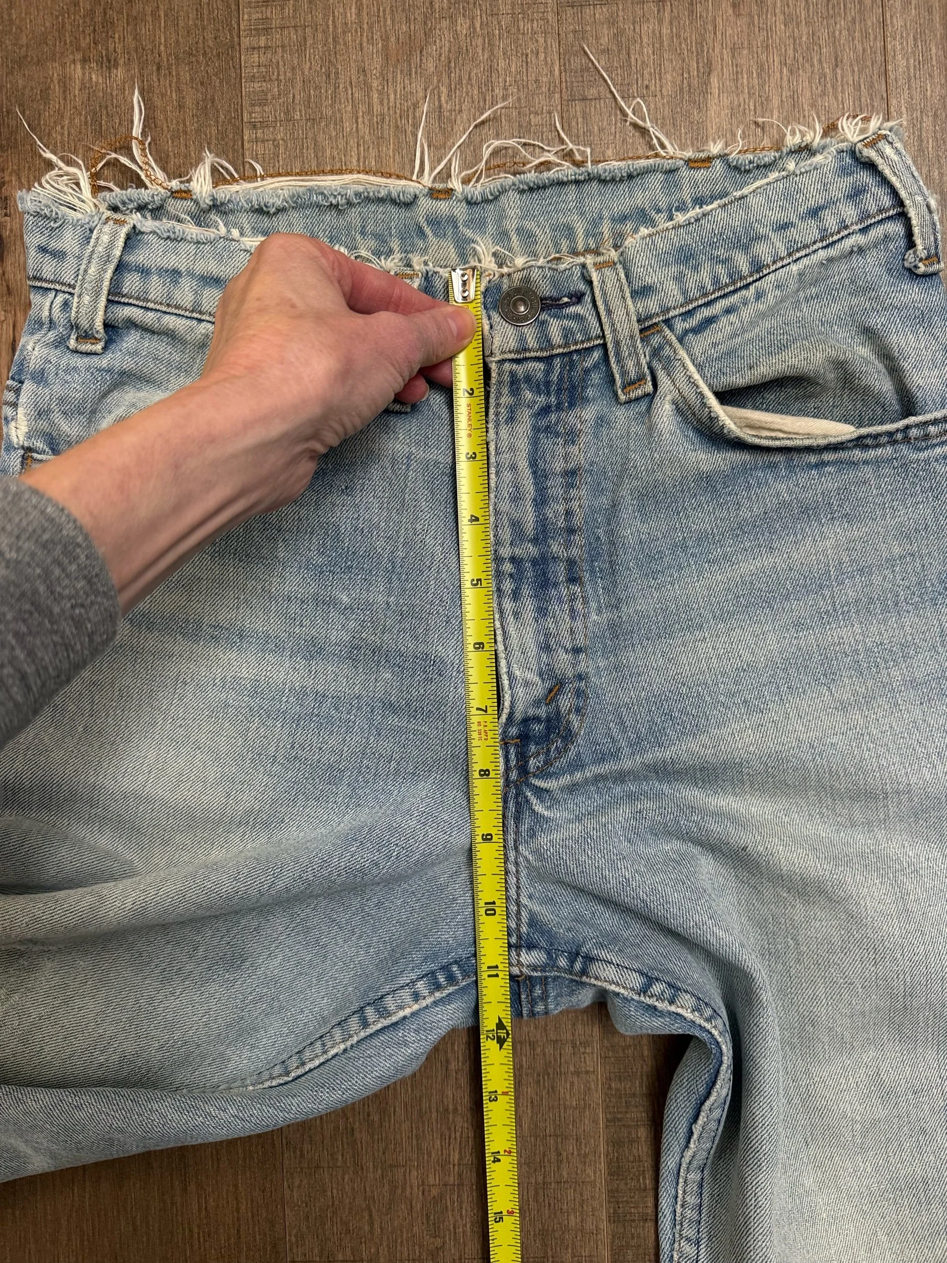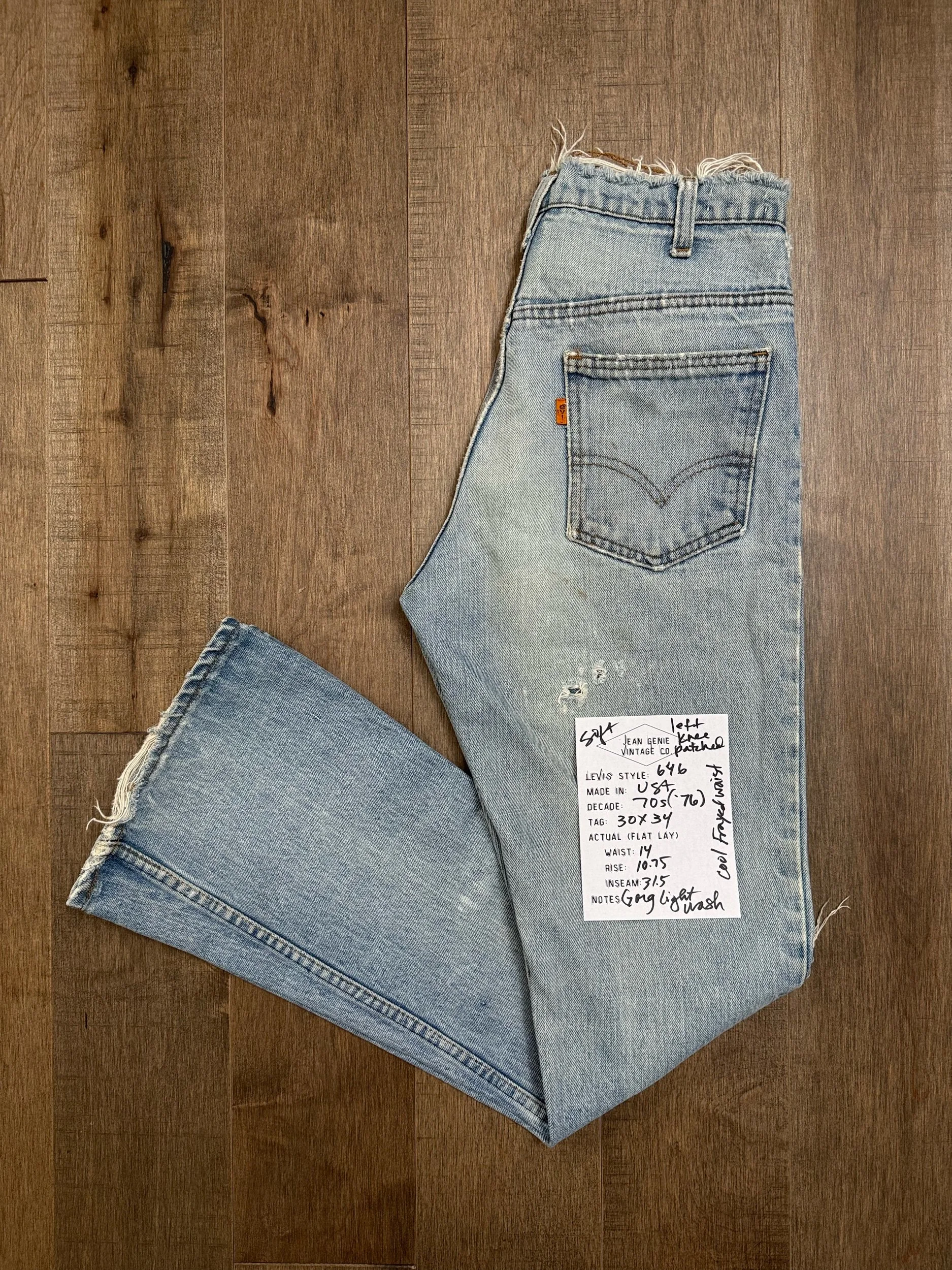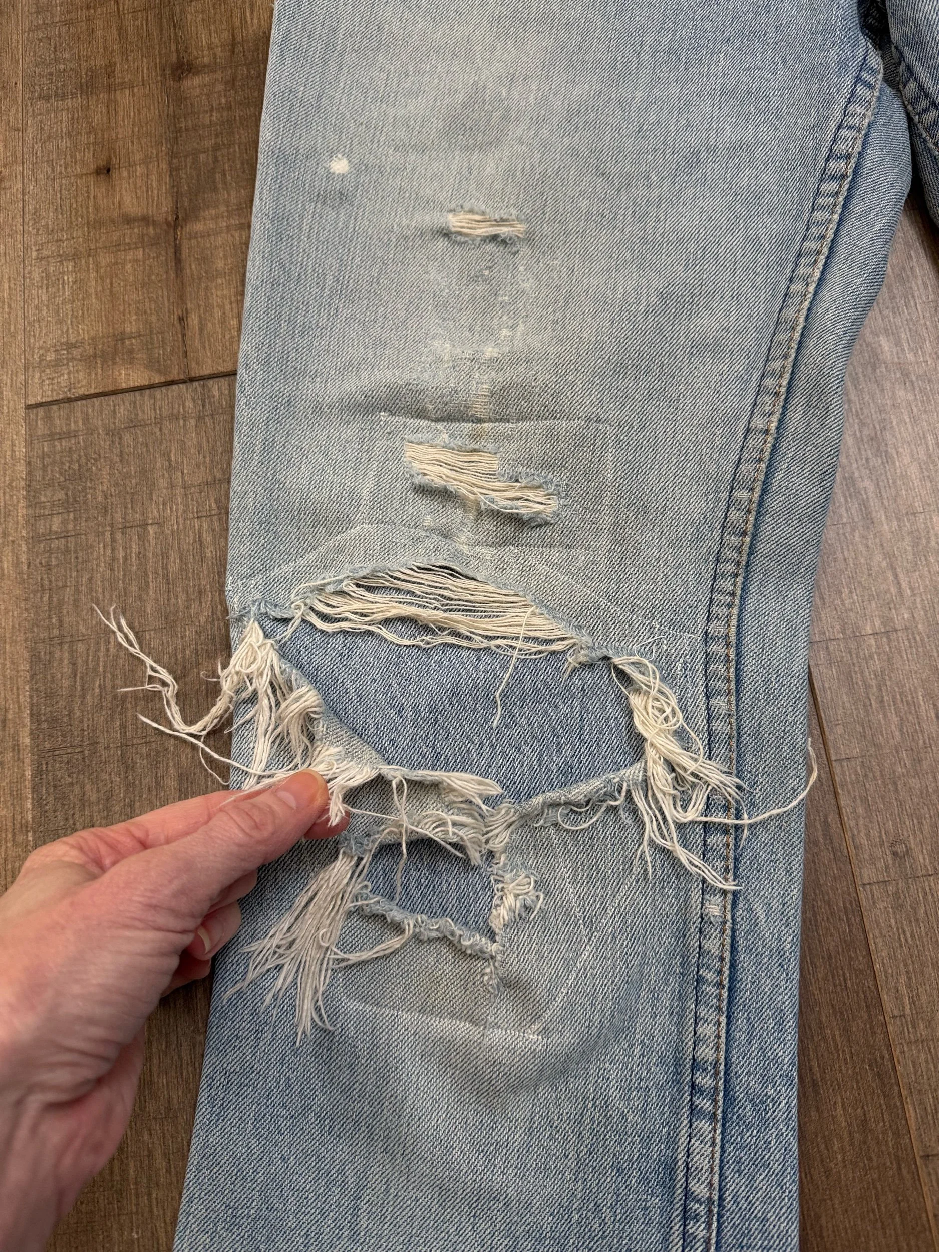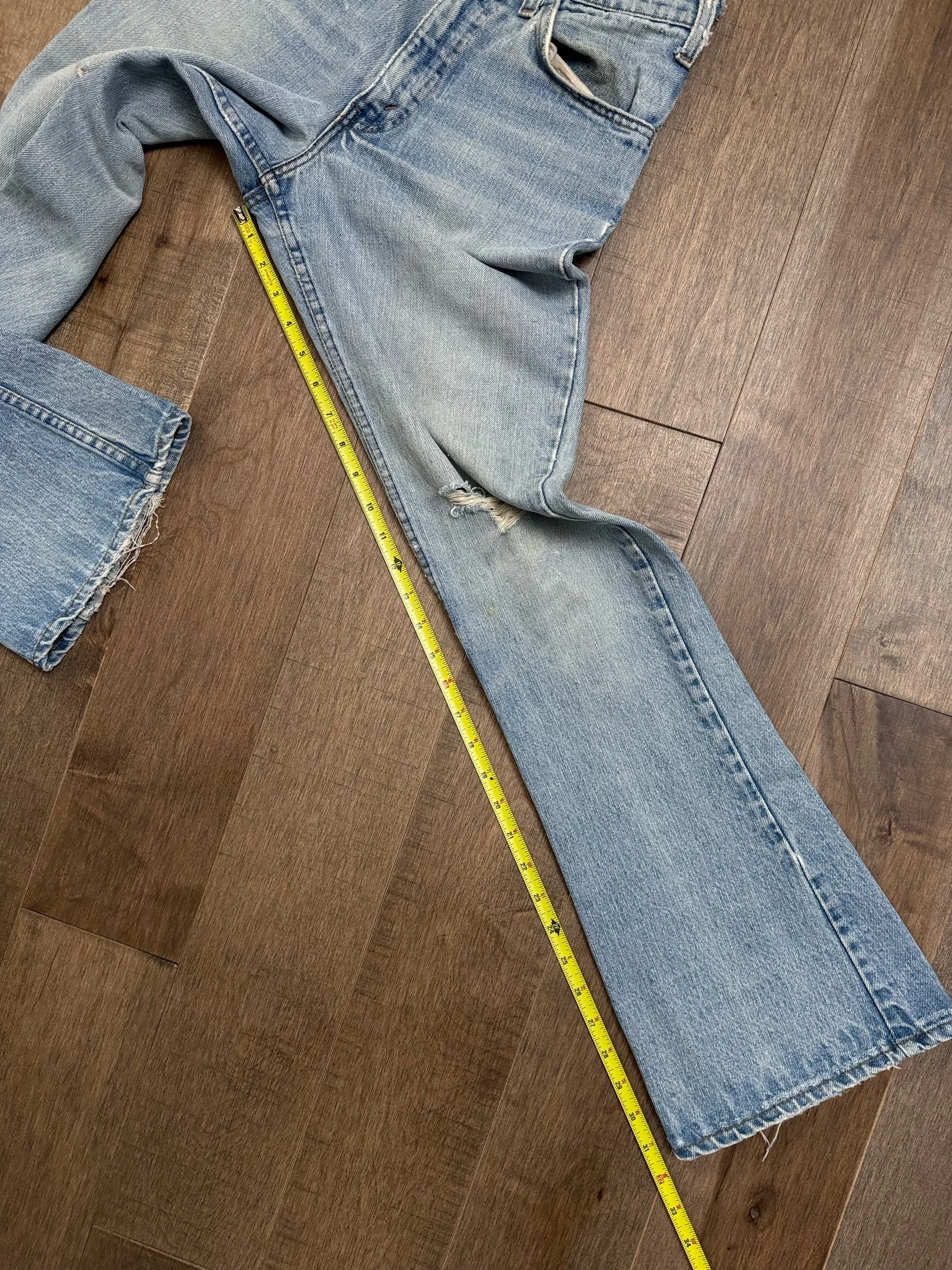 WASH: stunning light blue wash with awesome organic sun fades, frayed waist band (SICK), right knee and back right thigh distress has been patched closed from the inside. Left knee tear still open