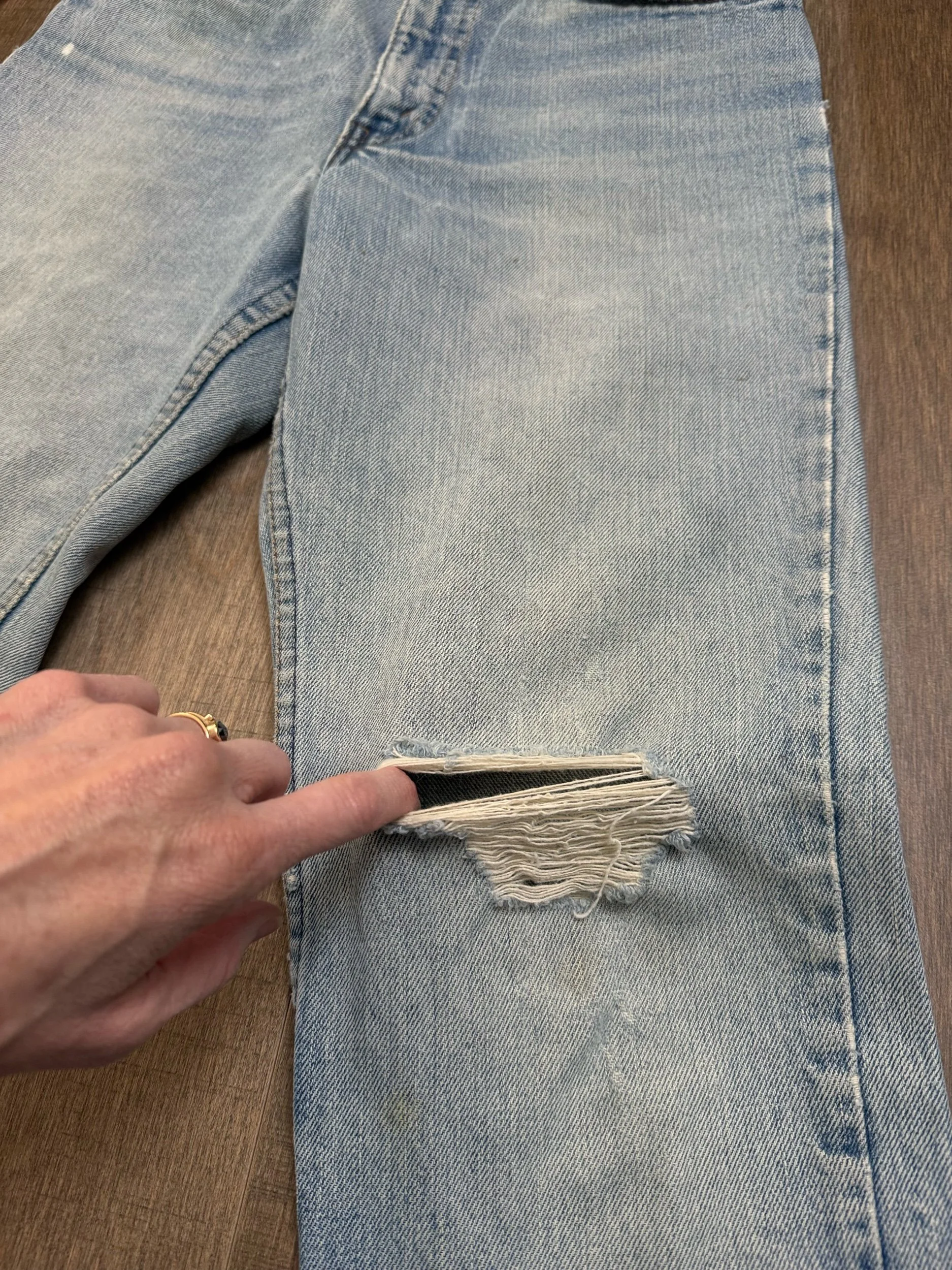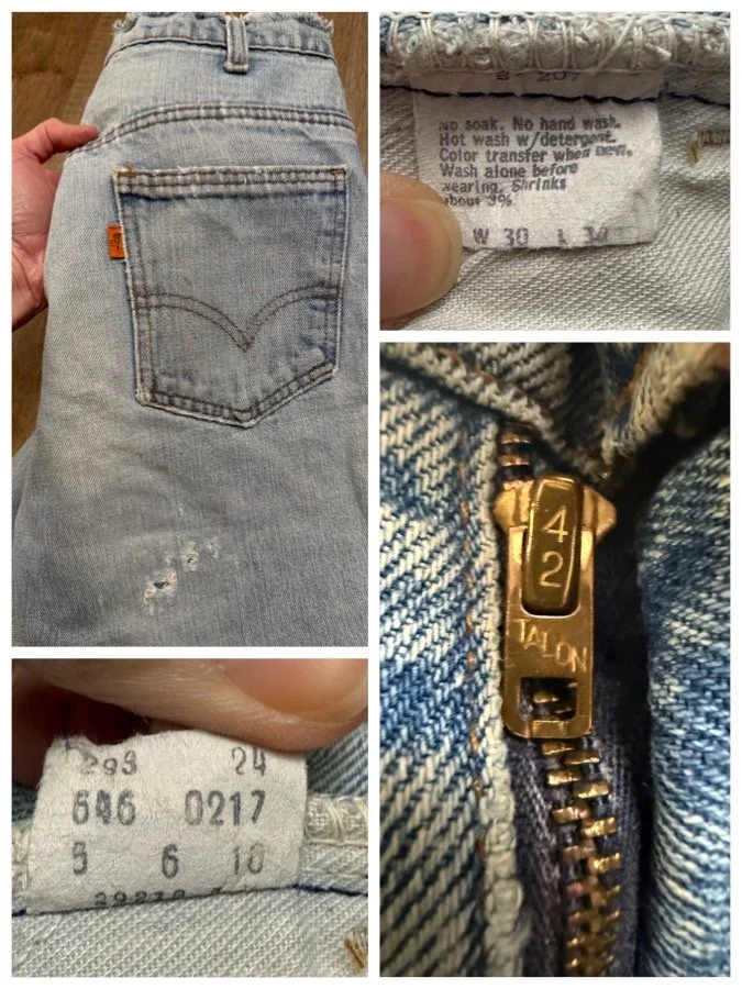 Keep in mind, vintage jeans are not new jeans. Every pair is at least 20 years old, most are older. This means they’ve been worn and likely have signs of wear - i.e. thinning areas, loose threads, signs of previous repair work, discolorations, faint (or not so faint stains), organic distressing, wear at the rivets, wear at the button holes. I do my best to describe these areas/signs of wear&tear, so please - before you buy - understand that you may receive your jeans and there will be signs of aging. Most buy vintage jeans wanting this, but if you want pristine new looking jeans, vintage likely isn’t for you. And that’s A-OK! Also note, the word “vintage” is not synonymous with super worn & faded. Vintage means over 20 years old. An item can be both vintage and still be new or like new condition.