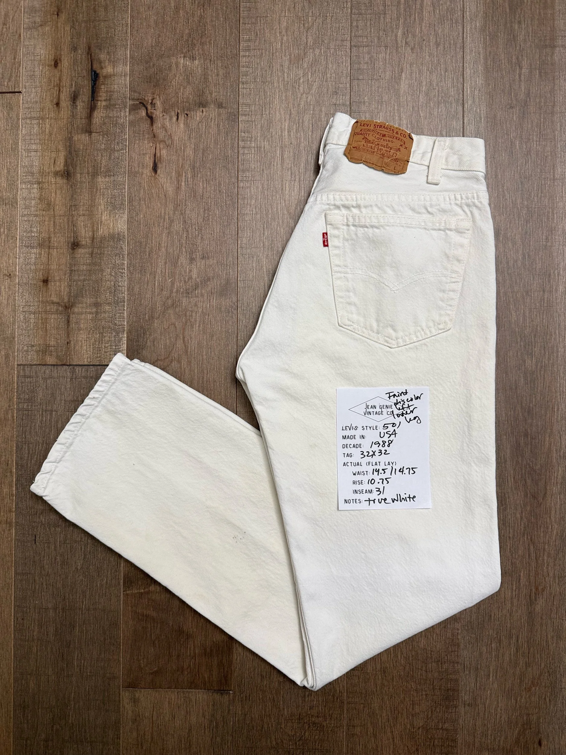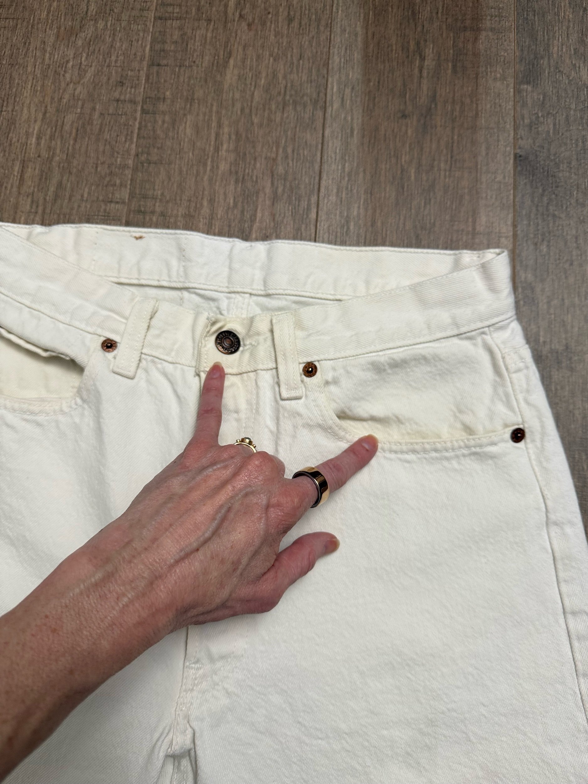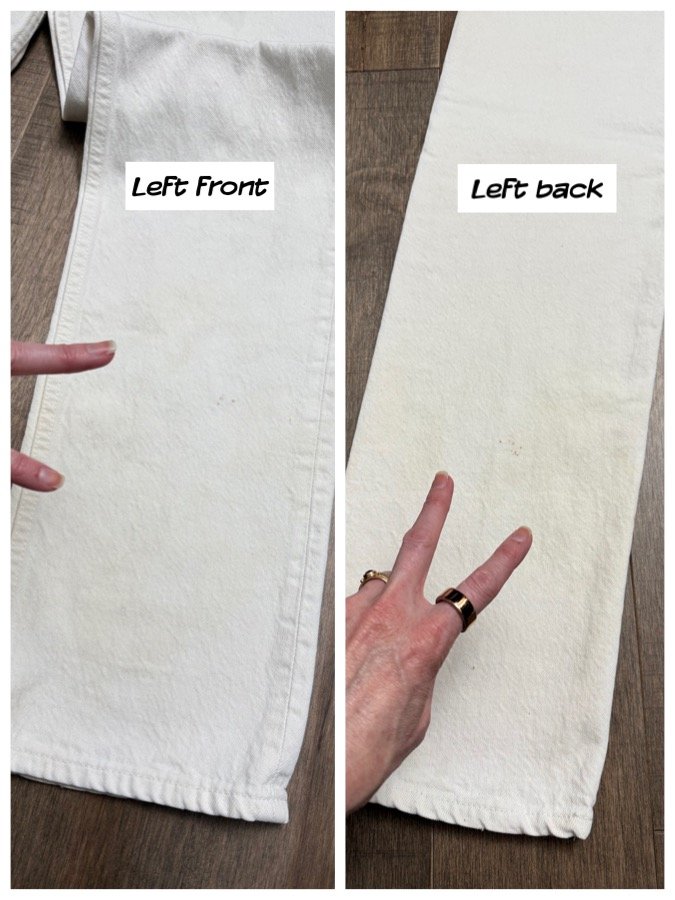 WASH: true white, faint discoloration near the top button / waistband. Very faint, discoloration, lower left leg, hard to pick up in the camera. Not noticeable from a distance. I have not tried to treat these stains.