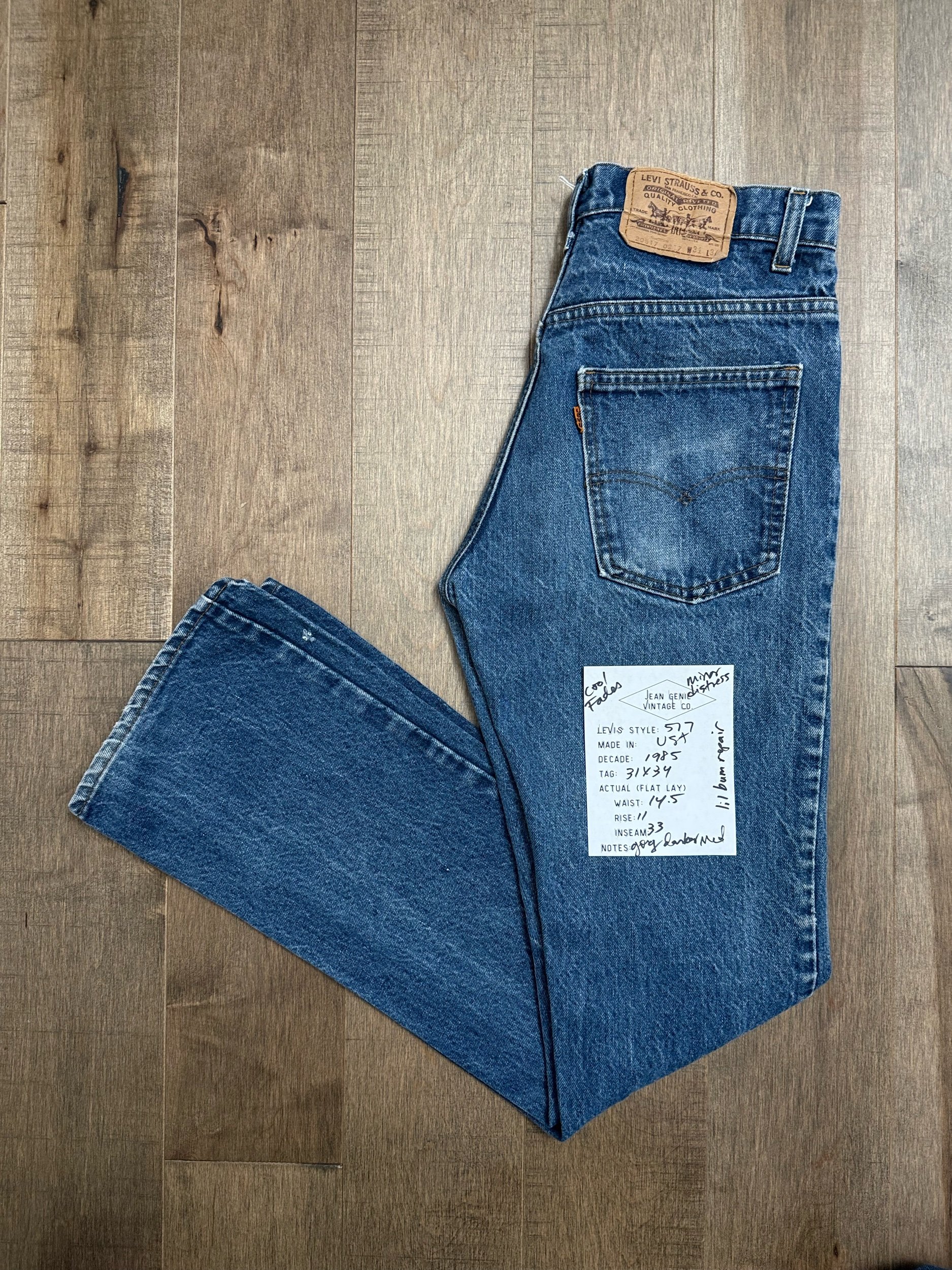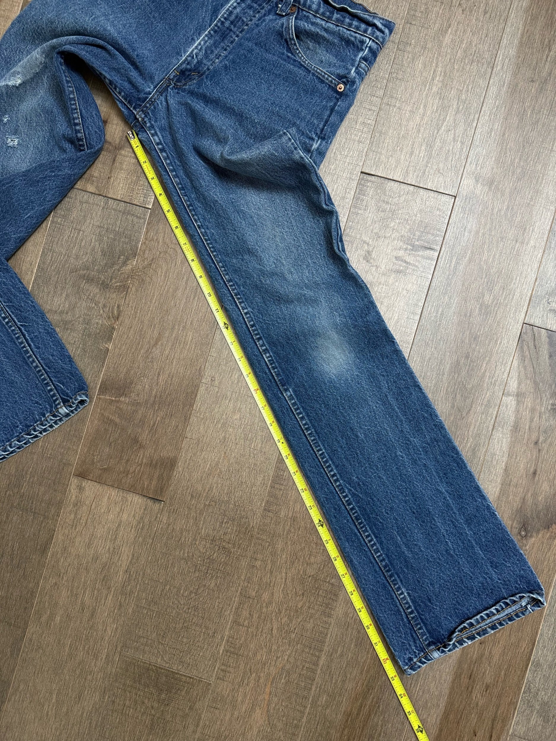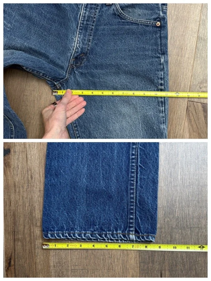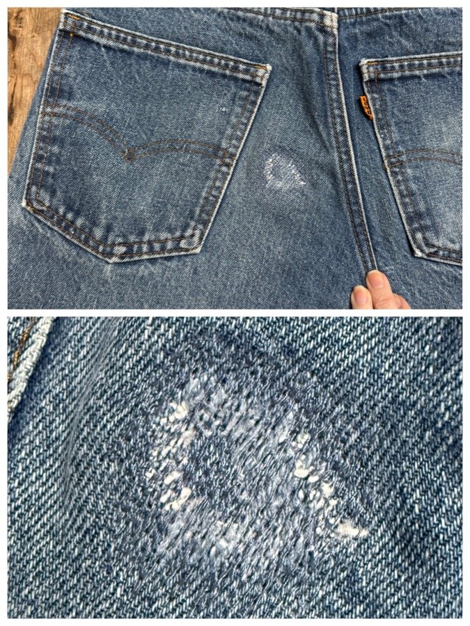 Keep in mind, vintage jeans are not new jeans. Every pair is at least 20 years old, most are older. This means they’ve been worn and likely have signs of wear - i.e. thinning areas, loose threads, signs of previous repair work, discolorations, faint (or not so faint stains), organic distressing, wear at the rivets, wear at the button holes. I do my best to describe these areas/signs of wear&tear, so please - before you buy - understand that you may receive your jeans and there will be signs of aging. Most buy vintage jeans wanting this, but if you want pristine new looking jeans, vintage likely isn’t for you. And that’s A-OK! Also note, the word “vintage” is not synonymous with super worn & faded. Vintage means over 20 years old. An item can be both vintage and still be new or like new condition.