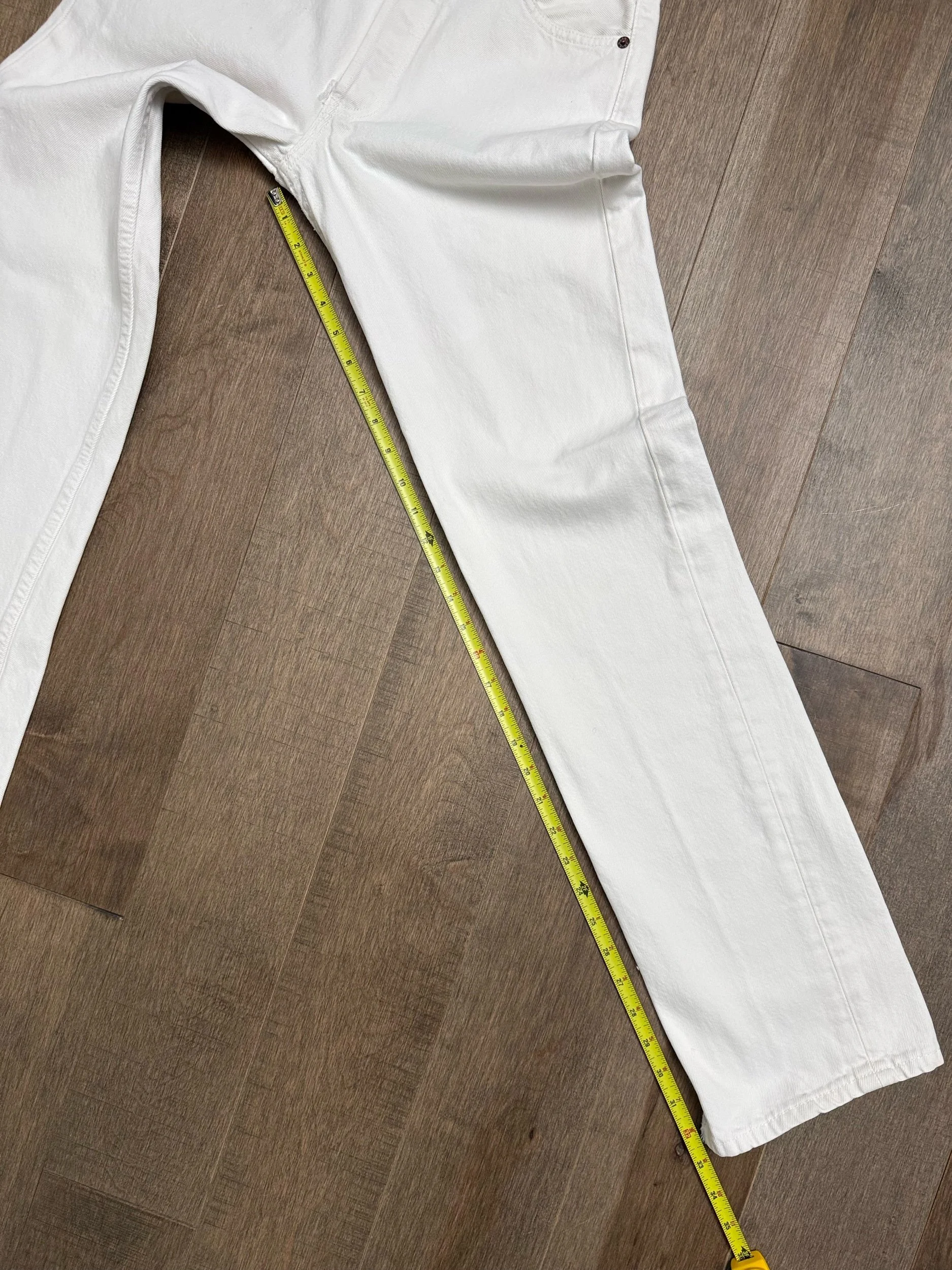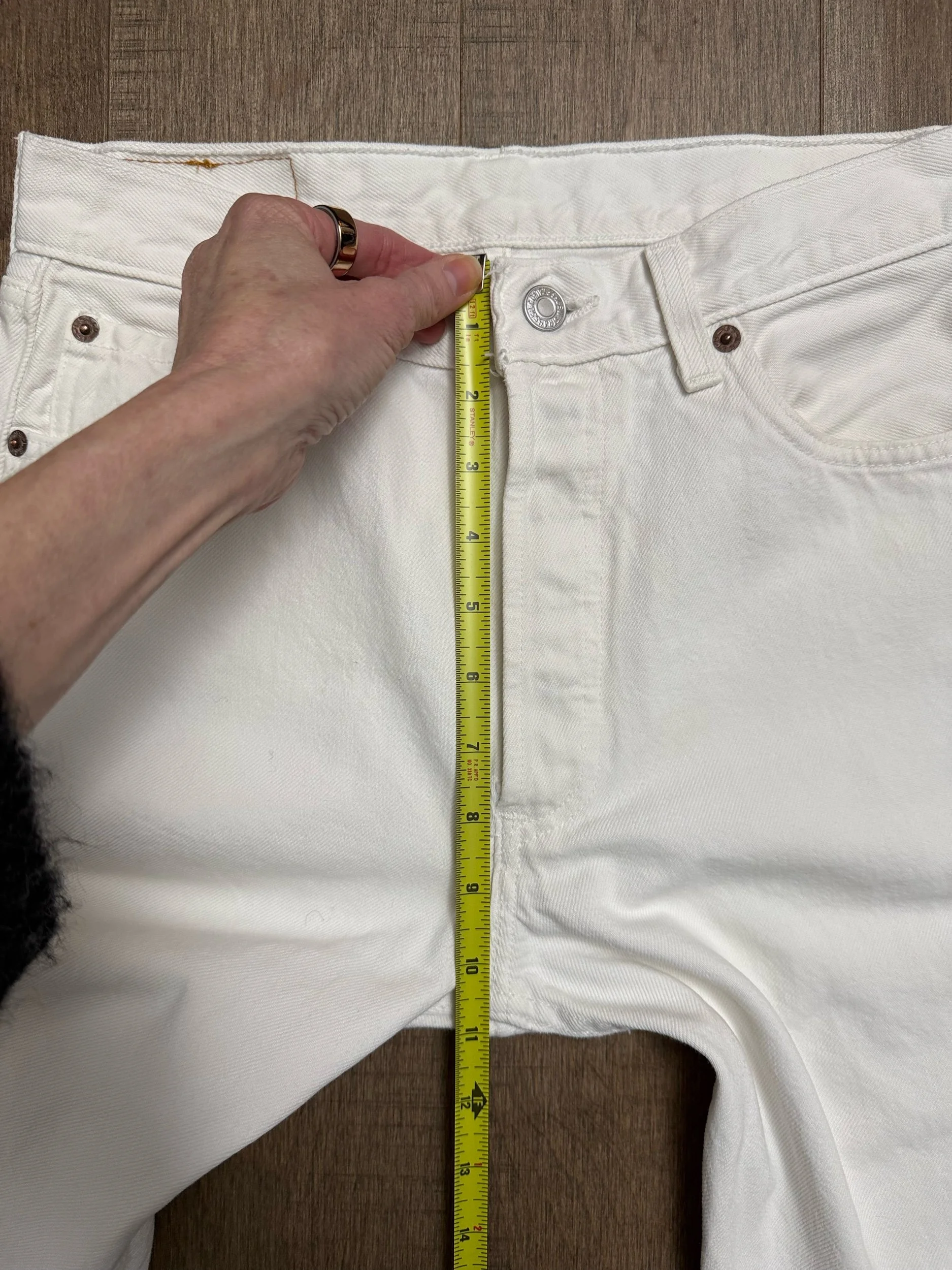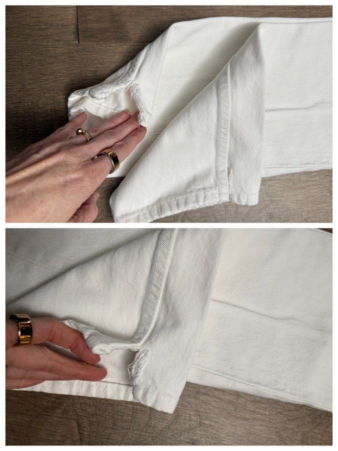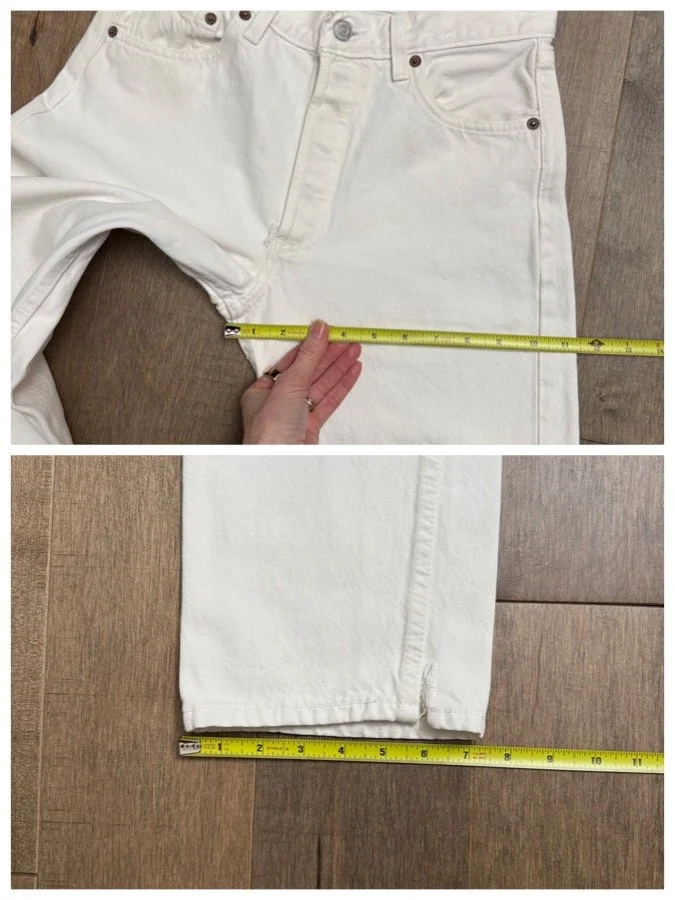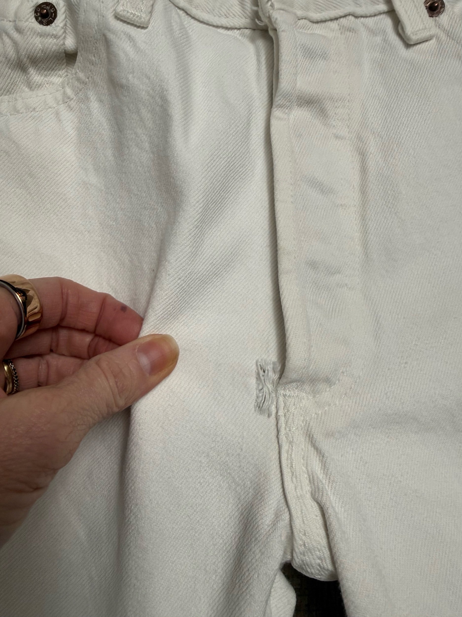 WASH: true white. Little 1-1.5” slits at ankle seam. Little repair by fly (Picture shows the distress, repair will be made prior to shipping)