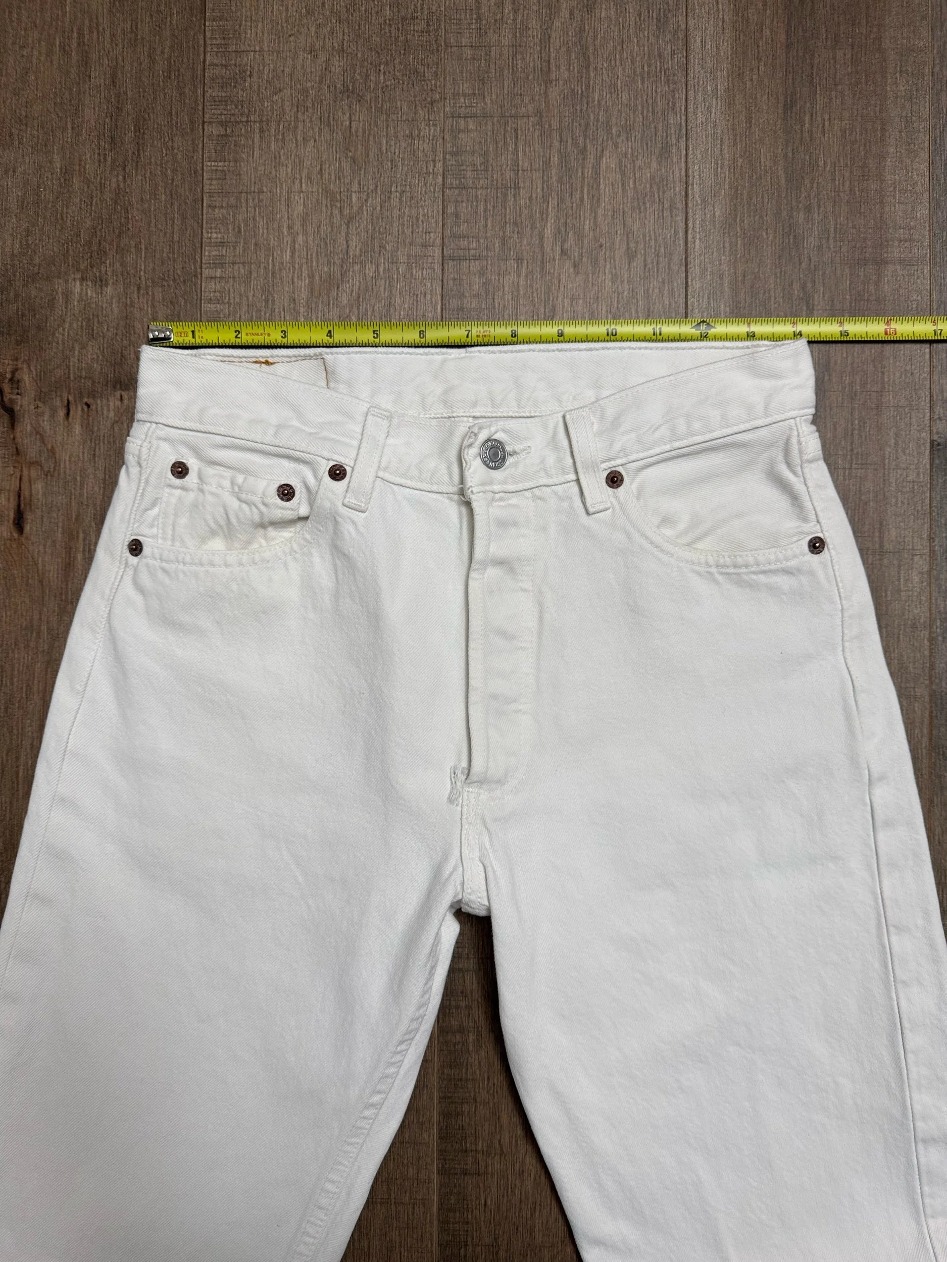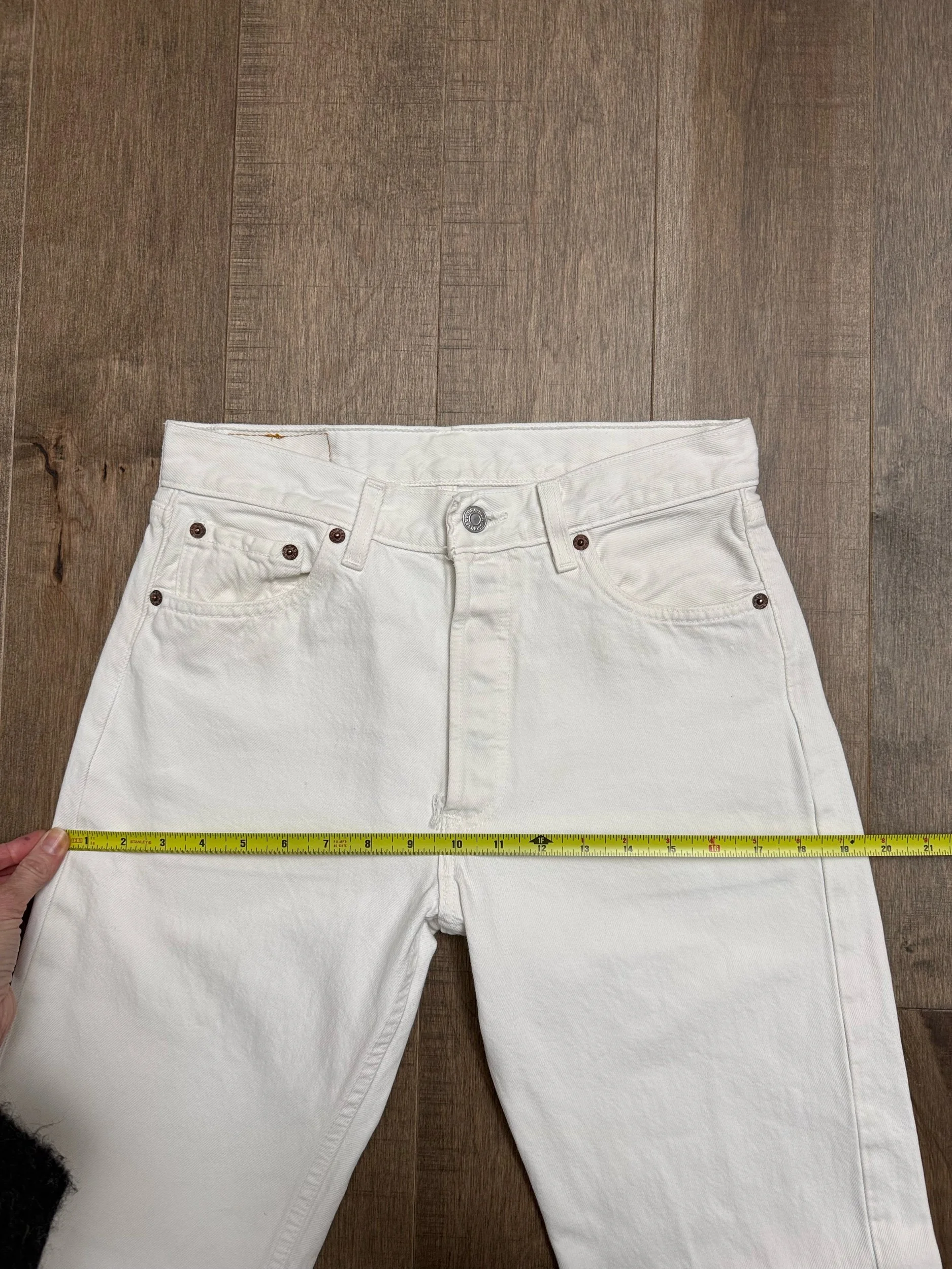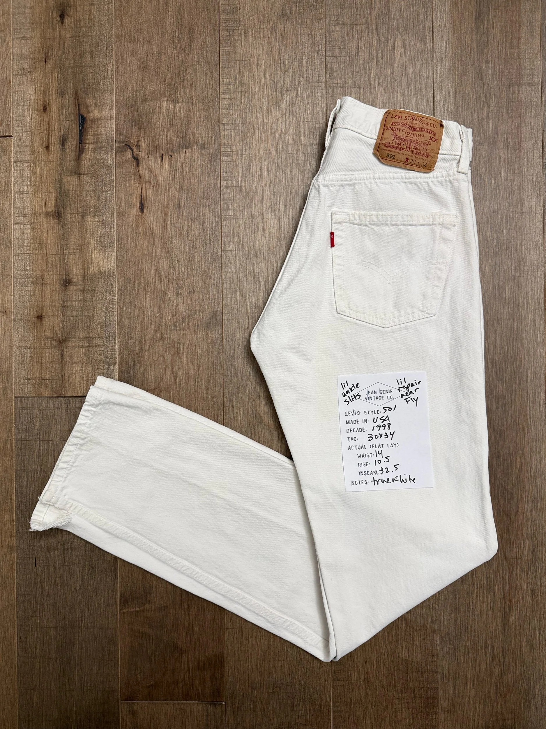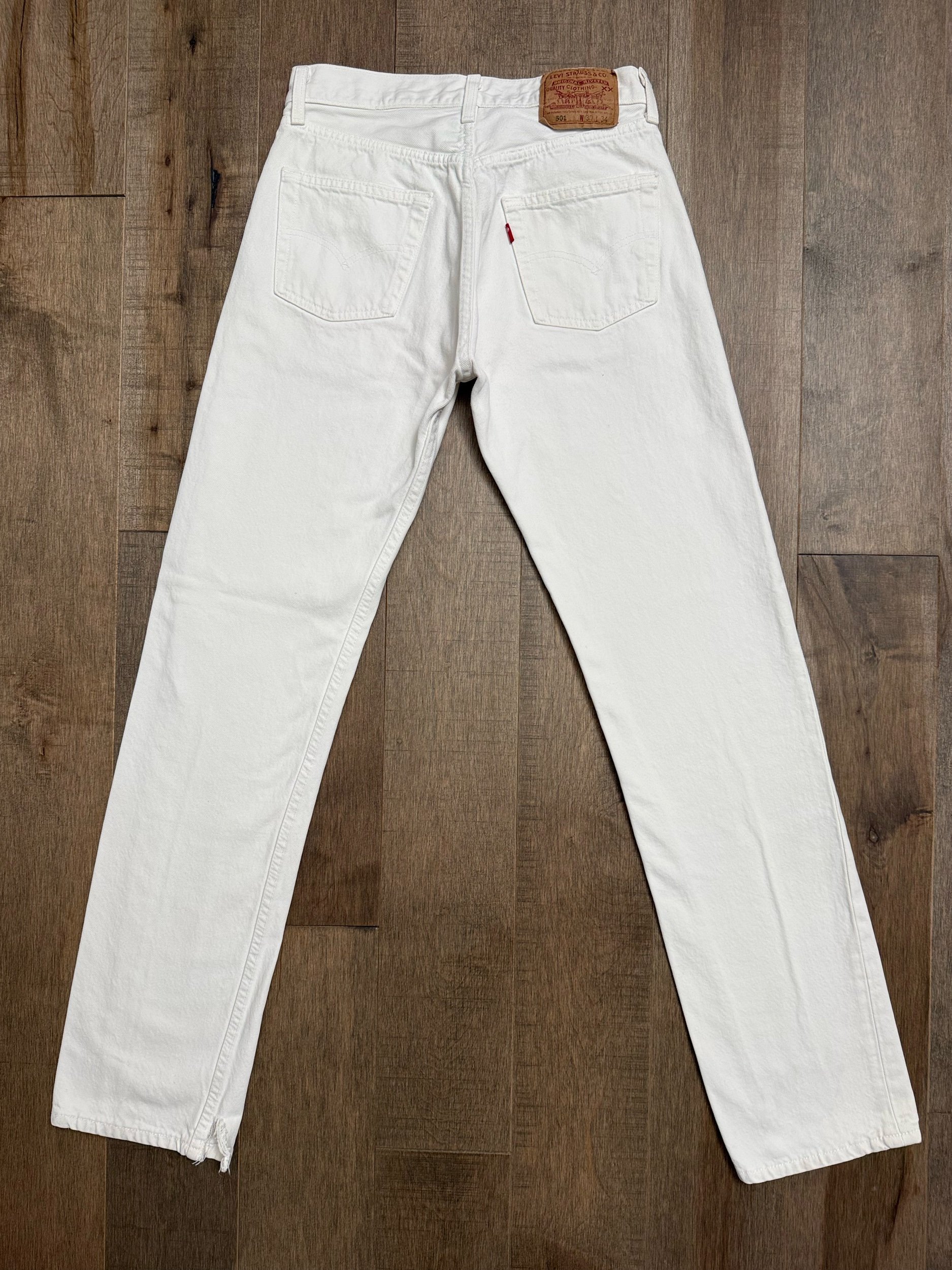 WASH: true white. Little 1-1.5” slits at ankle seam. Little repair by fly (Picture shows the distress, repair will be made prior to shipping)
