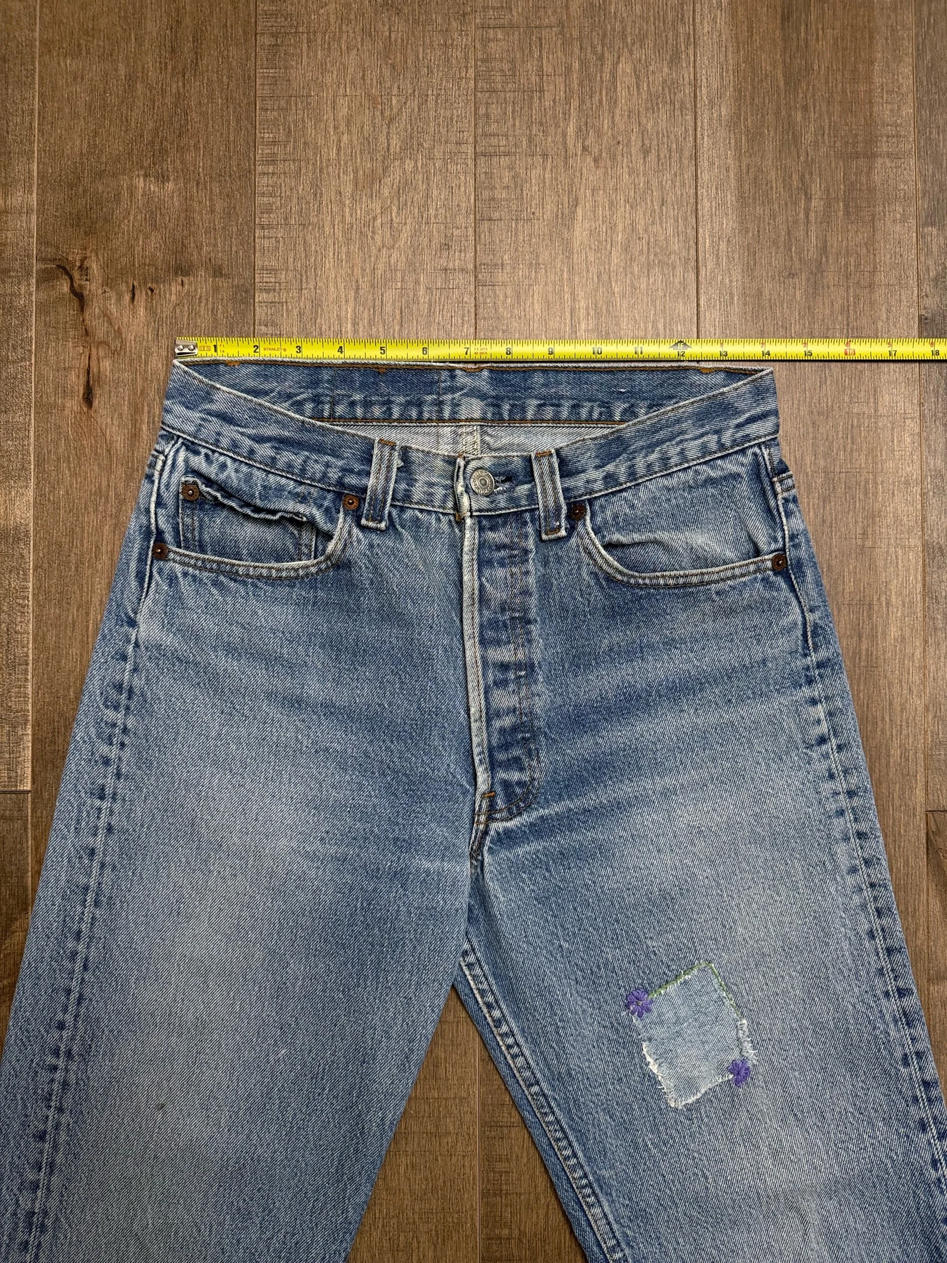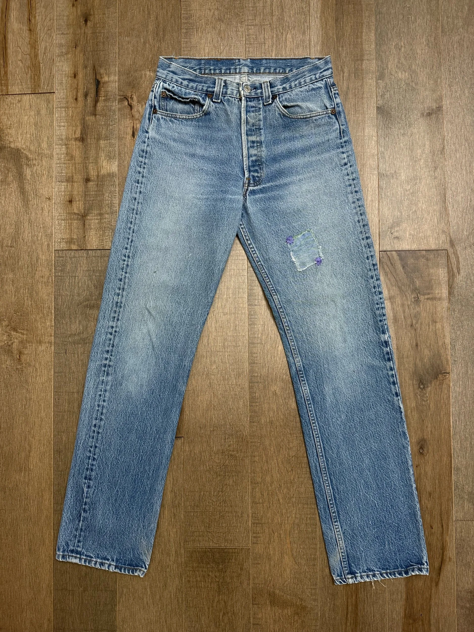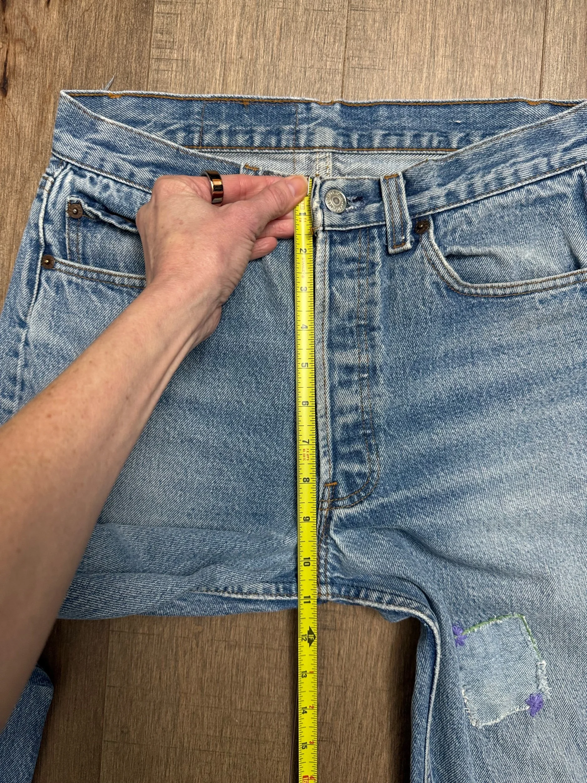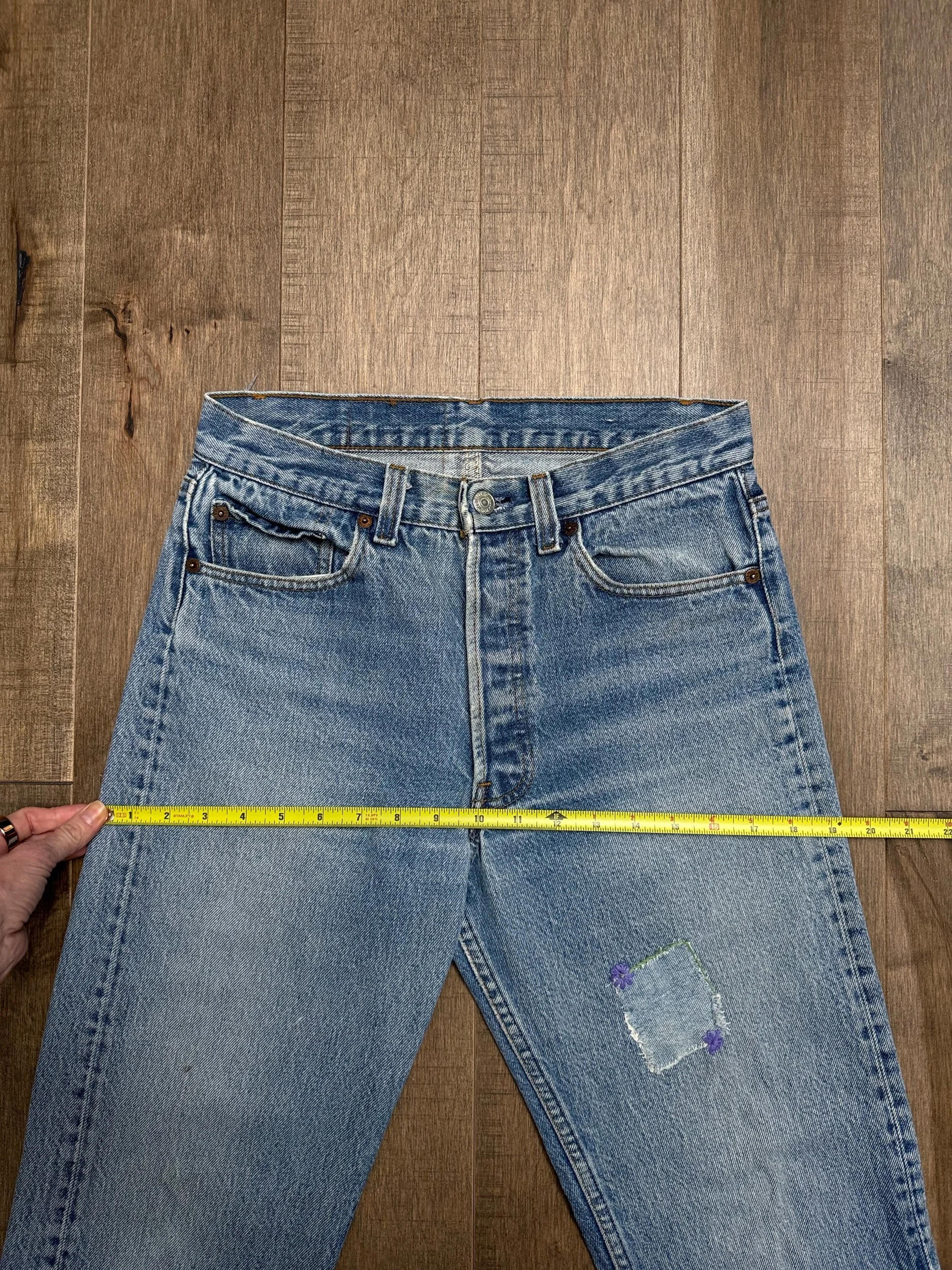 WASH: beautiful light medium blue wash with perfect organic sun fades. Cutest little patch repair. Loop repairs. So good!!