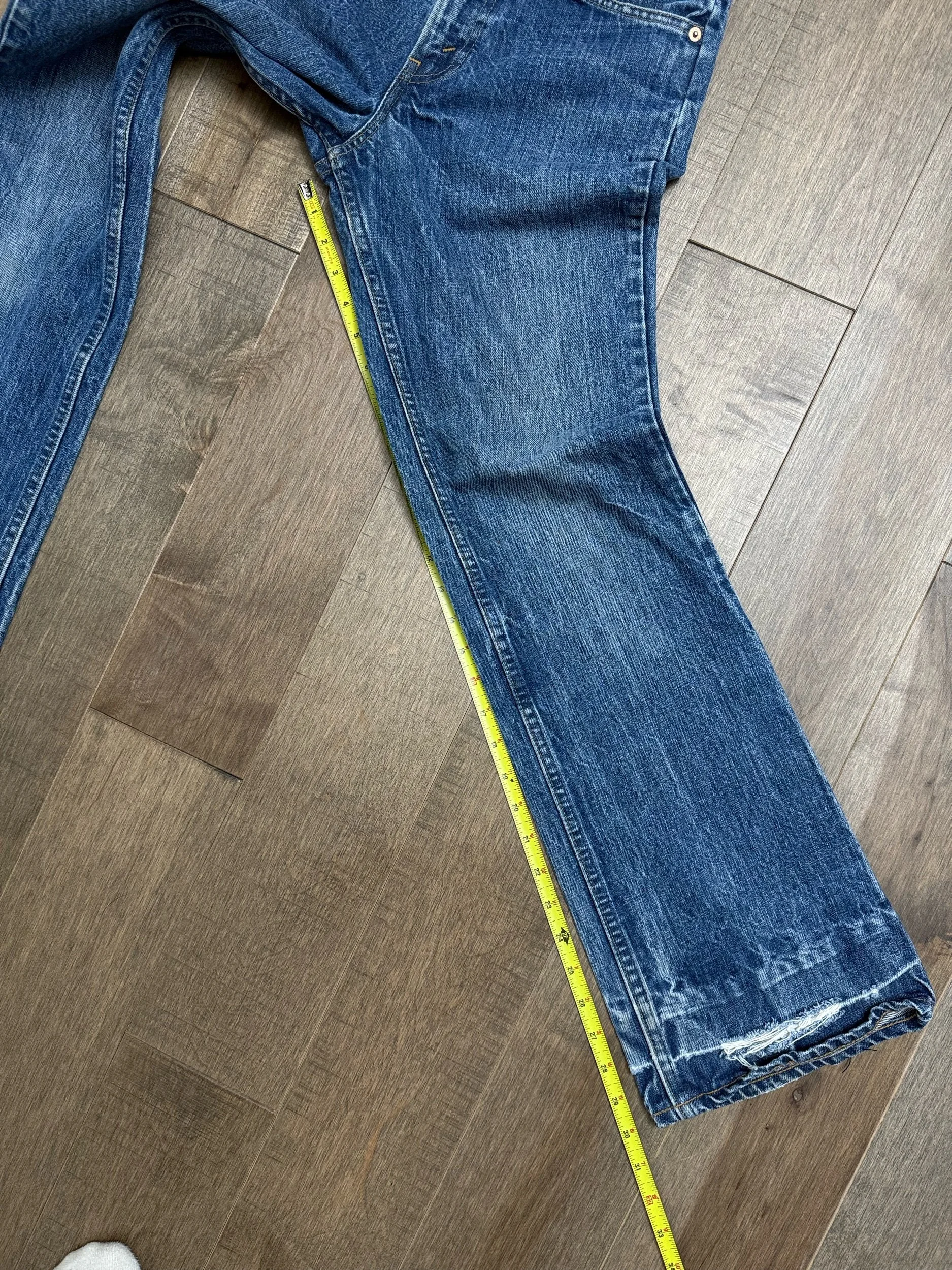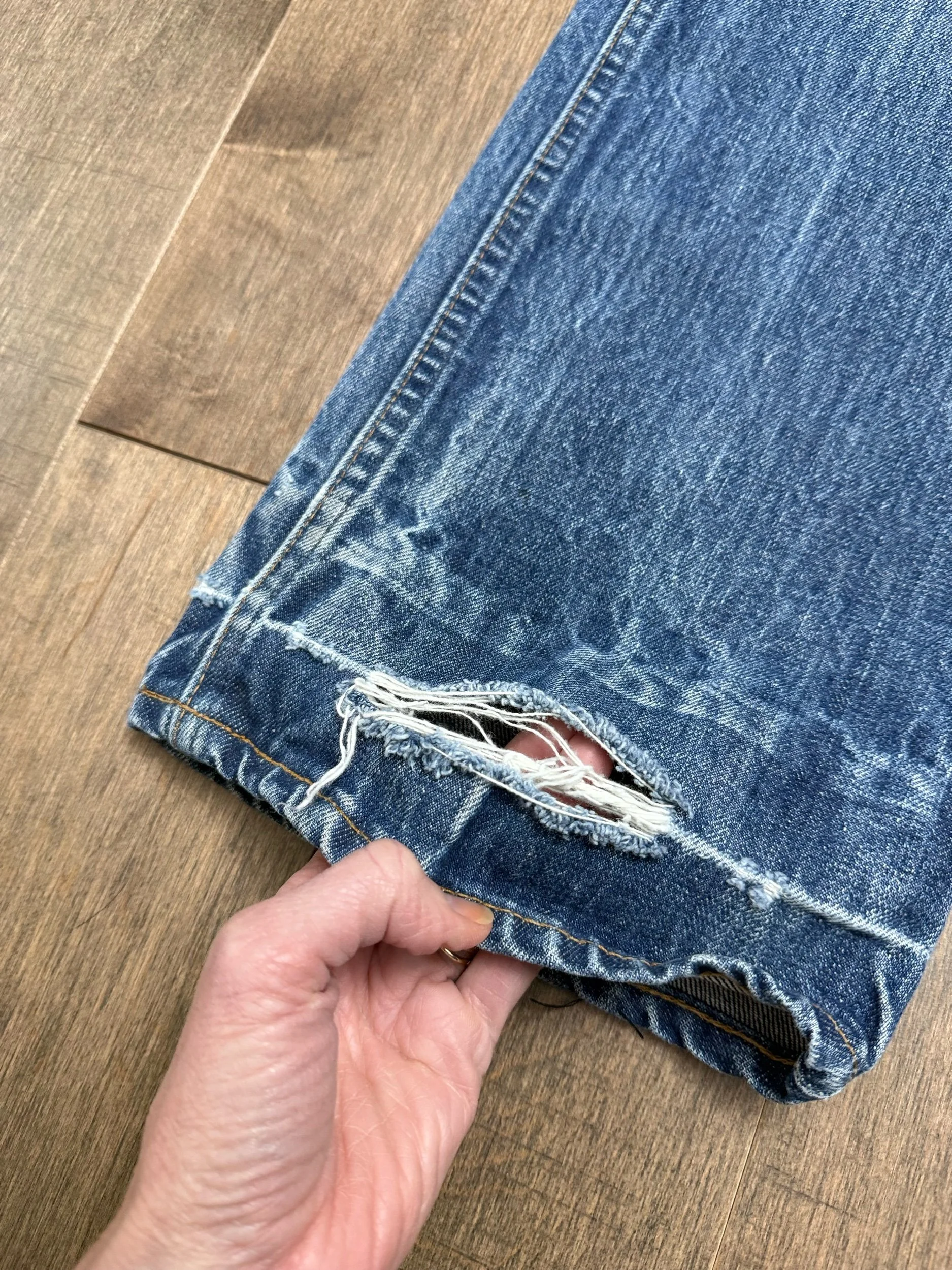 WASH: EPIC indigo blue wash with the most incredible organic sun fades and the coolest hem fades from having them be shortened by folding cuff in and tacking for decades and then released. So freaking FIRE!