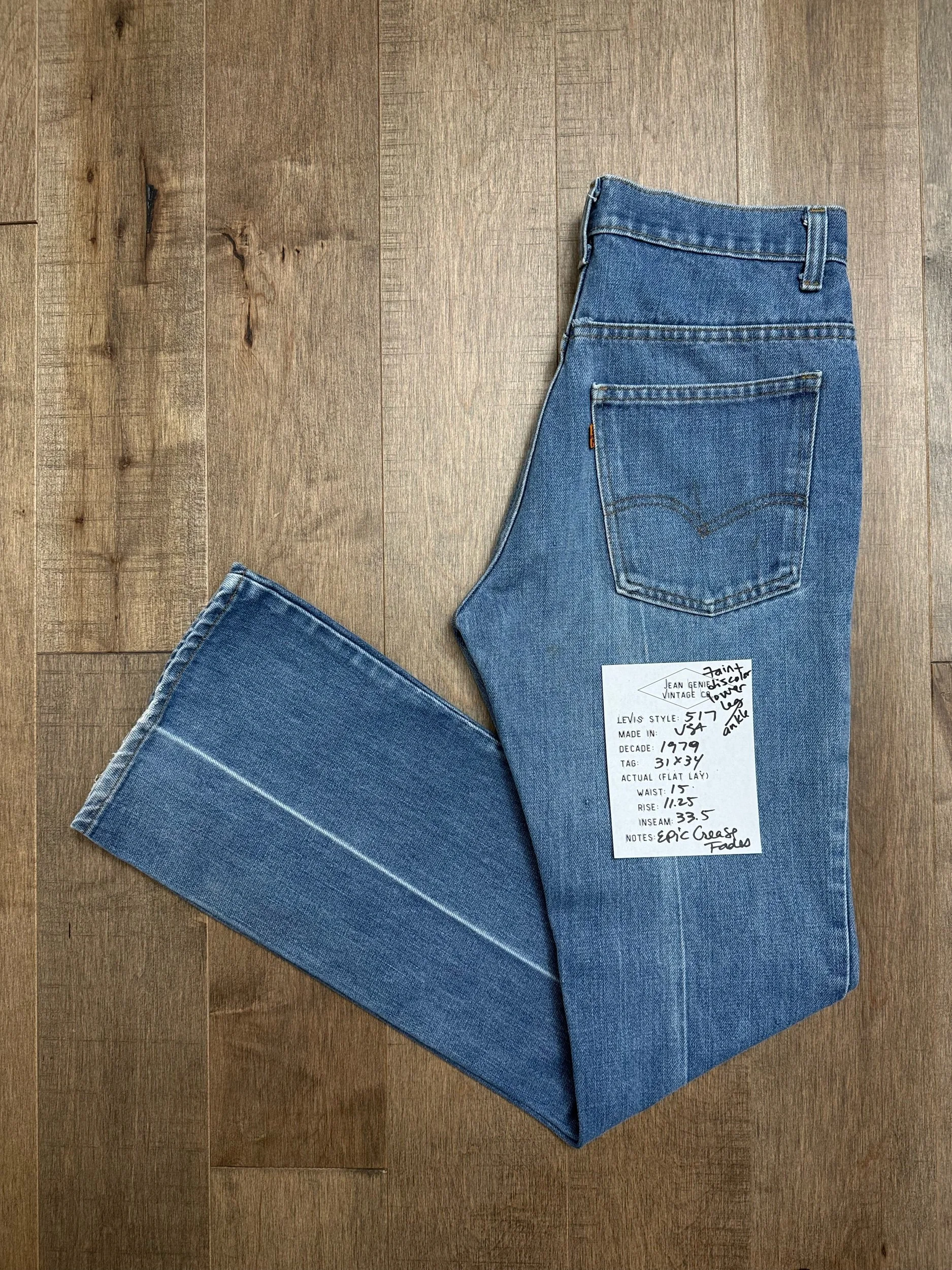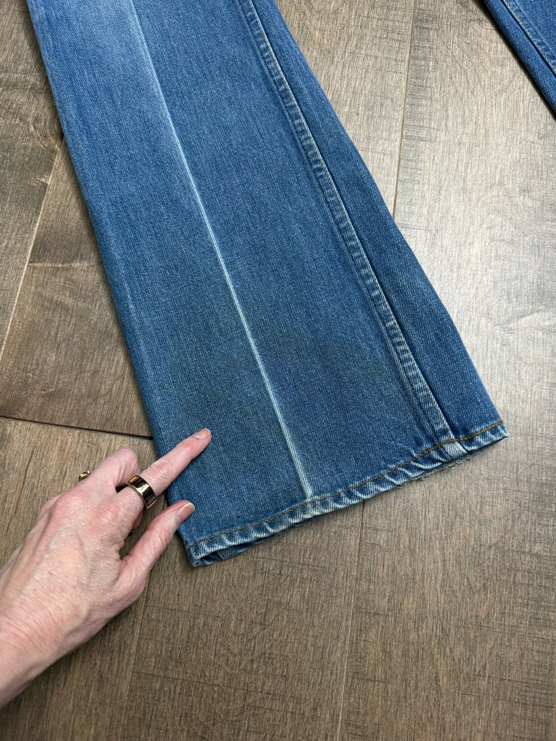 WASH: beautiful lighter blue wash with lovely organic sun fades and perfect iron crease fades. Faint discoloration near the bottoms of the legs, as shown in picture