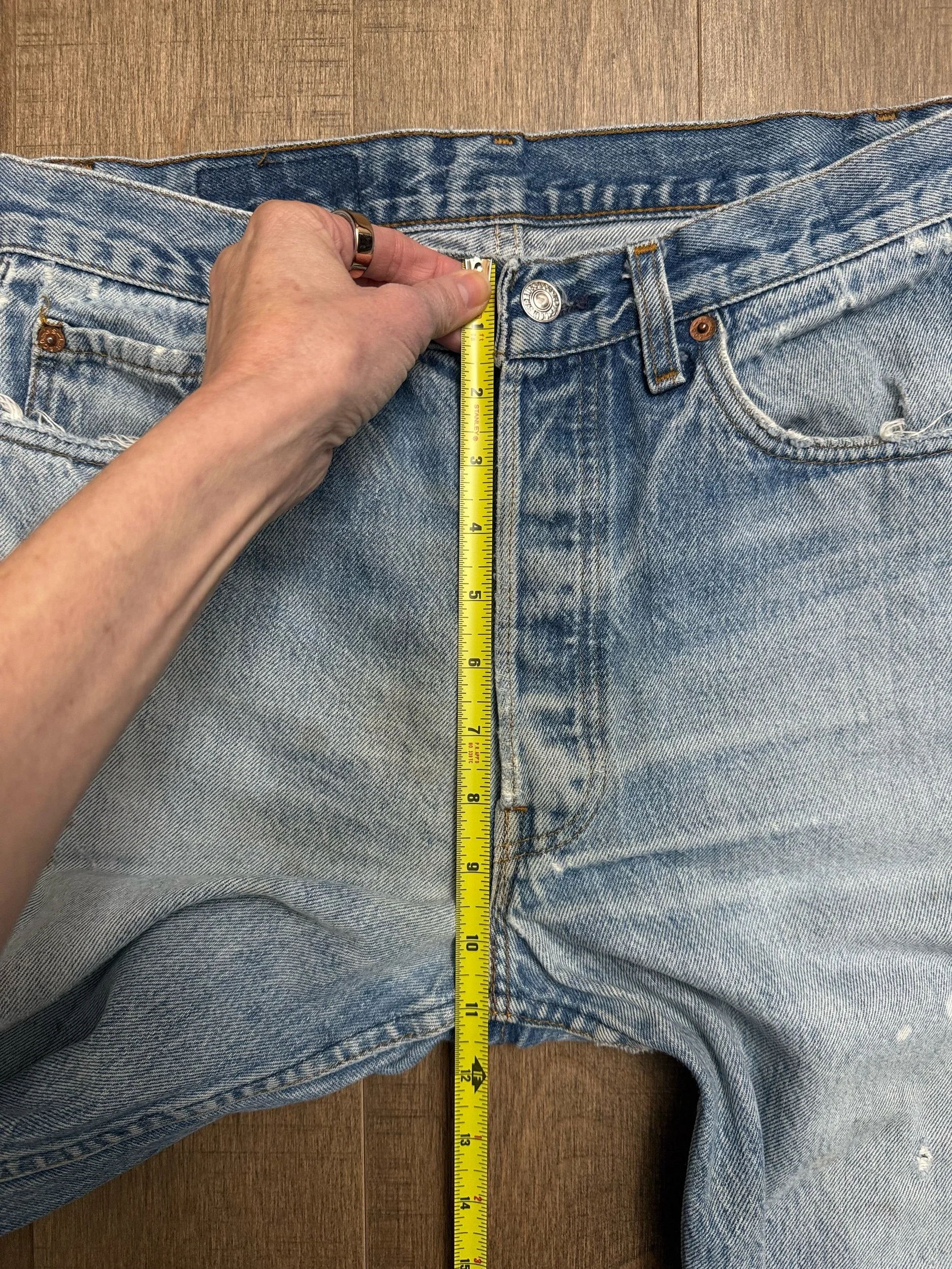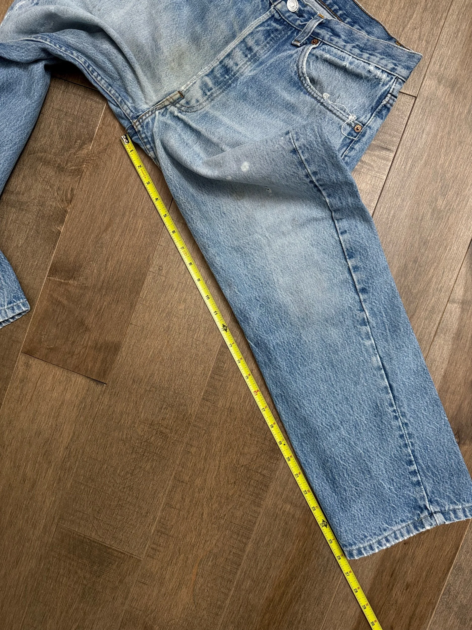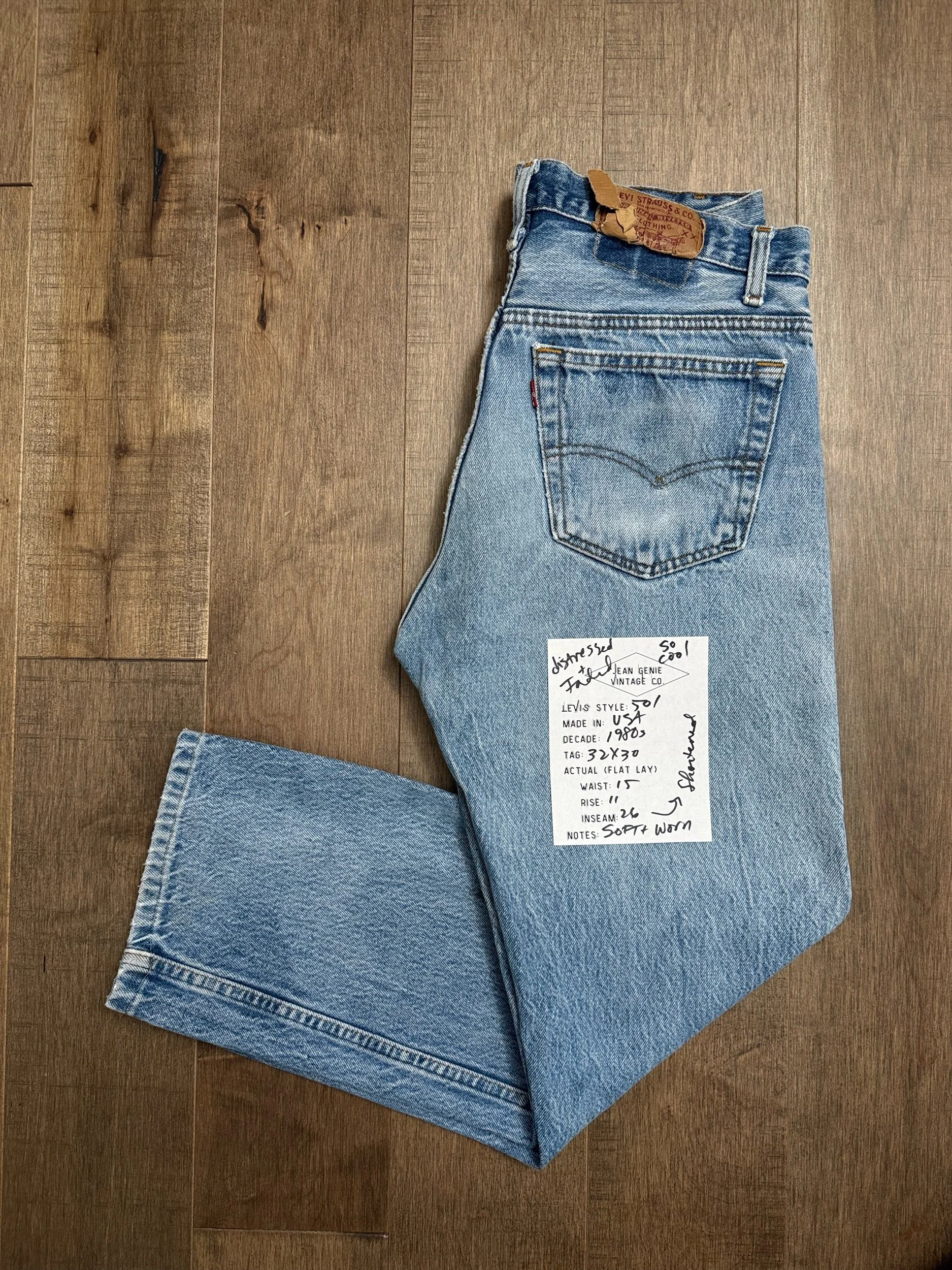 WASH: super cool light medium blue wash with awesome organic sun fades and “slightly dirty” fades you know I love so much! These were shortened decades ago, with natural wear at the the bottoms.