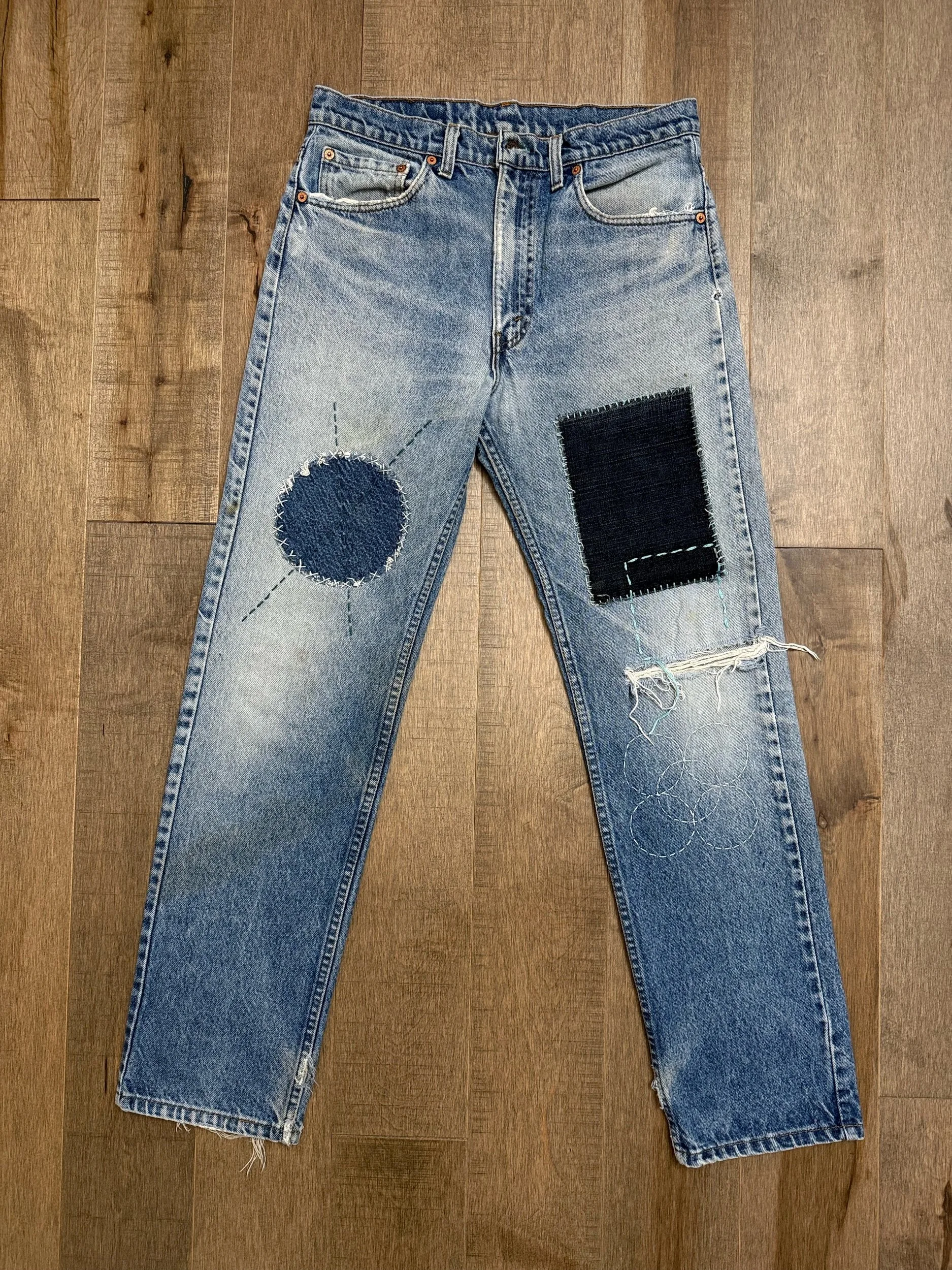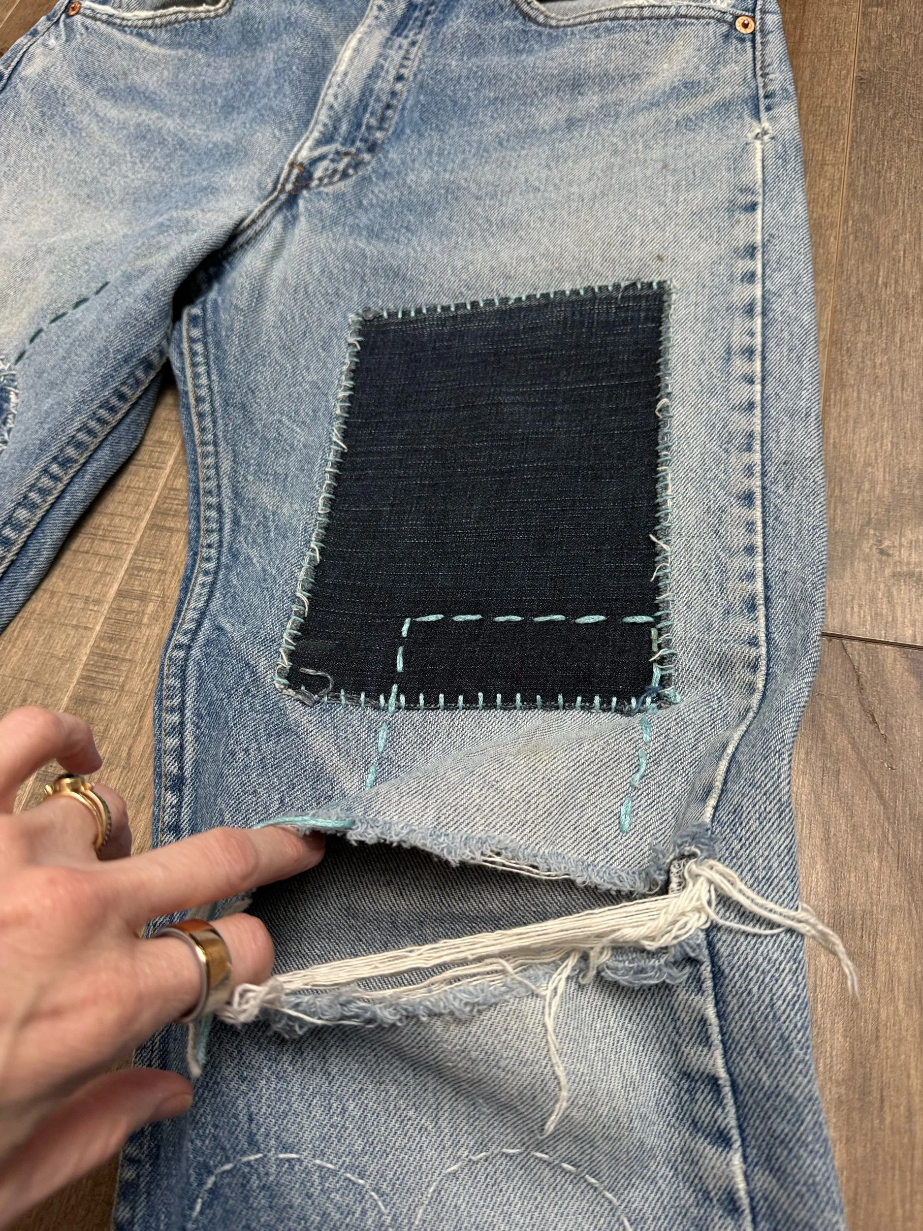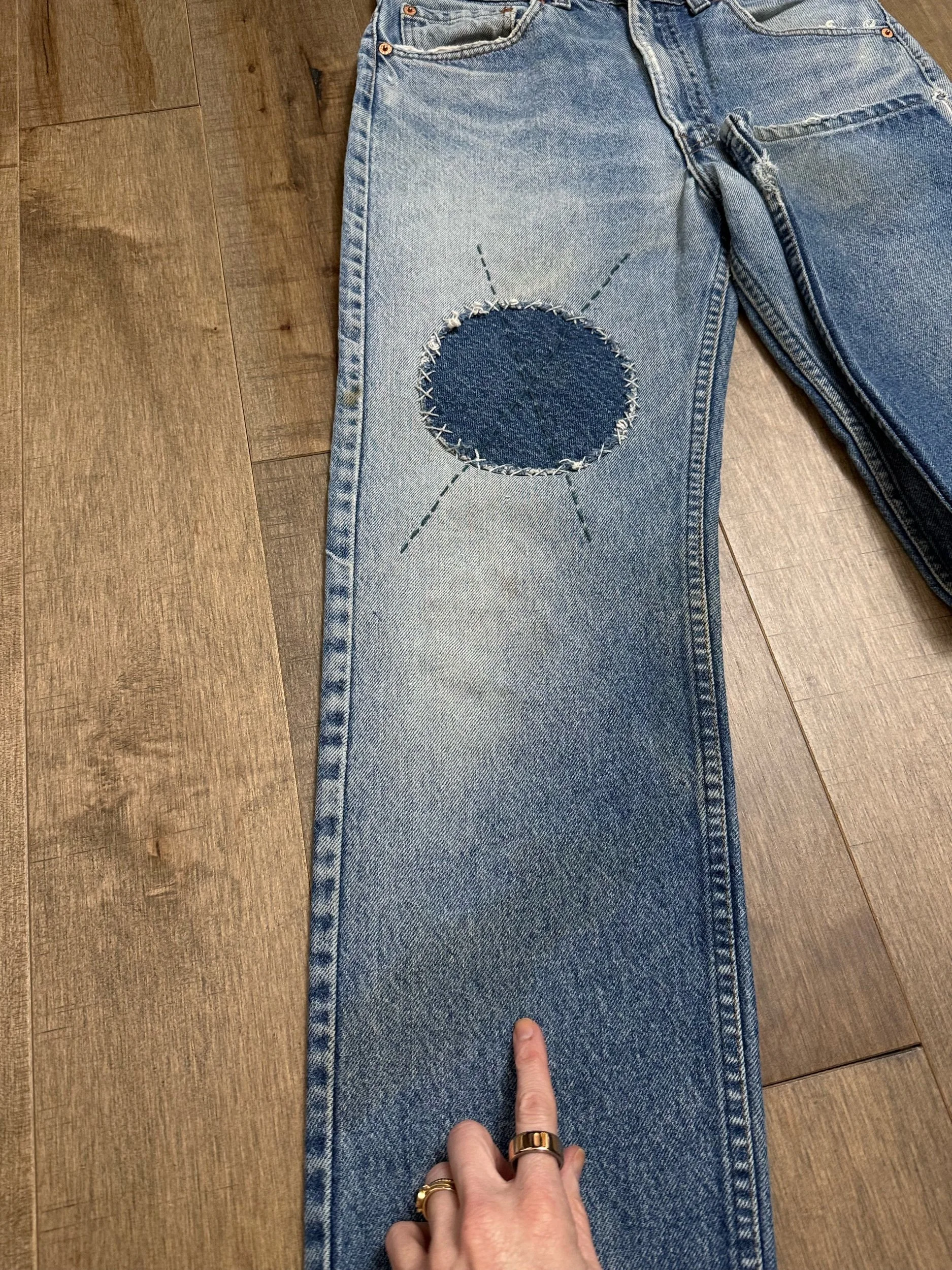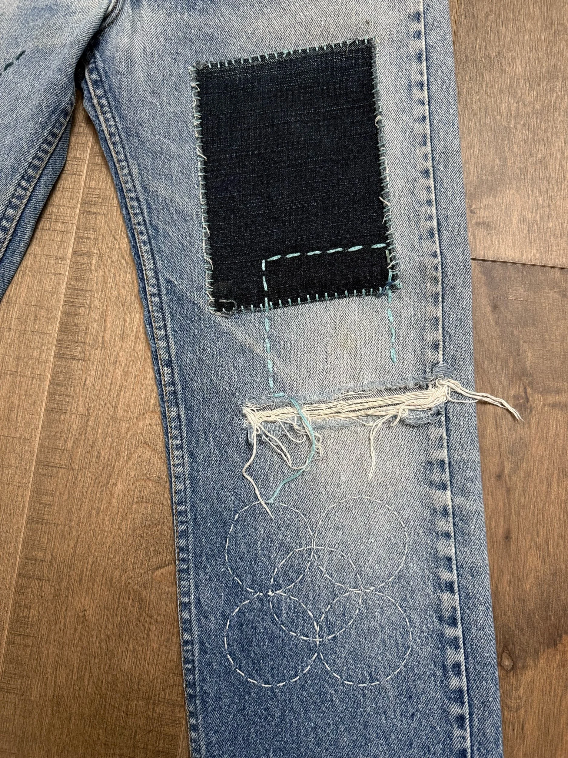 WASH: beautiful sun faded medium blue wash with awesome Sashiko hand mended repairs. Knee rip. Some faint discoloration as shown in pictures. Feels very new Ralph Lauren to me.