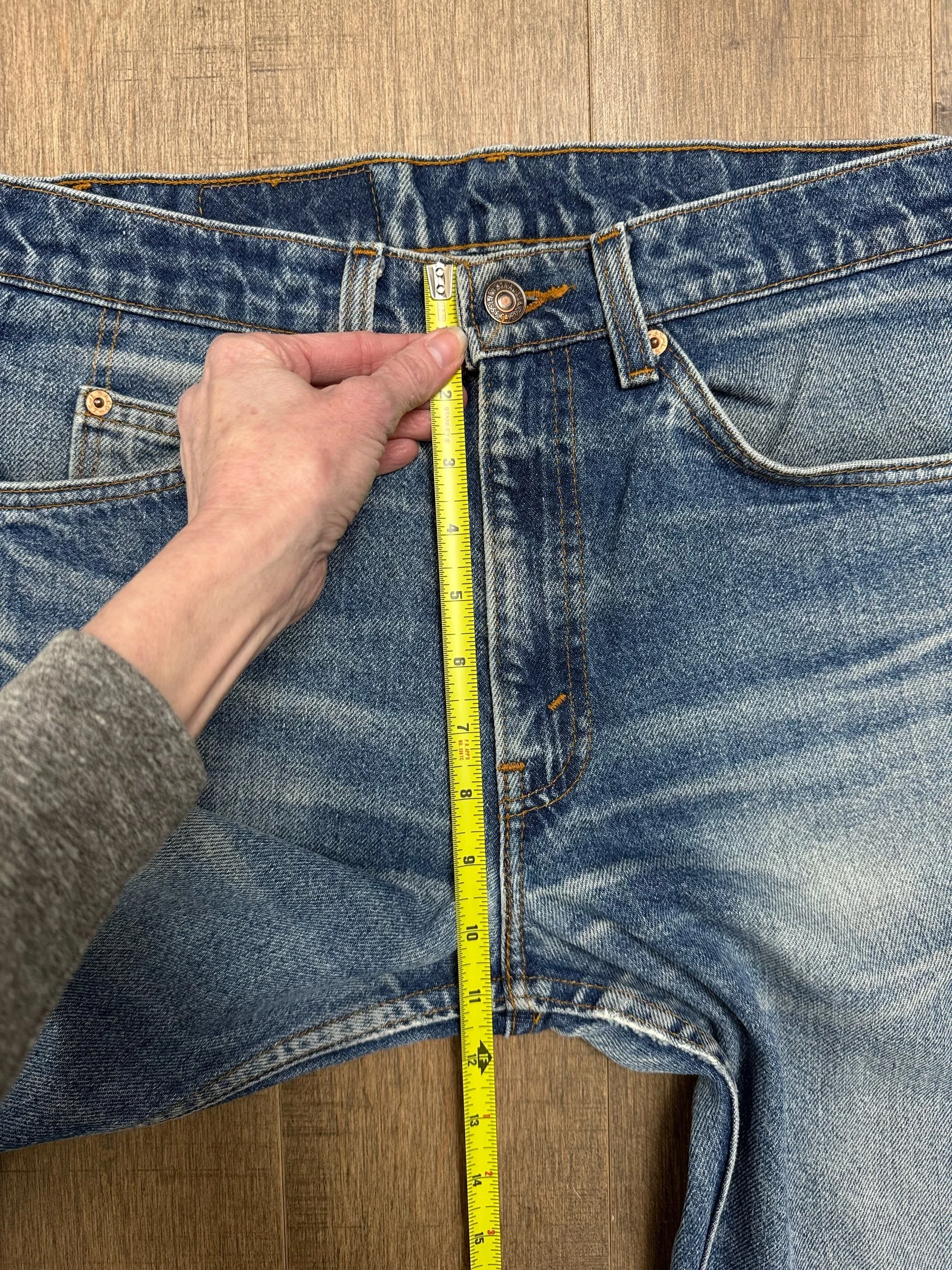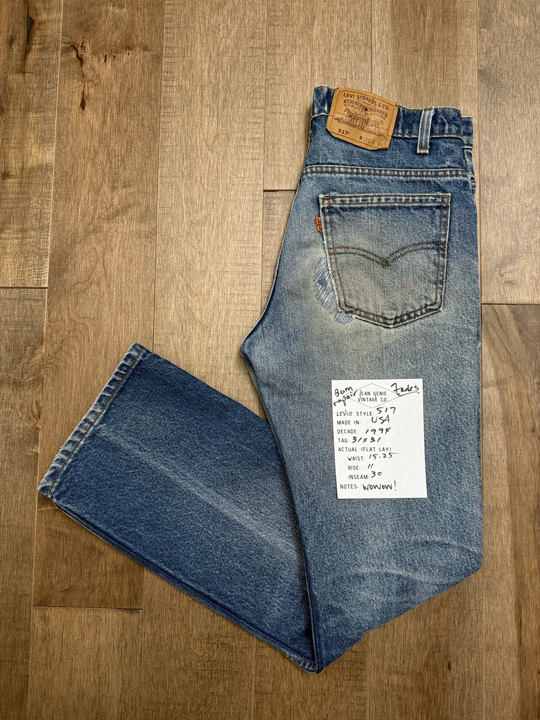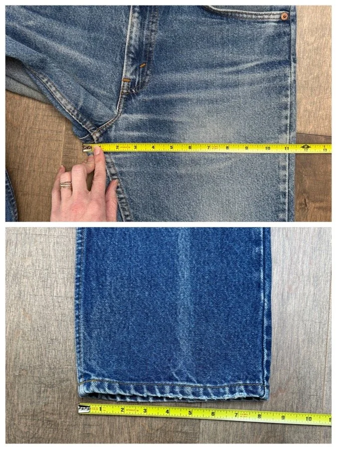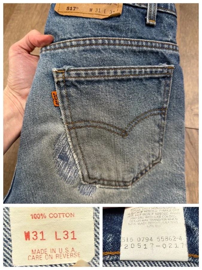 Keep in mind, vintage jeans are not new jeans. Every pair is at least 20 years old, most are older. This means they’ve been worn and likely have signs of wear - i.e. thinning areas, loose threads, signs of previous repair work, discolorations, faint (or not so faint stains), organic distressing, wear at the rivets, wear at the button holes. I do my best to describe these areas/signs of wear&tear, so please - before you buy - understand that you may receive your jeans and there will be signs of aging. Most buy vintage jeans wanting this, but if you want pristine new looking jeans, vintage likely isn’t for you. And that’s A-OK! Also note, the word “vintage” is not synonymous with super worn & faded. Vintage means over 20 years old. An item can be both vintage and still be new or like new condition.