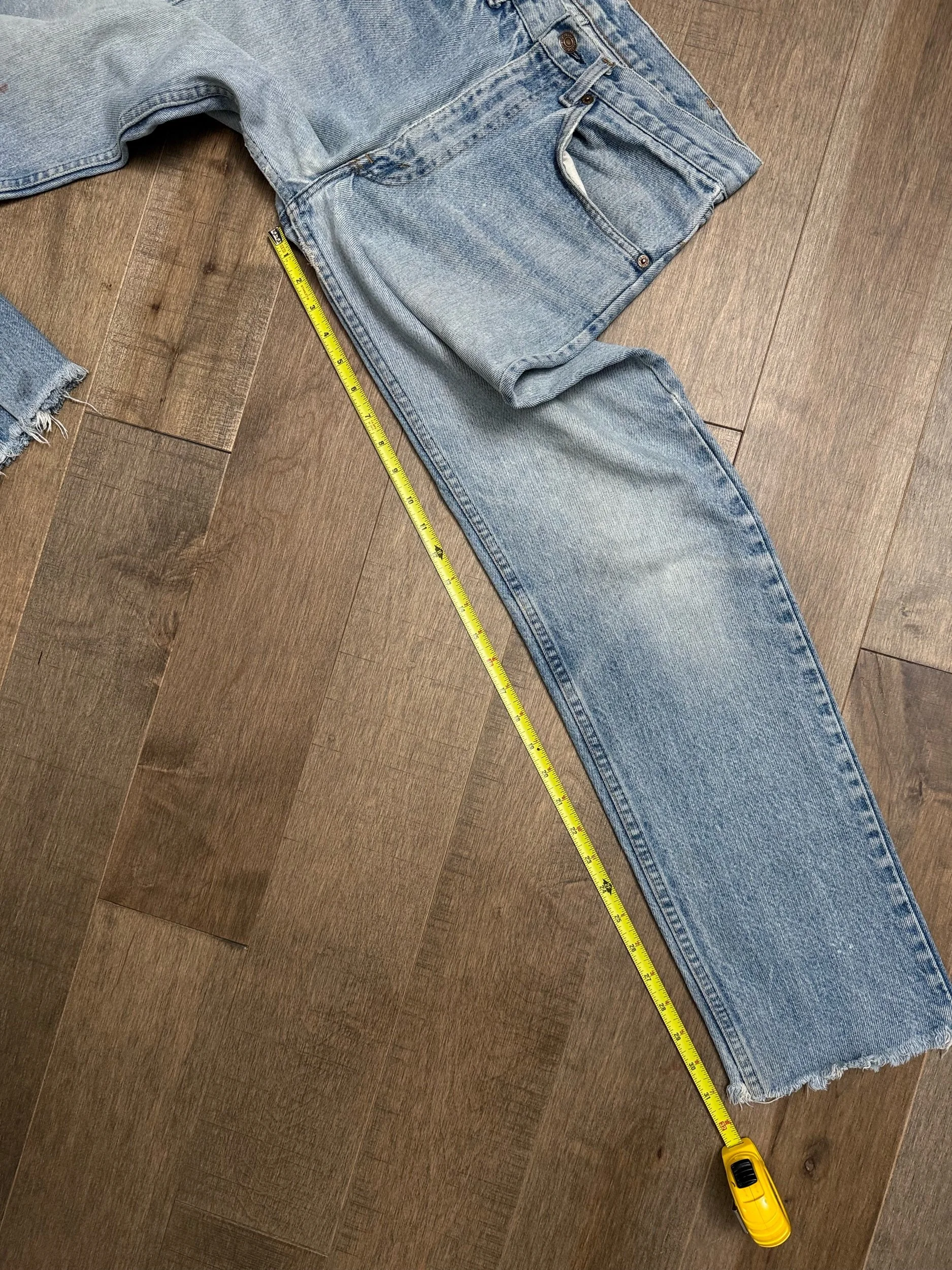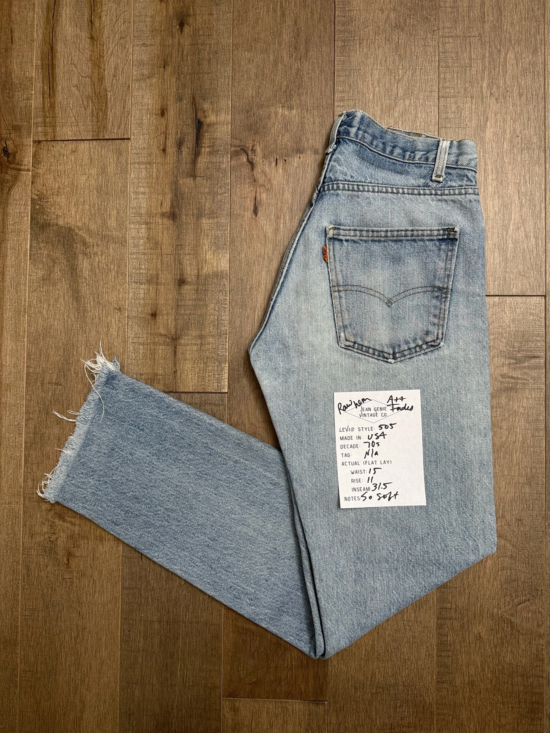 WASH: stunning light blue wash with awesome organic sun fades, raw hem. So soft! Repair to back belt loop.