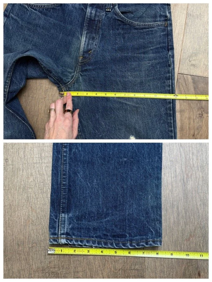 Keep in mind, vintage jeans are not new jeans. Every pair is at least 20 years old, most are older. This means they’ve been worn and likely have signs of wear - i.e. thinning areas, loose threads, signs of previous repair work, discolorations, faint (or not so faint stains), organic distressing, wear at the rivets, wear at the button holes. I do my best to describe these areas/signs of wear&tear, so please - before you buy - understand that you may receive your jeans and there will be signs of aging. Most buy vintage jeans wanting this, but if you want pristine new looking jeans, vintage likely isn’t for you. And that’s A-OK! Also note, the word “vintage” is not synonymous with super worn & faded. Vintage means over 20 years old. An item can be both vintage and still be new or like new condition.