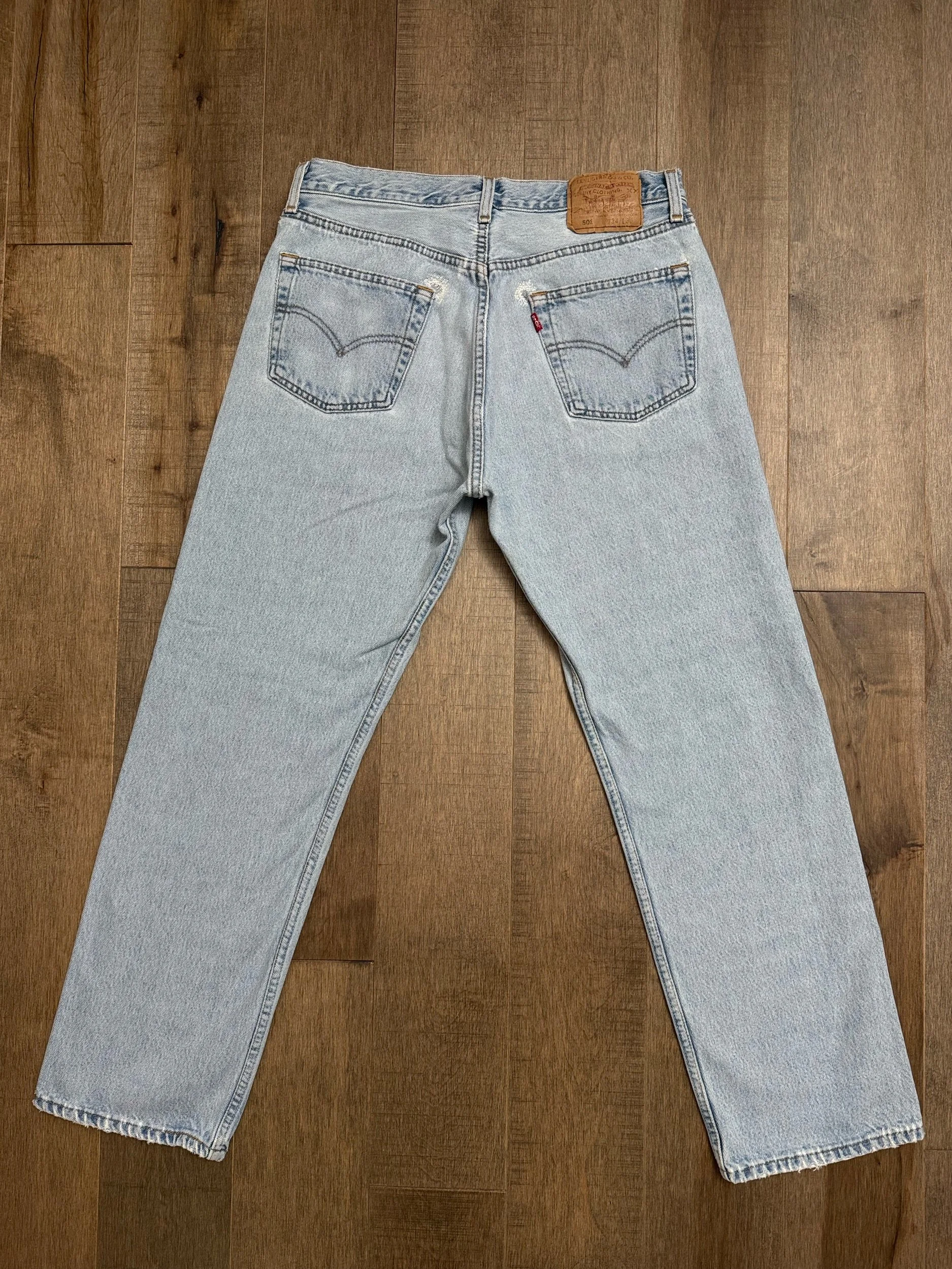 WASH: beautiful light blue wash with lovely subtle sun fades. Little repairs at back pocket, ribs, and near the bottom of the fly.